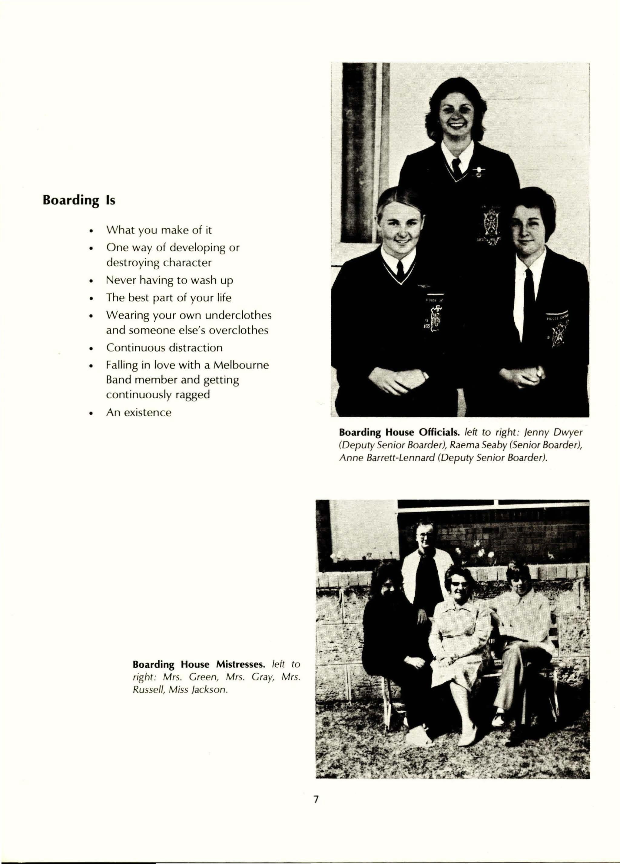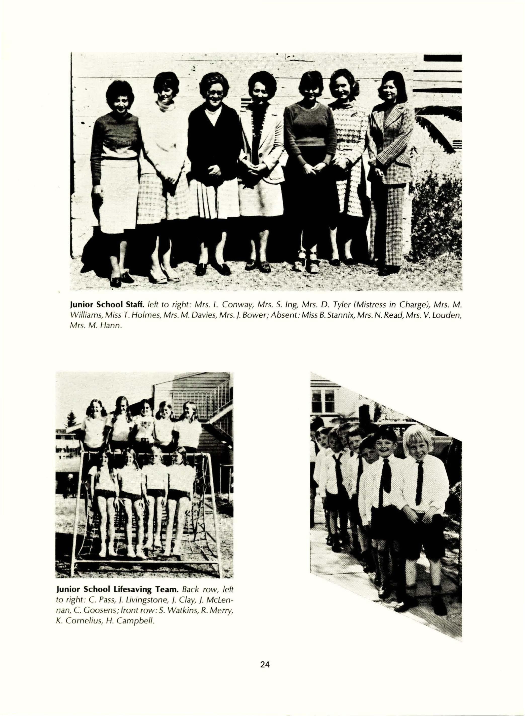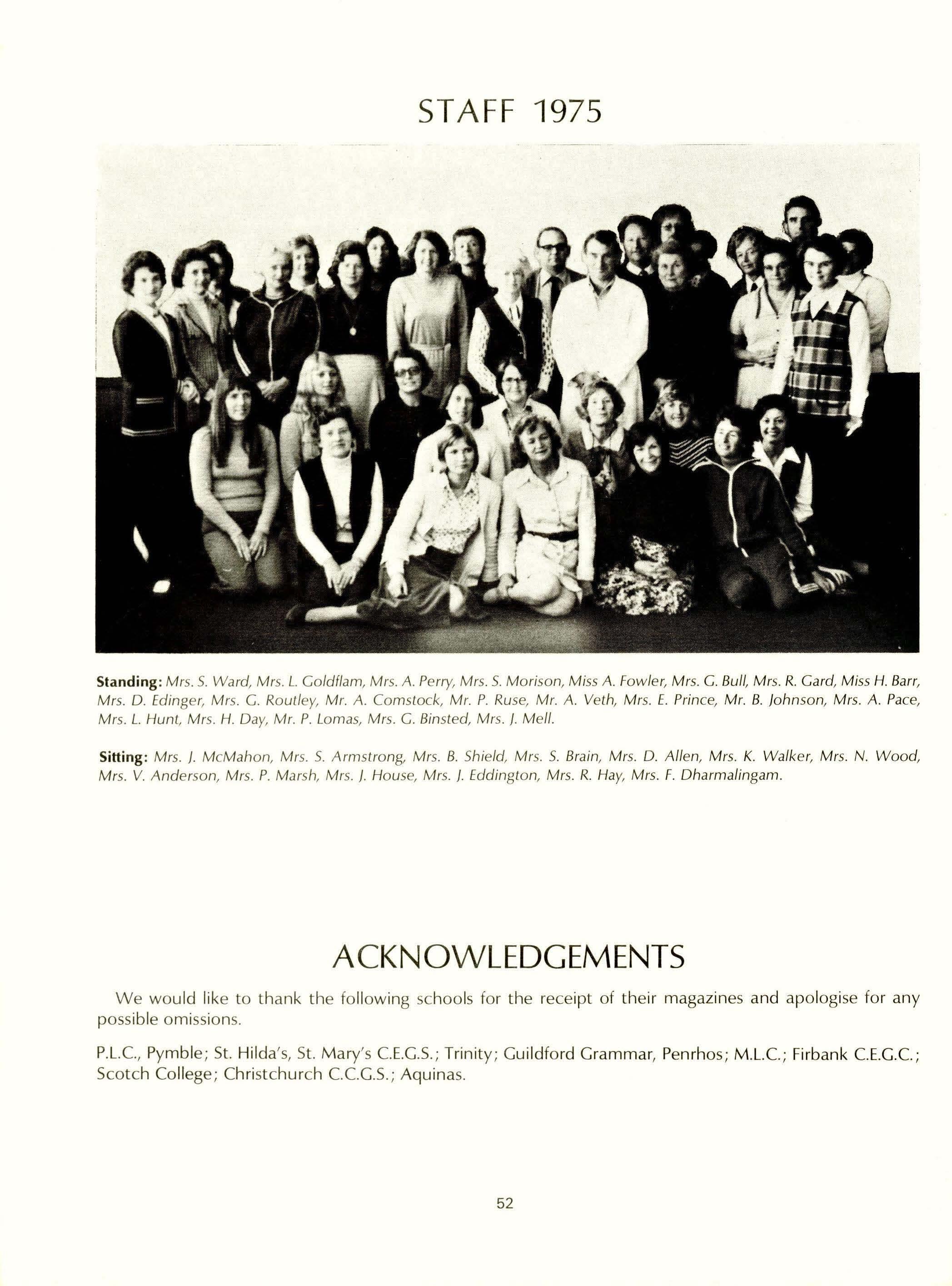 Full-time Staff: Mrs. H. Day, BA, Dip.Ed., L.Mus., L.T.CL., AASA, MACE. (Senior Mistress); Mrs. G. Binsted, B.Se. (Econ.), Dip.Ed.; Mrs. S. Armstrong, BA, Dip.Ed.; Mrs. D. Anderson, (TC); Mrs. S. Brain, BA, Dip.Ed.; Mrs. G. Bull (T.C) Dip. Home Se.; Mrs. D. Allan (T.C) Diploma of Teaching; Mrs. J. D'Cruz, BA (Maths), B.Ed.; Mrs. F. Dharmalingam, BA,