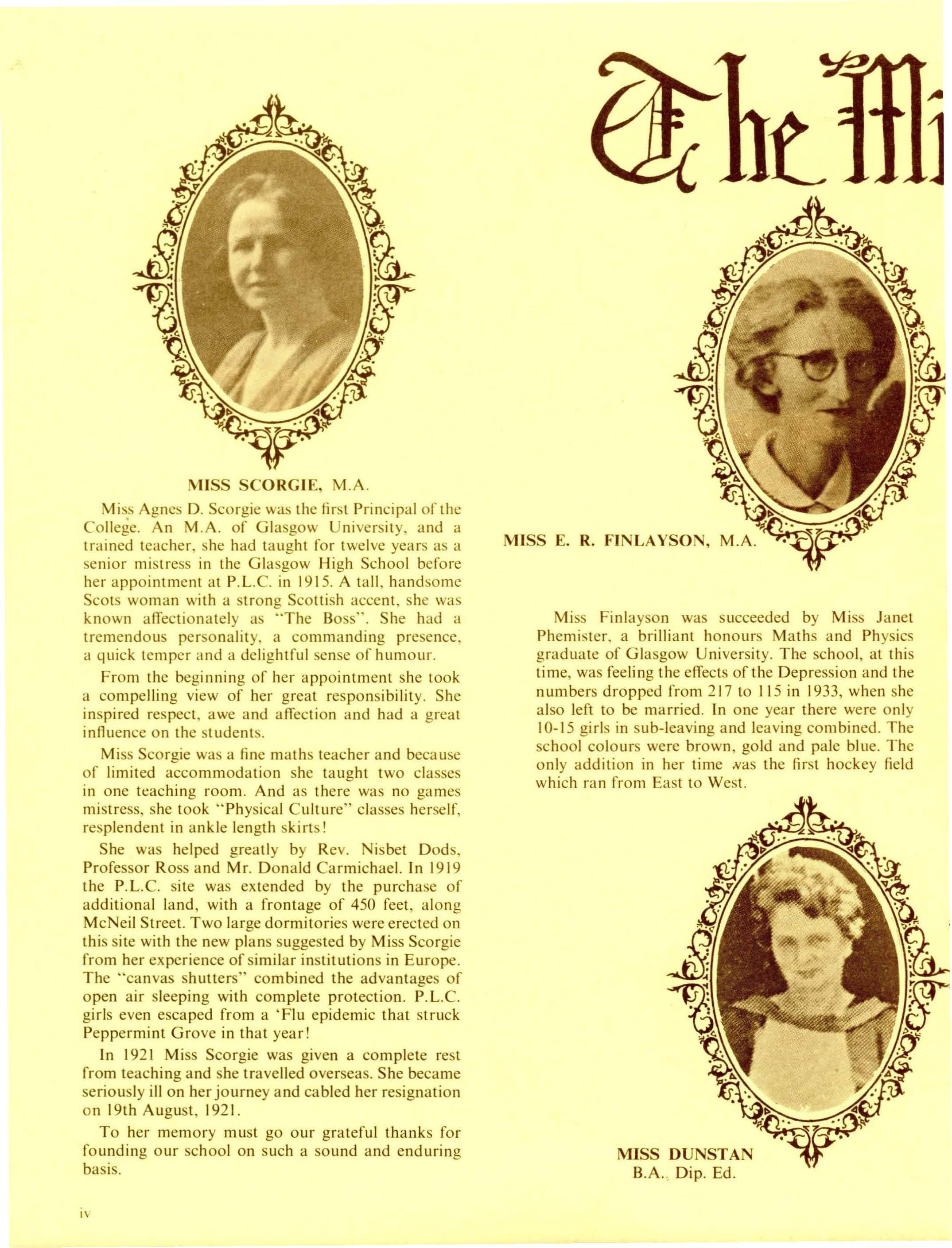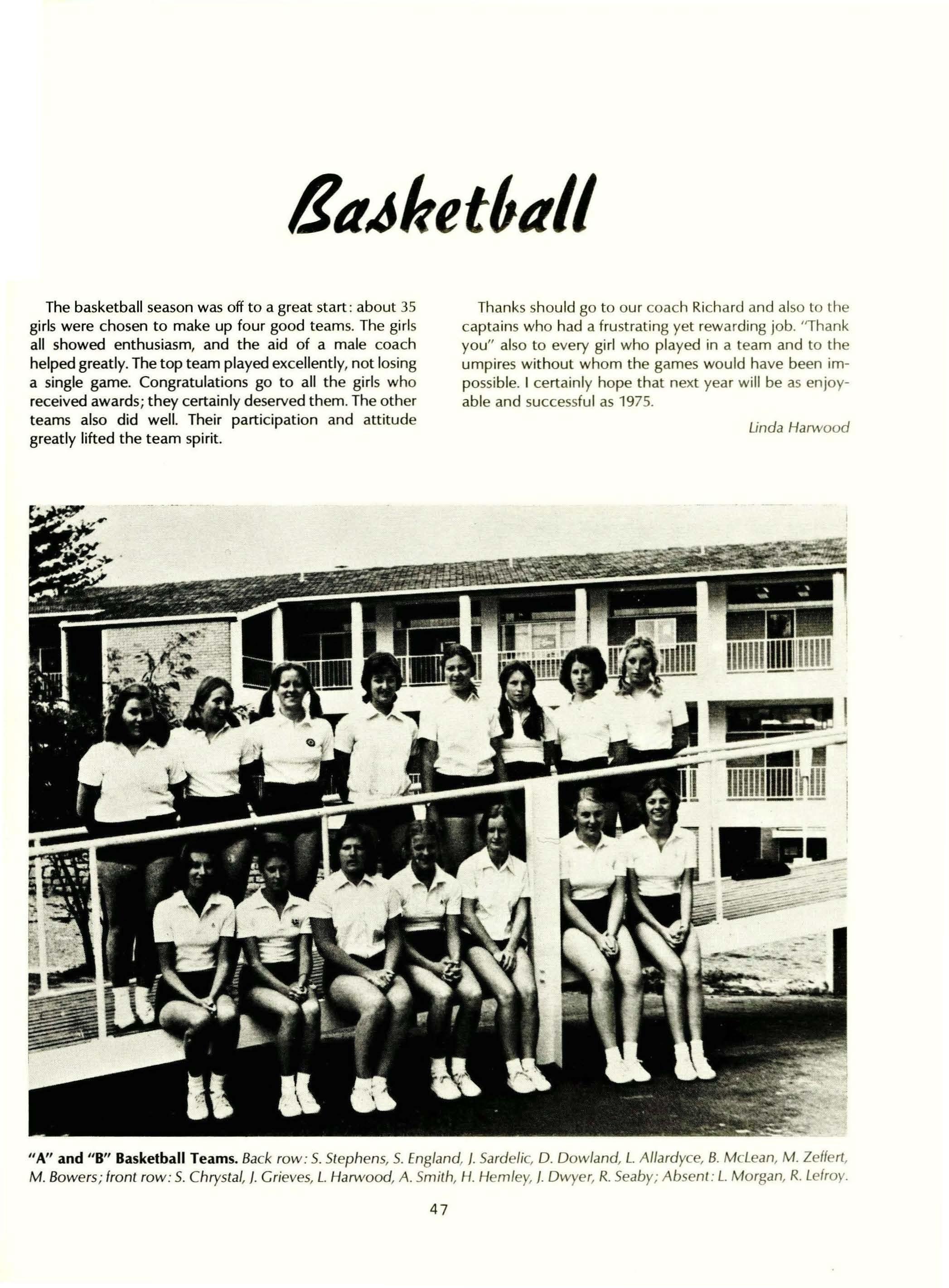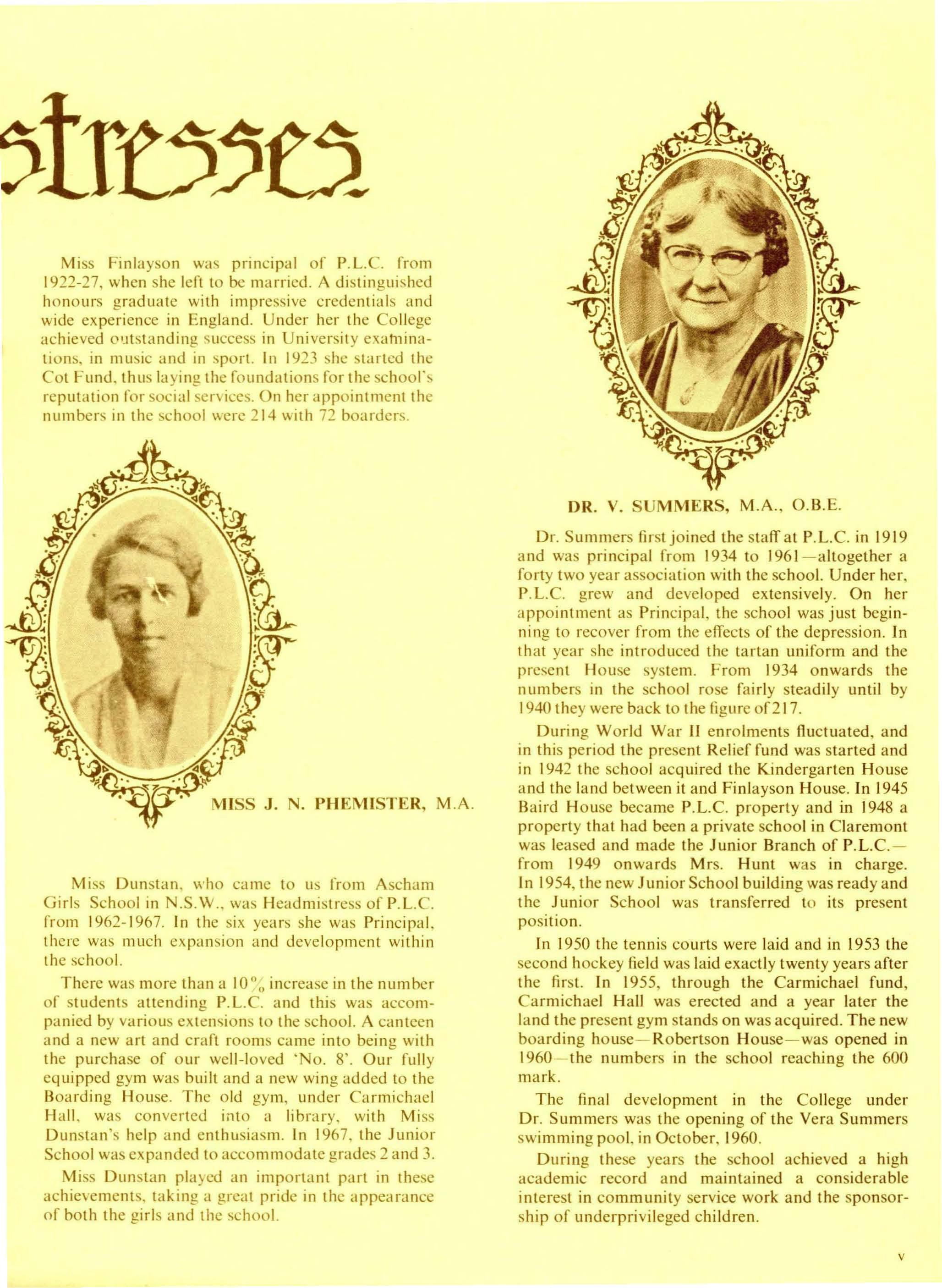 Full-time Staff: Mrs. H. Day, BA, Dip.Ed., L.Mus., L.T.CL., AASA, MACE. (Senior Mistress); Mrs. G. Binsted, B.Se. (Econ.), Dip.Ed.; Mrs. S. Armstrong, BA, Dip.Ed.; Mrs. D. Anderson, (TC); Mrs. S. Brain, BA, Dip.Ed.; Mrs. G. Bull (T.C) Dip. Home Se.; Mrs. D. Allan (T.C) Diploma of Teaching; Mrs. J. D'Cruz, BA (Maths), B.Ed.; Mrs. F. Dharmalingam, BA,