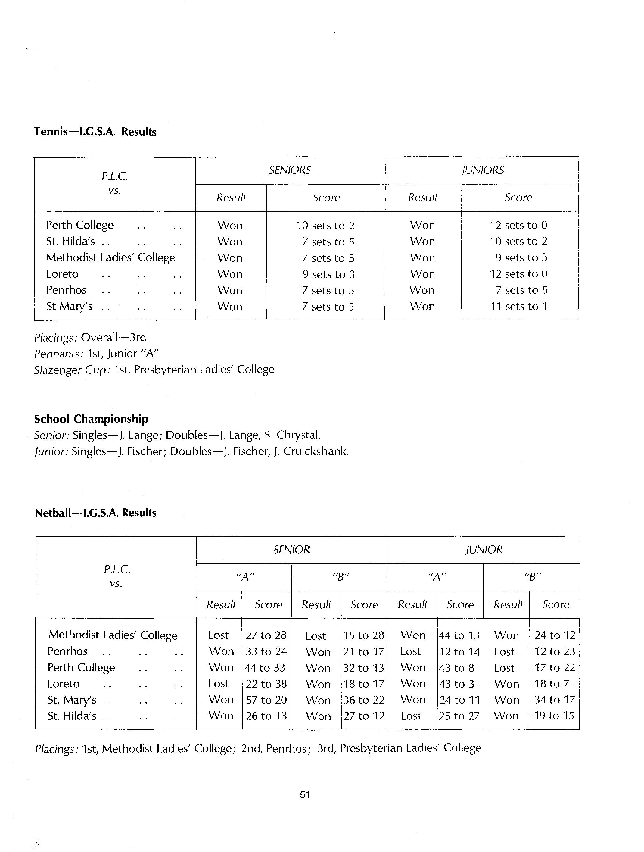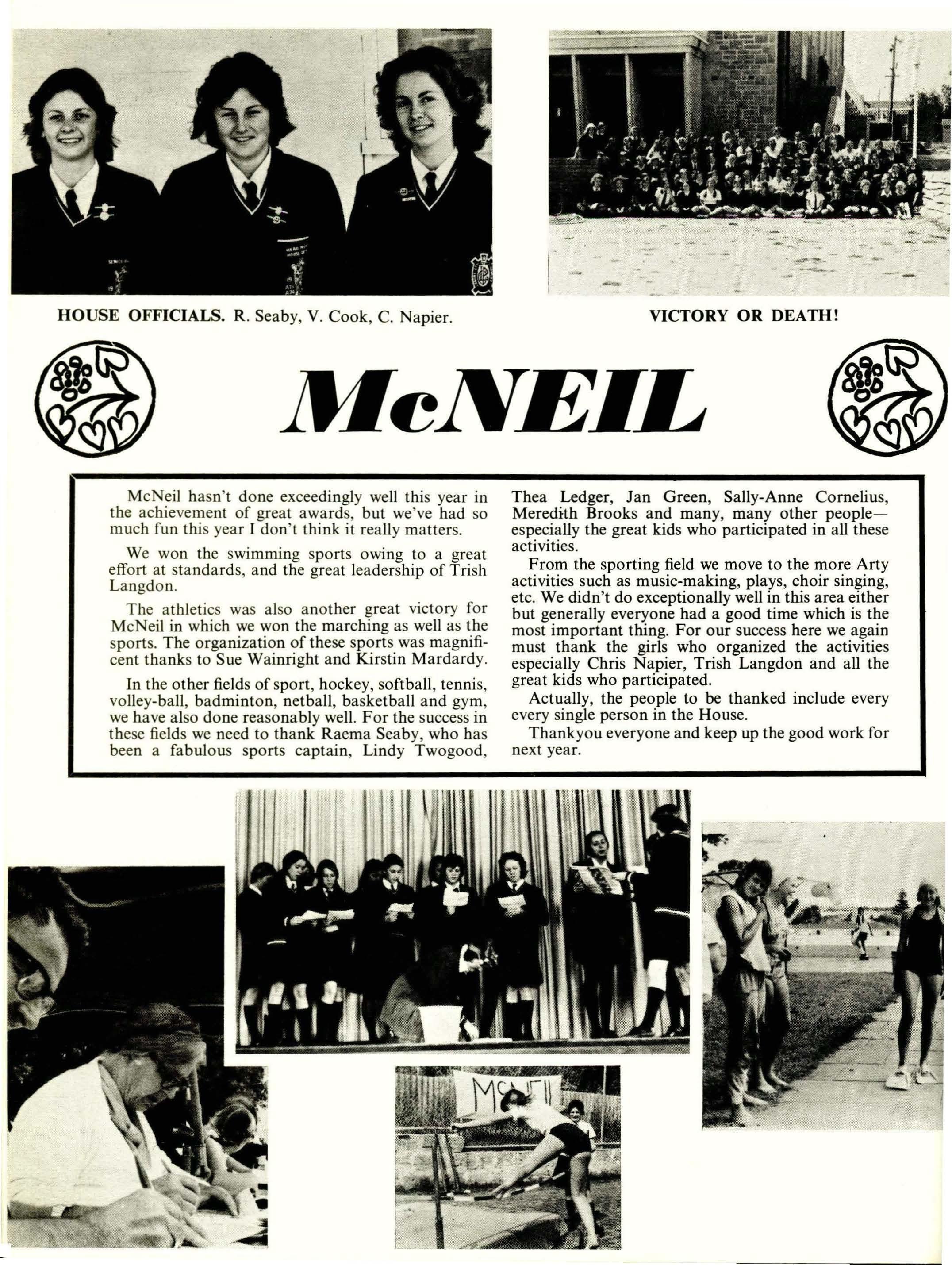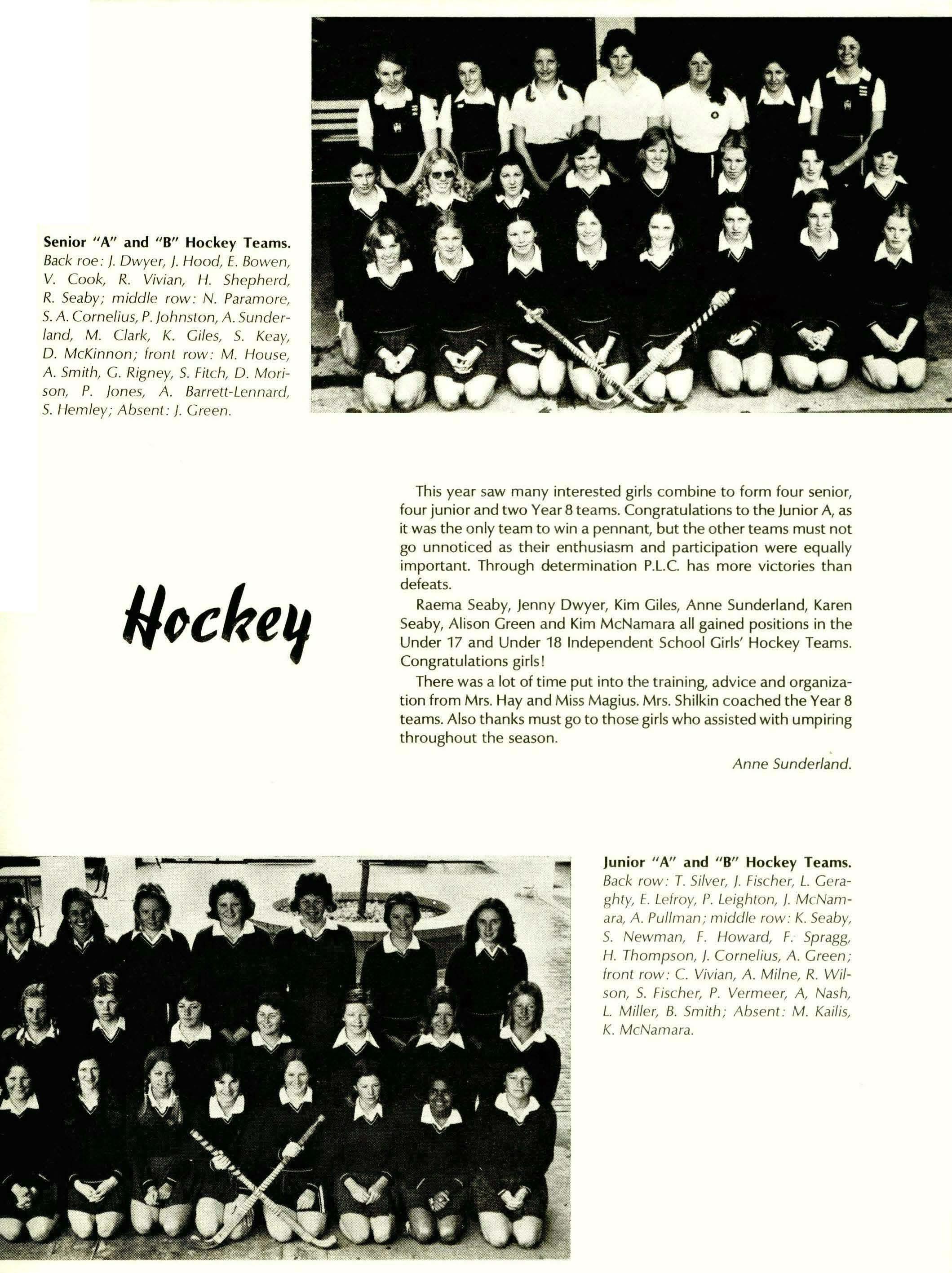 In the other fields of sport, hockey, softball, tennis, volley-ball, badminton, netball, basketball and gym, we have also done reasonably well. For the success in these fields we need to thank Raema Seaby, who has been a fabulous sports captain, Lindy Twogood,