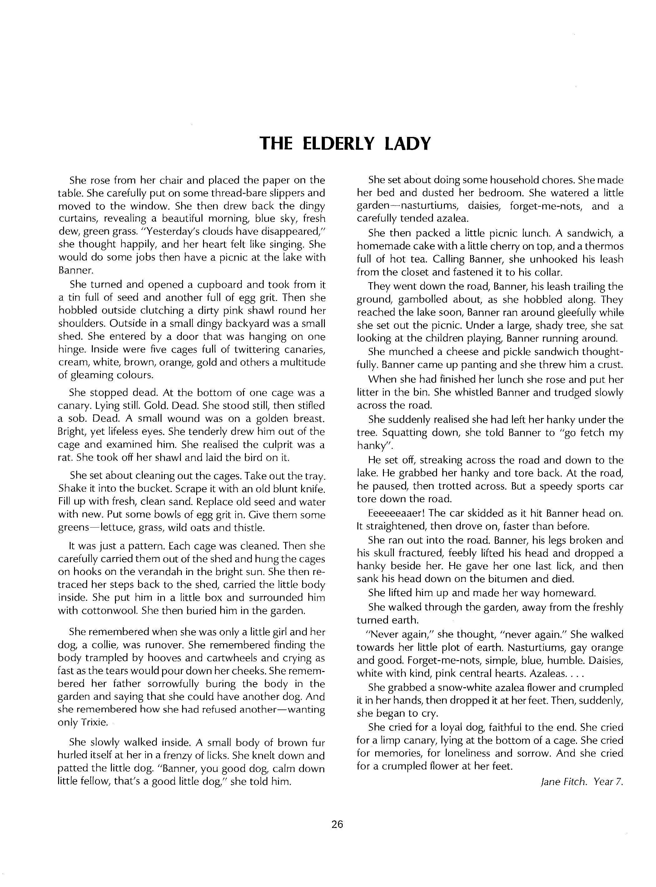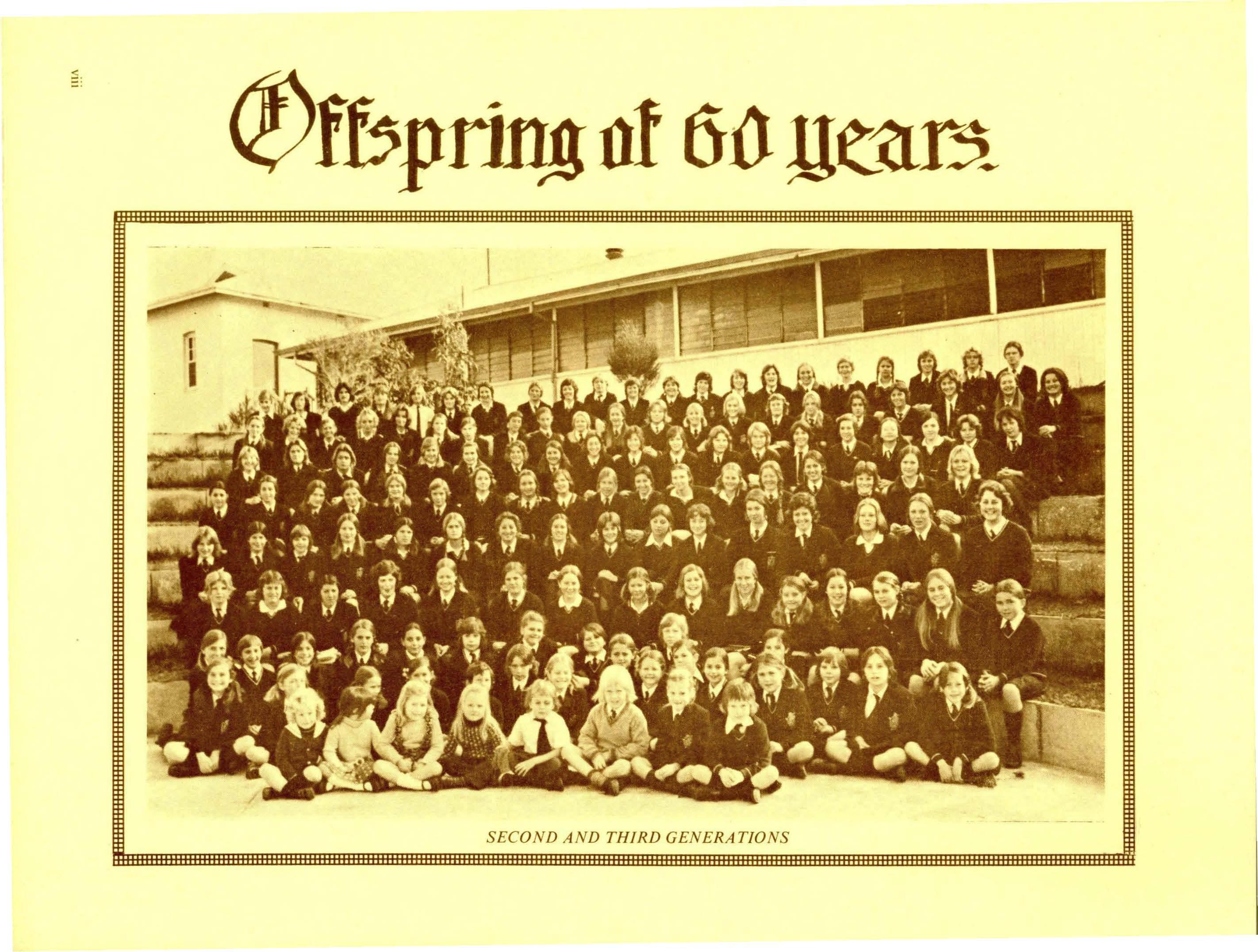 Thanks go to Mrs. Aurelie'Yeo who painted and presented to the school a sympathetic portrait of Dr. Summers, which reflects the perceptiveness coming from close contact over many years. This was visible as a backdrop to the Official Party which included 'old' girls and young girls. Miss Barr, Mrs. Craig and Mrs. Yeo represented those girls who spent their youth in the cold, draughty, wooden buildings to which not many of us are still subjected. The Head Prefect Bronwyn Bamford and two fourth-year girls, Megan Clark and jenny Vuletic, impressively represented today's potential. Megan was selected to attend the International Science School at Sydney University during the August holidays, while jenny visited Hong Kong as her prize for winning the joint Commonwealth Societies' Public speaking Competition for fourth-year students. Certainly, the tales they told of their experiences rarely pertained to Academia! but were enjoyed by both parents and girls.