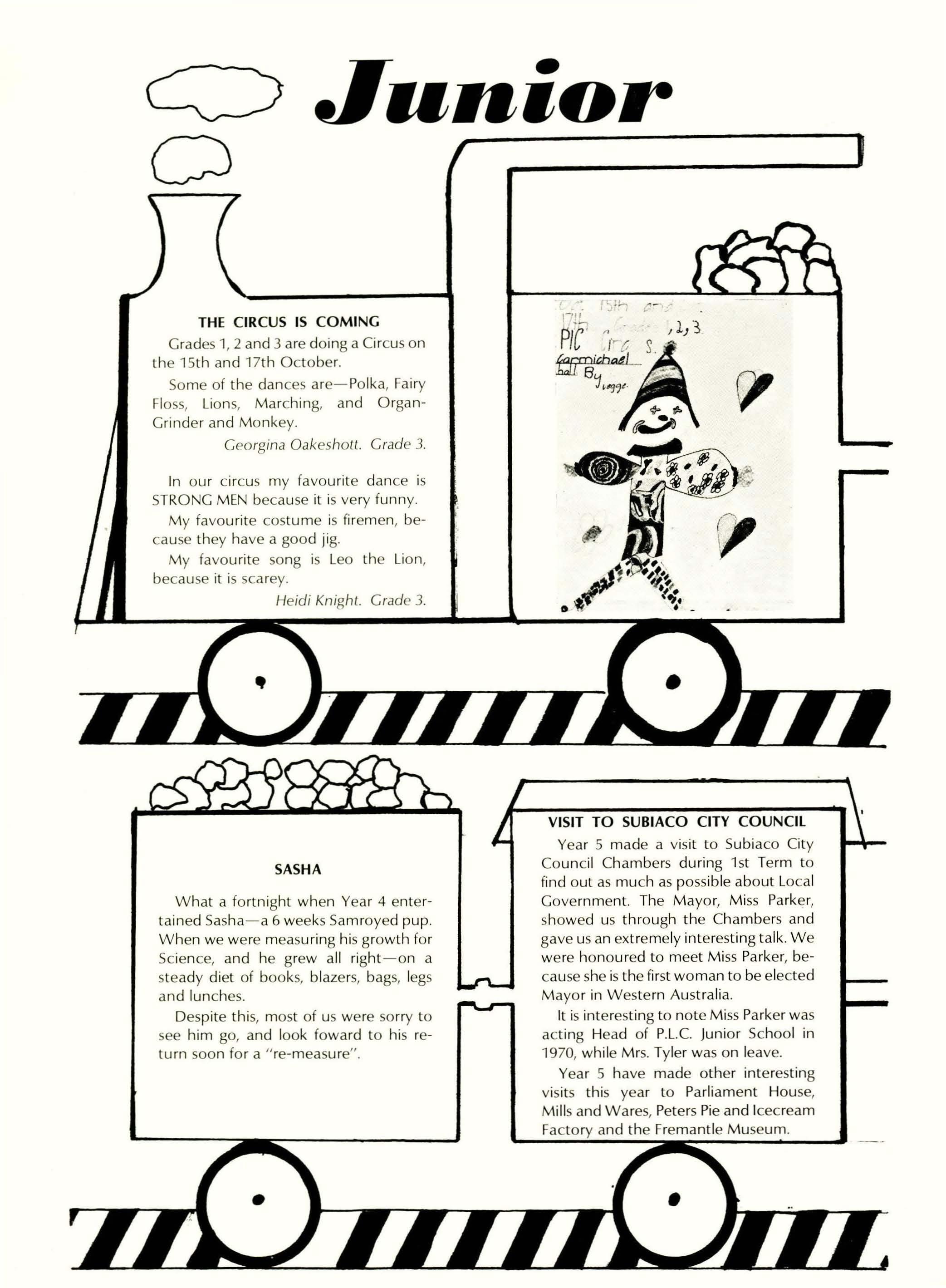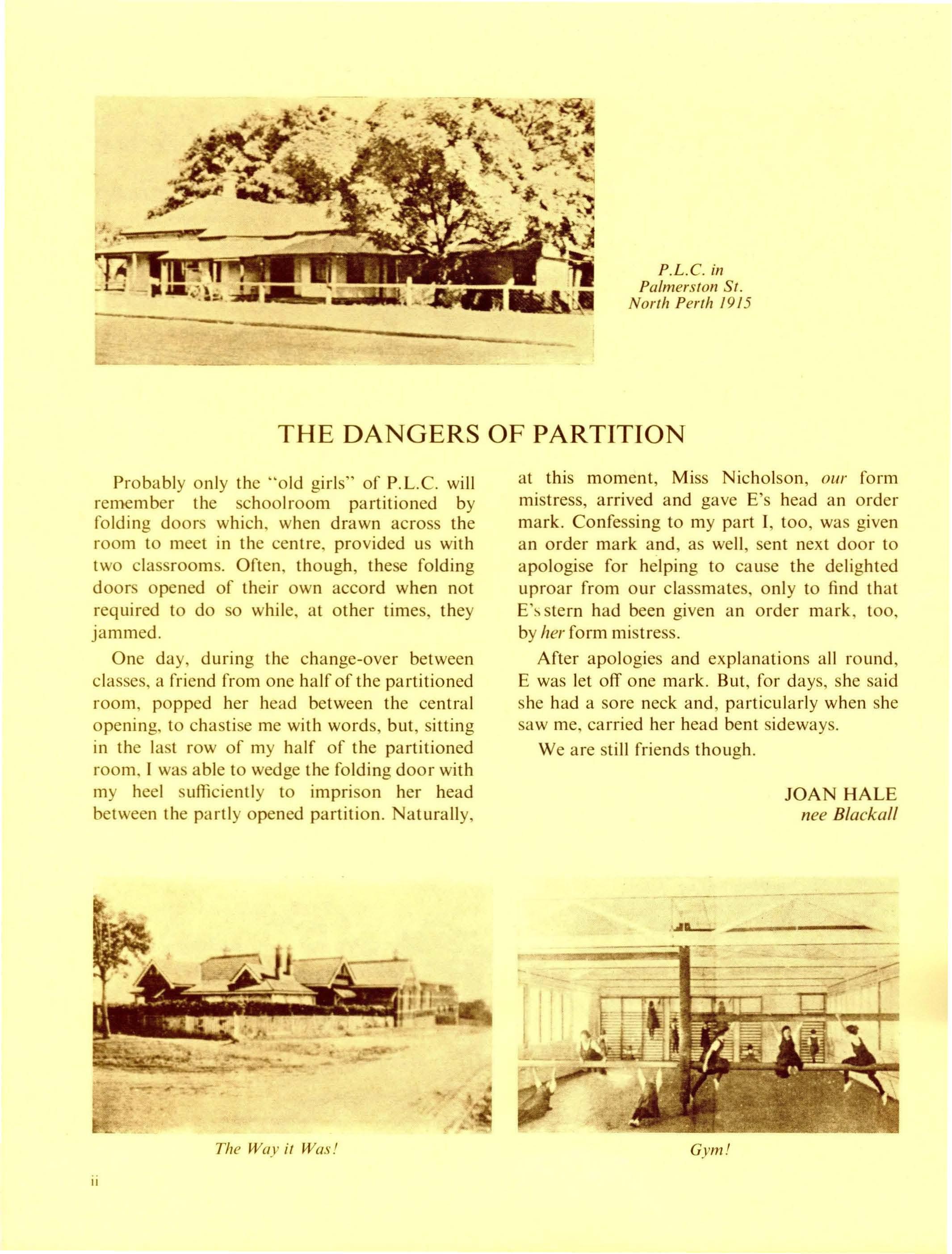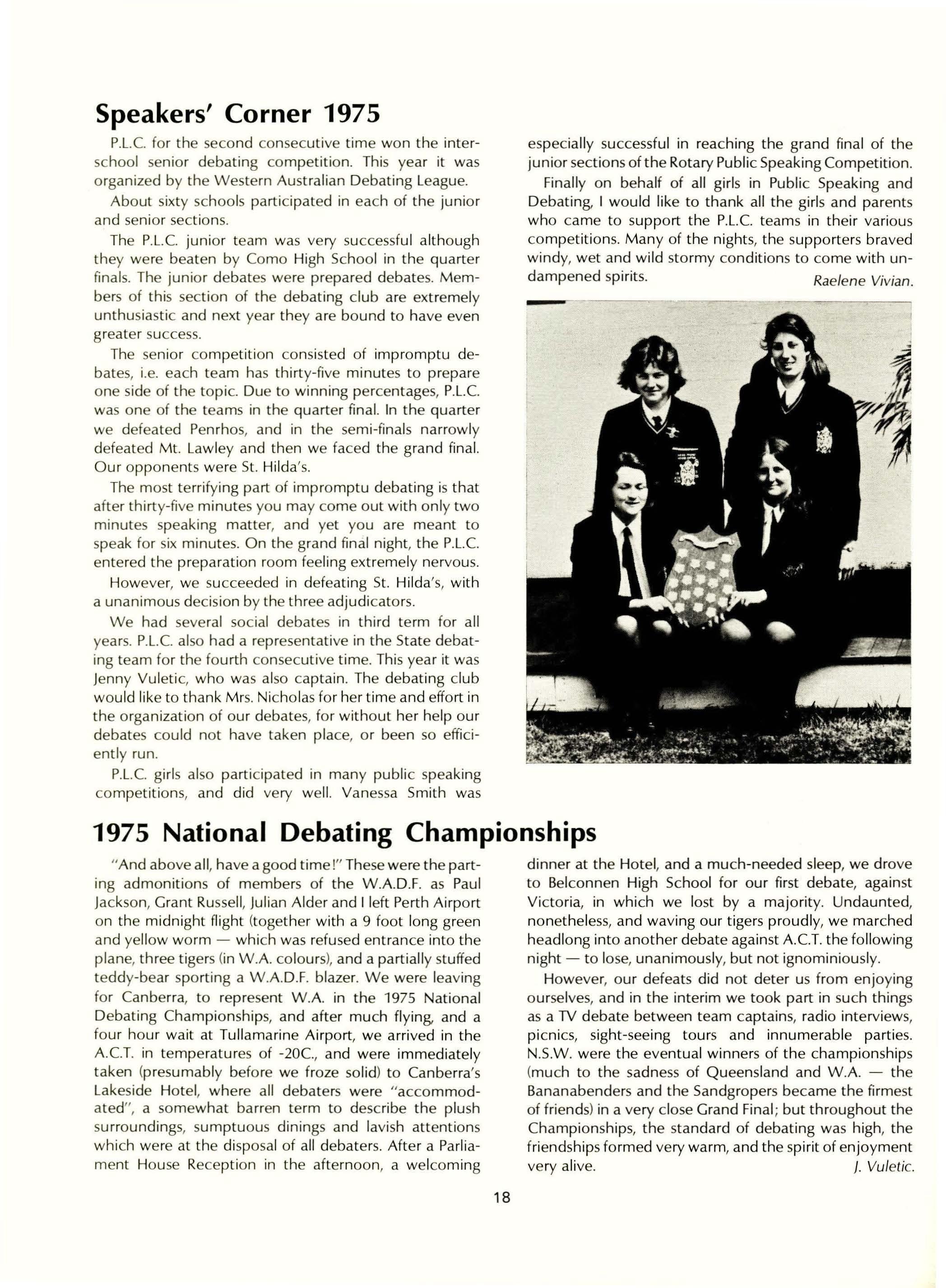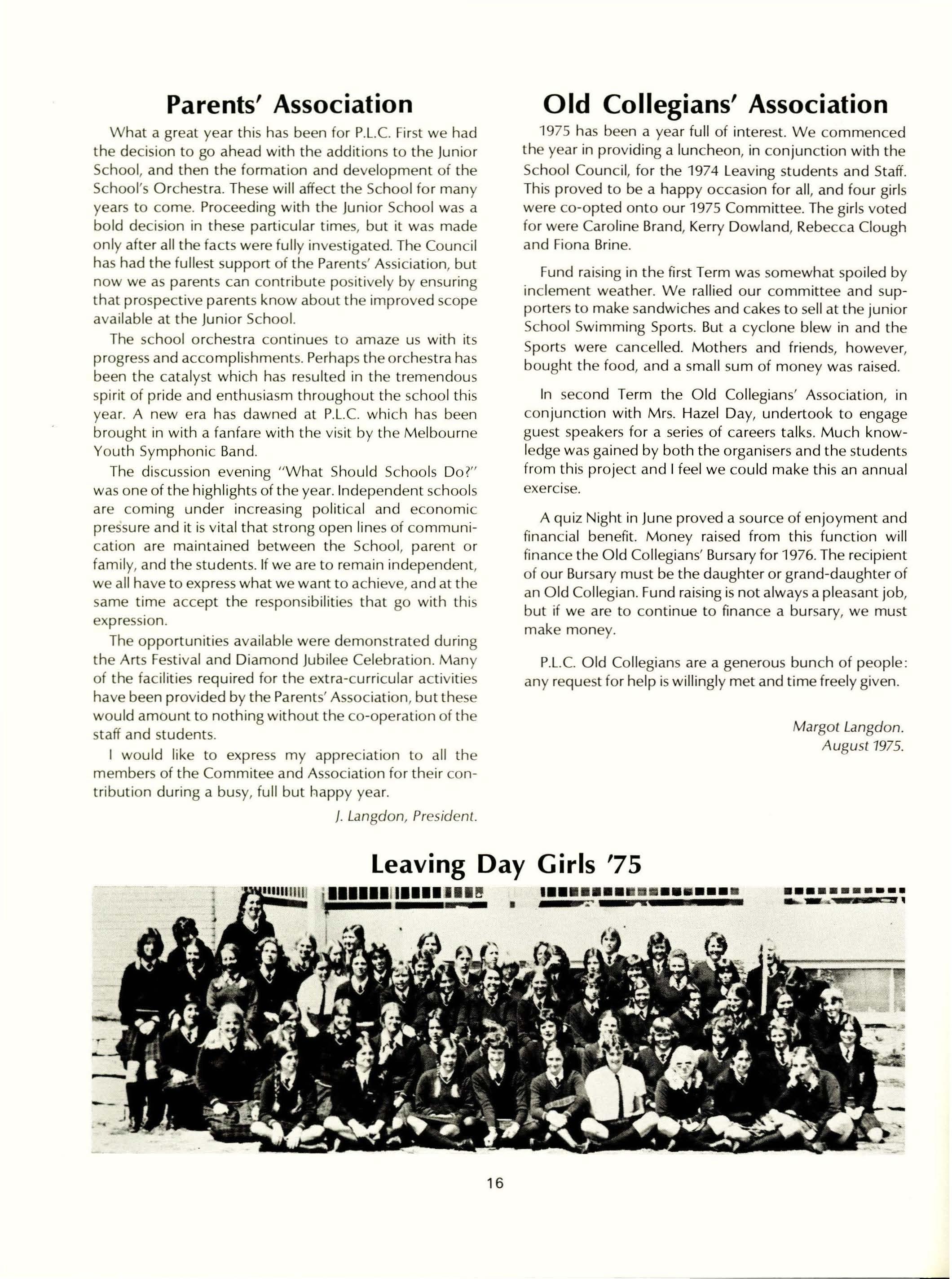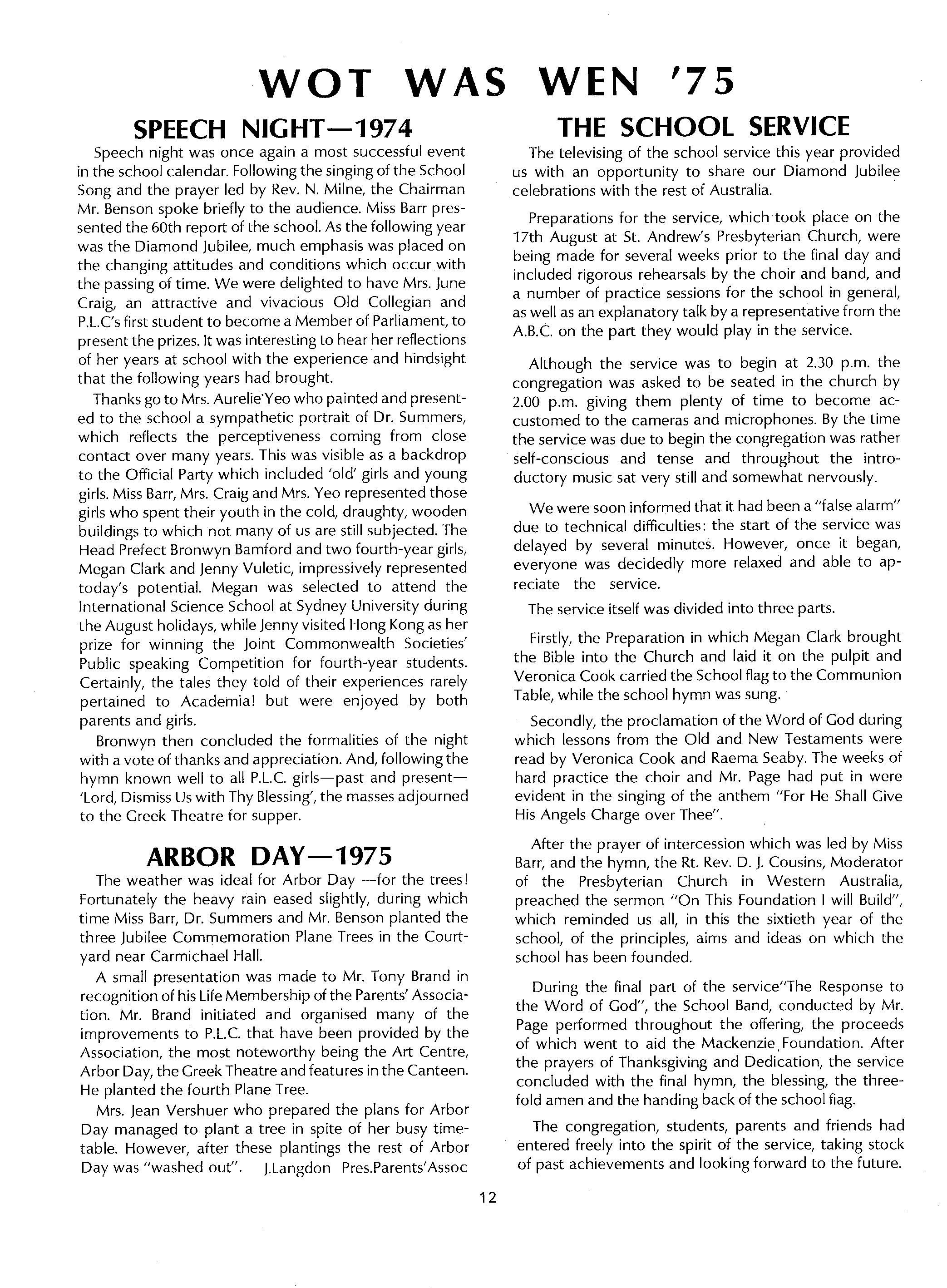 Speech night was once again a most successful event in the school calendar. Following the singing of the School Song and the prayer led by Rev. N. Milne, the Chairman Mr. Benson spoke briefly to the audience. Miss Barr pressented the 60th report of the school. As the following year was the Diamond jubilee, much emphasis was placed on the changing attitudes and conditions which occur with the passing of time. We were delighted to have Mrs. june Craig, an attractive and vivacious Old Collegian and P.L.e's first student to become a Member of Parliament, to present the prizes. It was interesting to hear her reflections of her years at school with the experience and hindsight that the following years had brought.