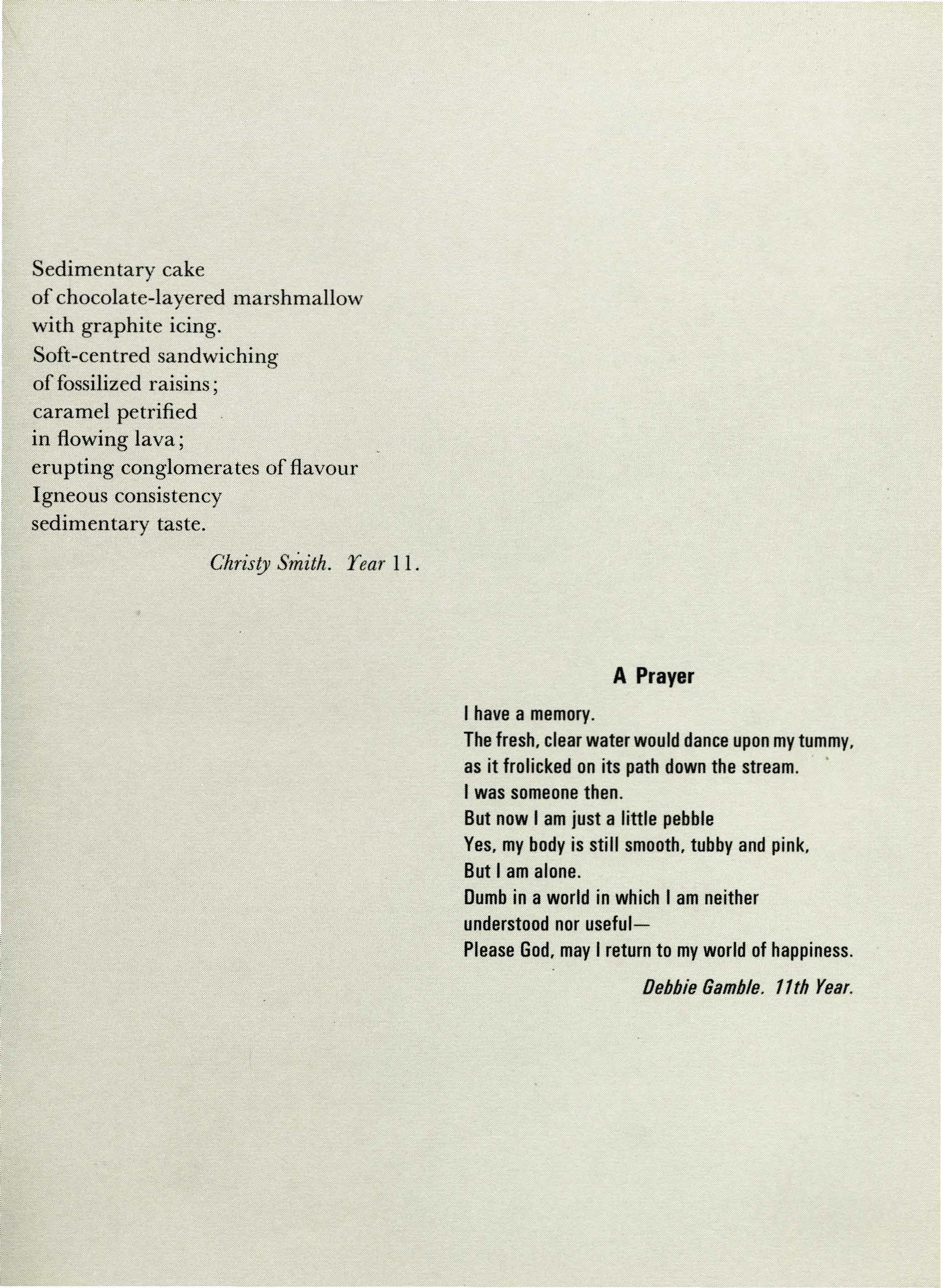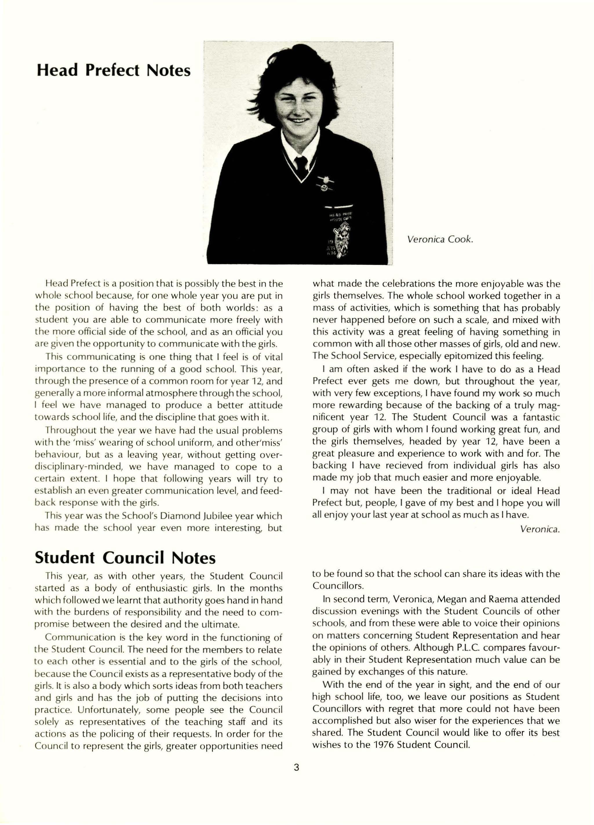 I am often asked if the work I have to do as a Head Prefect ever gets me down, but throughout the year, with very few exceptions, I have found my work so much more rewarding because of the backing of a truly magnificent year 12. The Student Council was a fantastic group of girls with whom I found working great fun, and the girls themselves, headed by year 12, have been a great pleasure and experience to work with and for. The backing I have recieved from individual girls has also made my job that much easier and more enjoyable.