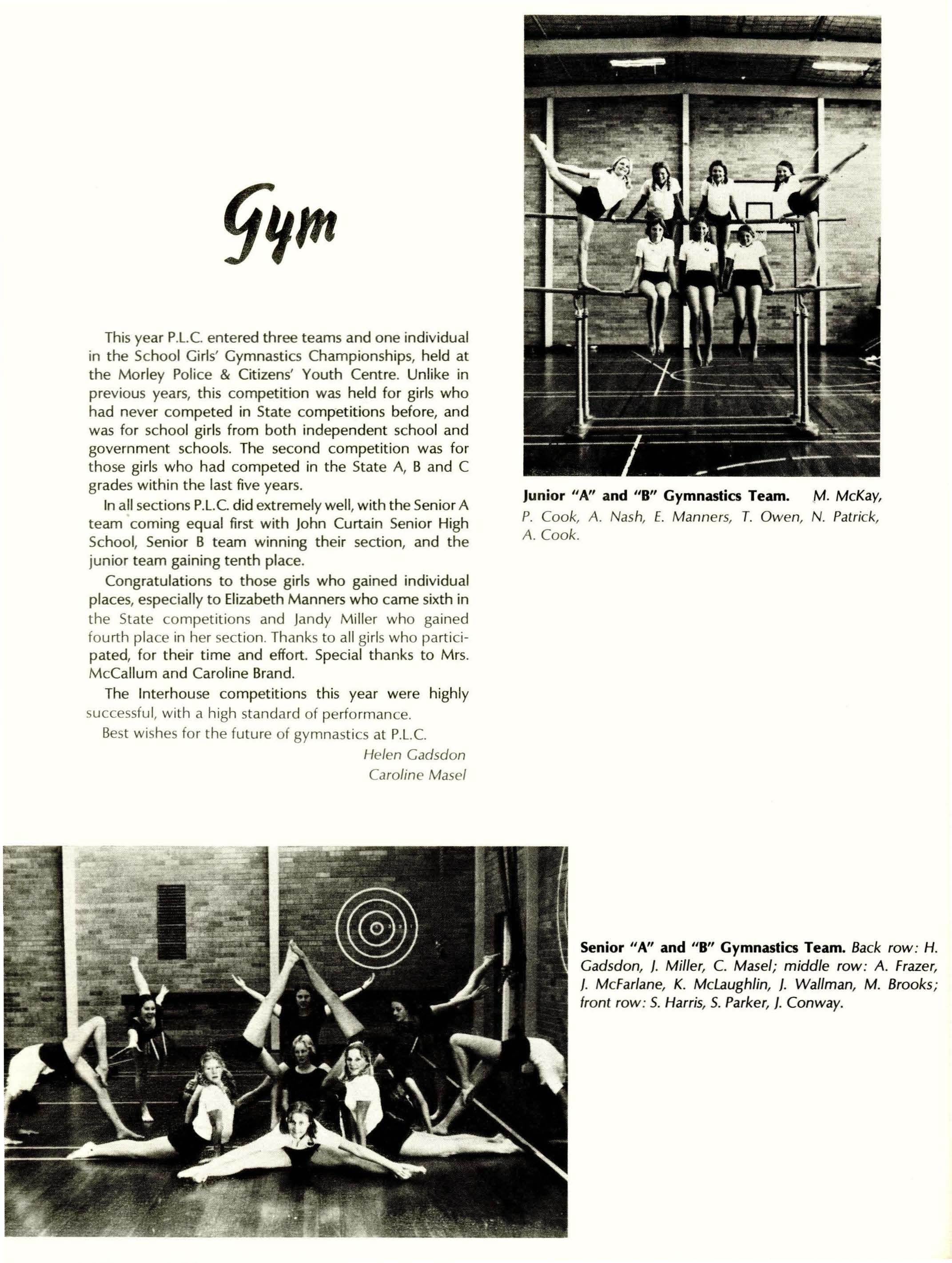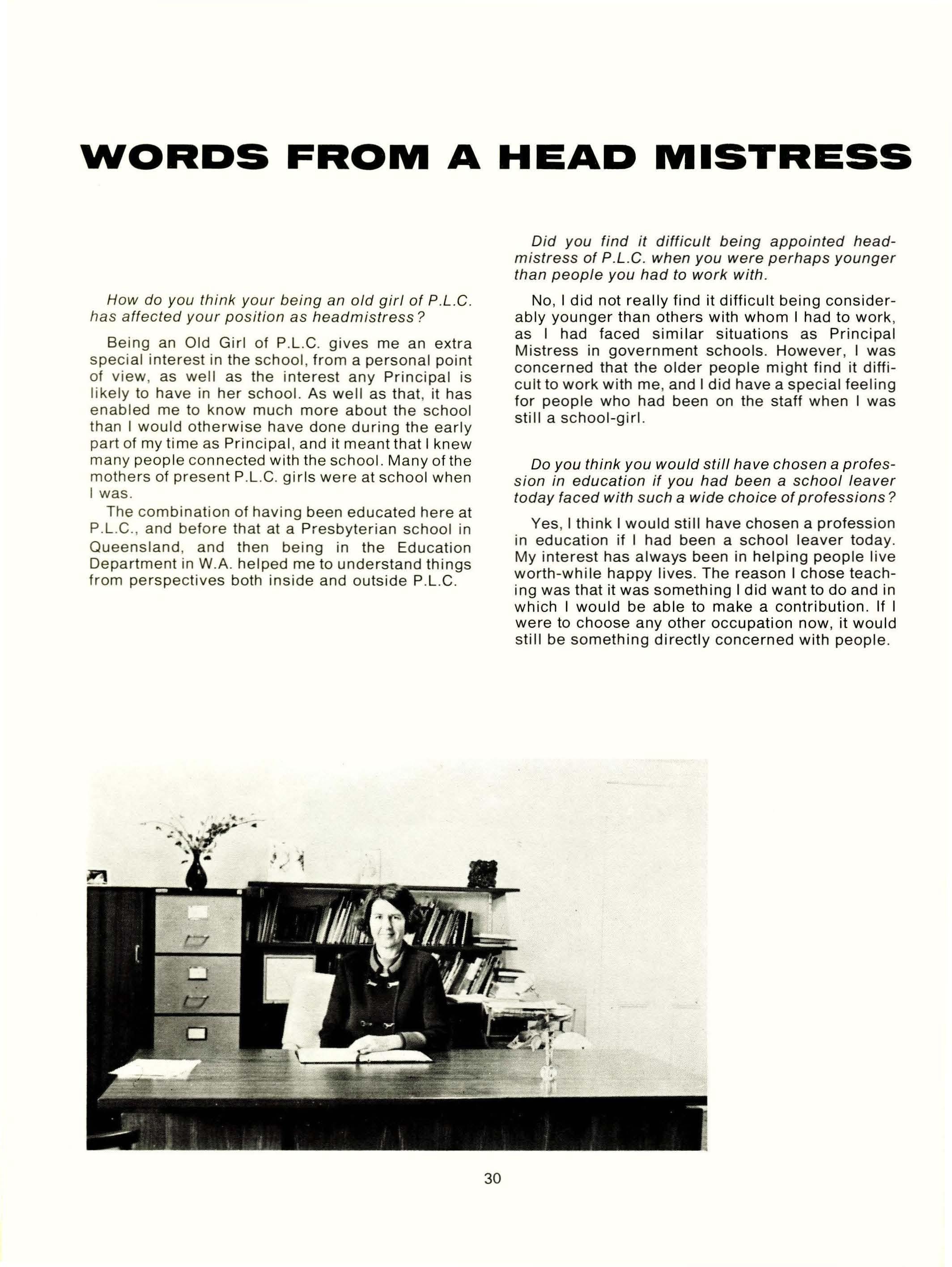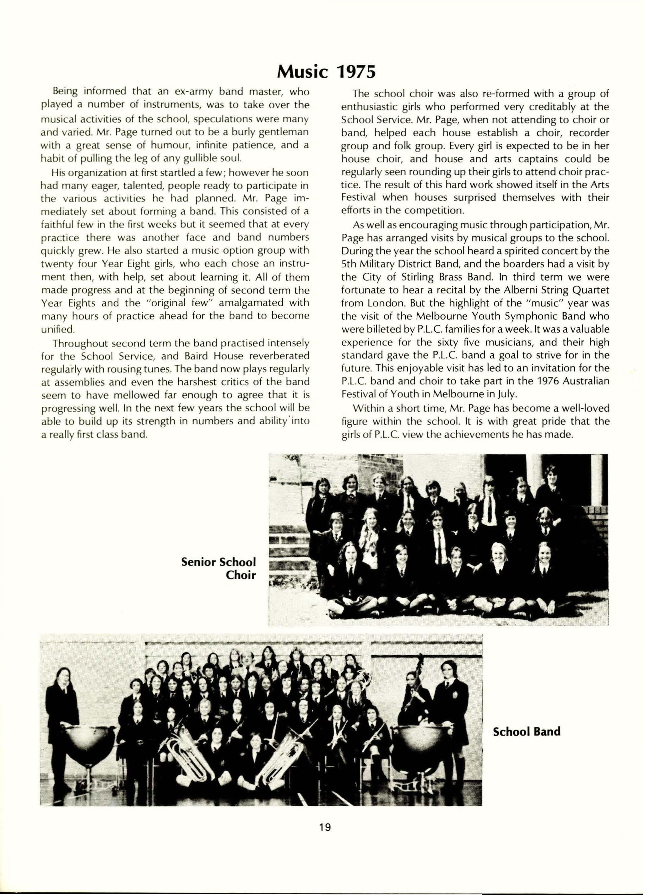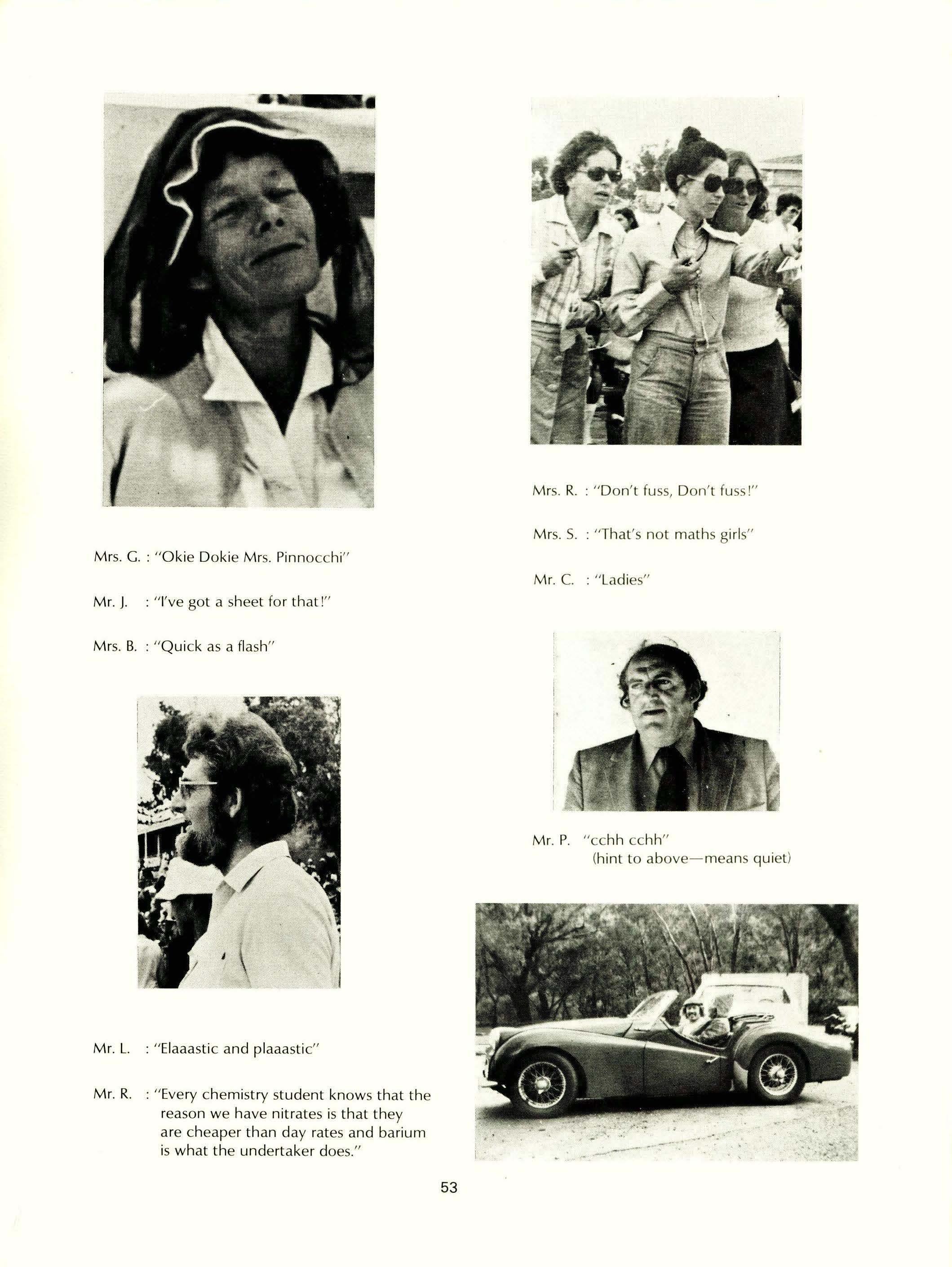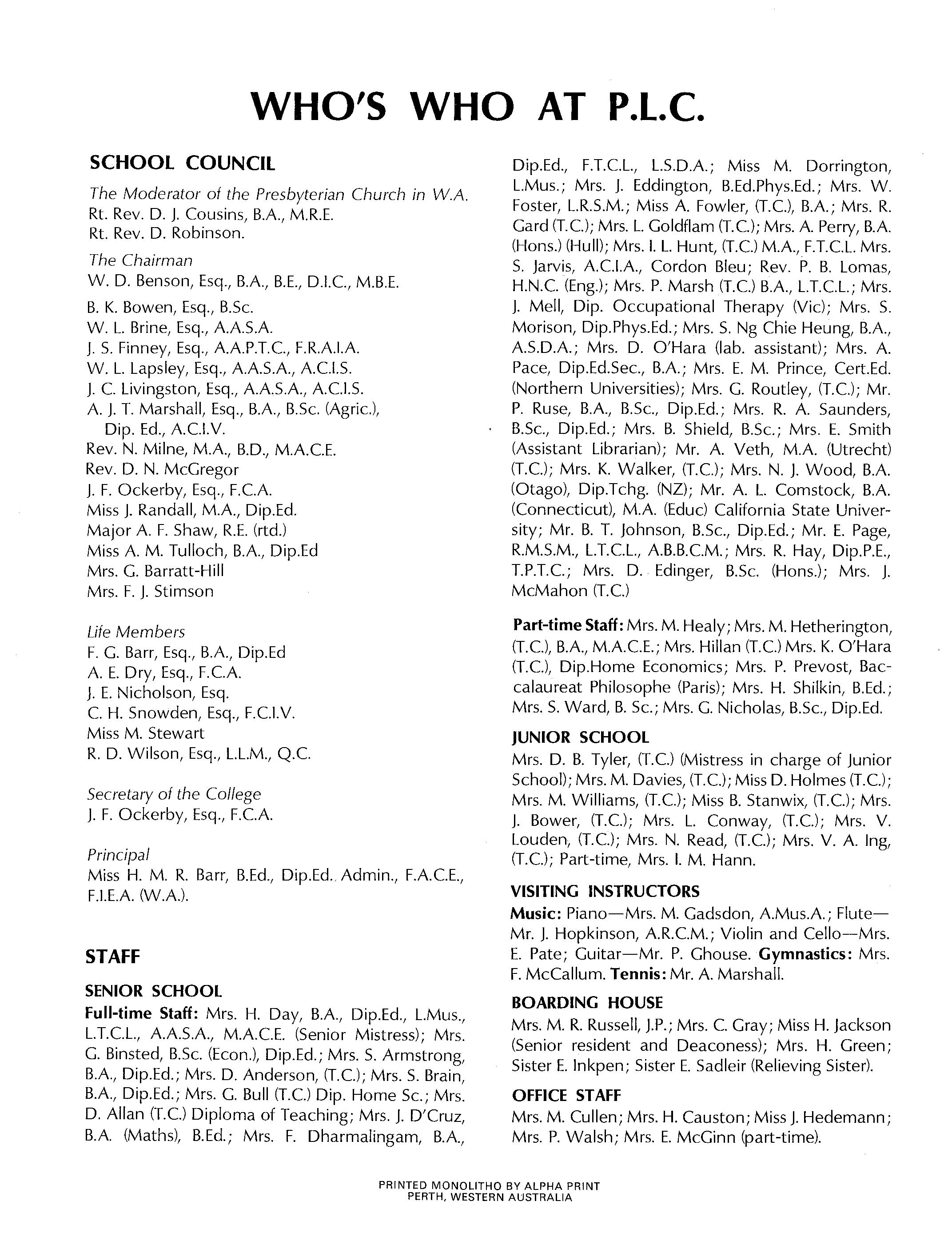 Dip.Ed., F.T.CL., L.S.DA; Miss M. Dorrington, L.Mus.; Mrs. J. Eddington, B.Ed.Phys.Ed.; Mrs. W. Foster, L.R.S.M.; Miss A Fowler, (TC), BA; Mrs. R. Gard (TC); Mrs. L. Goldflam (TC); Mrs. A Perry, BA (Hons.) (Hull); Mrs. I. L. Hunt, (T.C) MA, F.T.CL. Mrs. S. Jarvis, ACI.A, Cordon Bleu; Rev. P. B. Lomas, H.N.C (Eng.); Mrs. P. Marsh (T.C) BA, !..T.CL.; Mrs. J. Mell, Dip. Occupational Therapy (Vic); Mrs. S. Morison, Dip.Phys.Ed.; Mrs. S. Ng Chie Heung, BA, AS.DA; Mrs. D. O'Hara (lab. assistant); Mrs. A Pace, Dip.Ed.See., BA; Mrs. E. M. Prince, Cert.Ed. (Northern Universities); Mrs. G. Routley, (T.C); Mr. P. Ruse, BA, B.Se., Dip.Ed.; Mrs. R. A Saunders, B.Se., Dip.Ed.; Mrs. B. Shield, B.5e.; Mrs. E. Smith (Assistant Librarian); Mr. A Veth, MA (Utrecht) (T.C); Mrs. K. Walker, (TC); Mrs. N. J. Wood, BA (Otago), Dip.Tchg. (NZ); Mr. A L. Comstock, BA (Connecticut), MA (Educ) California State University; Mr. B. T. Johnson, B.Se., Dip.Ed.; Mr. E. Page, R.M.S.M., L.TCL., AB.B.CM.; Mrs. R. Hay, Dip.P.E., TP.T.C; Mrs. D. Edinger, B.Se. (Hons.); Mrs. J. McMahon (T.C)