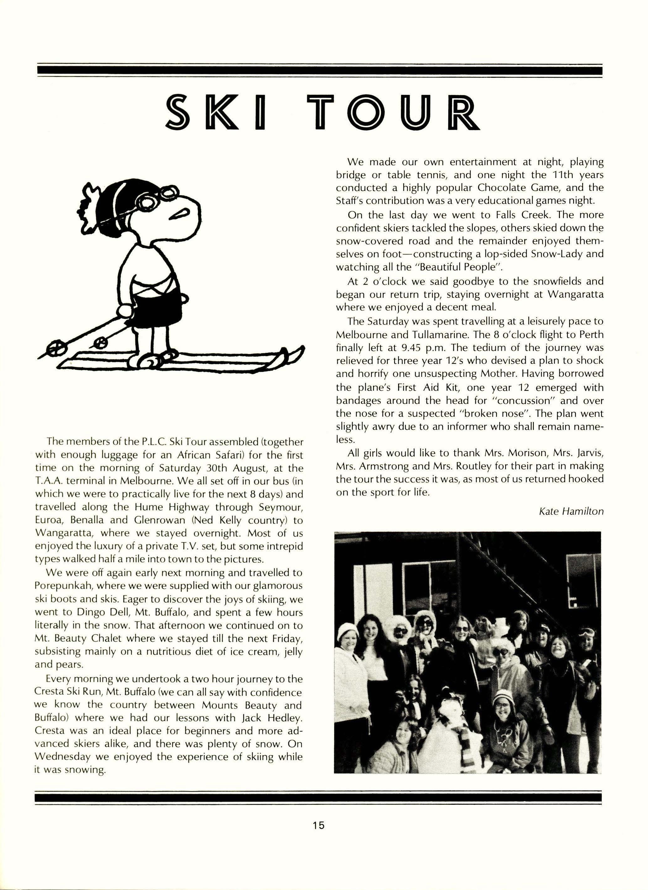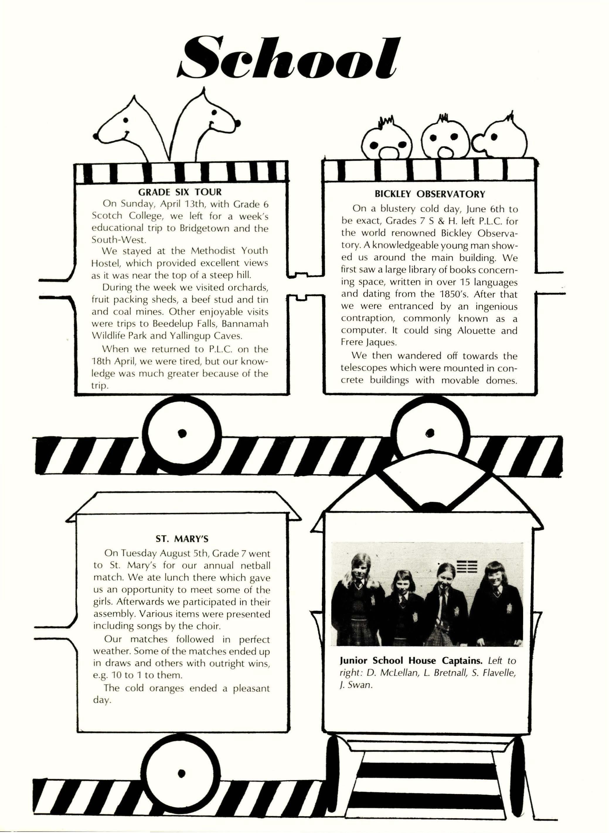 The Boarding House came to life once again after the Christmas Holidays, when boarders flocked in from all over the State, and other countries, for some girls the first or last time. Very quickly everyone settled into the usual routine of rising at 6.45 a.m., breakfast, School, lunch -this year we have had packed lunches which enables girls to eat with the day bugs or attend sport or set practices. If it rained we ate in the dining room. After school-sporting activities, music practices, or whatever you fancied doing (with a great number of exceptions), tea, prep. which was done at school for junior school girls to 11 th years. 12th years study upstairs in their dorms where desks are provided. Finally, to close the day bed and lights out.