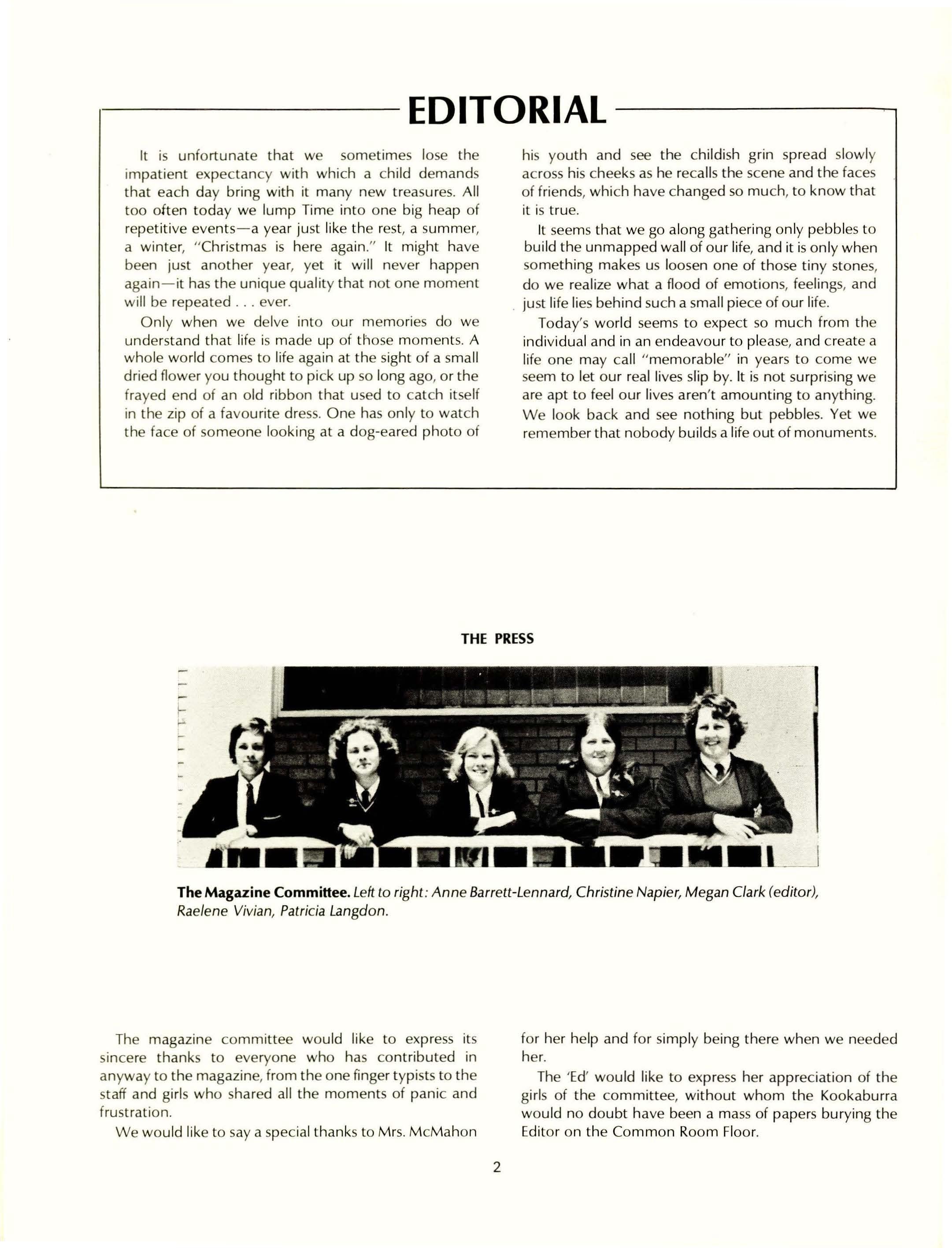 The 'Ed' would like to express her appreciation of the girls of the committee, without whom the Kookaburra would no doubt have been a mass of papers burying the Editor on the Common Room Floor.