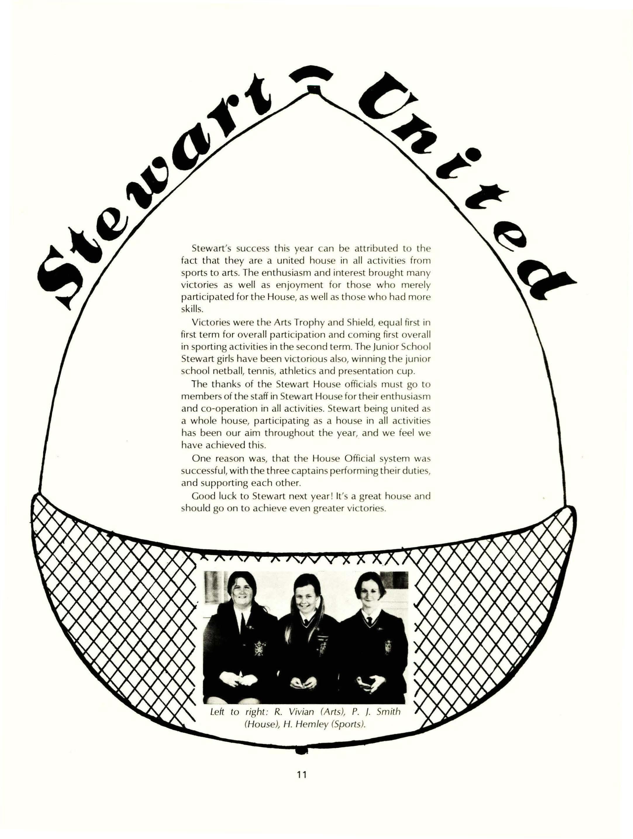 Stewart's success this year can be attributed to the fact that they are a united house in all activities from sports to arts. The enthusiasm and interest brought many victories as well as enjoyment for those who merely participated for the House, as well as those who had more skills.