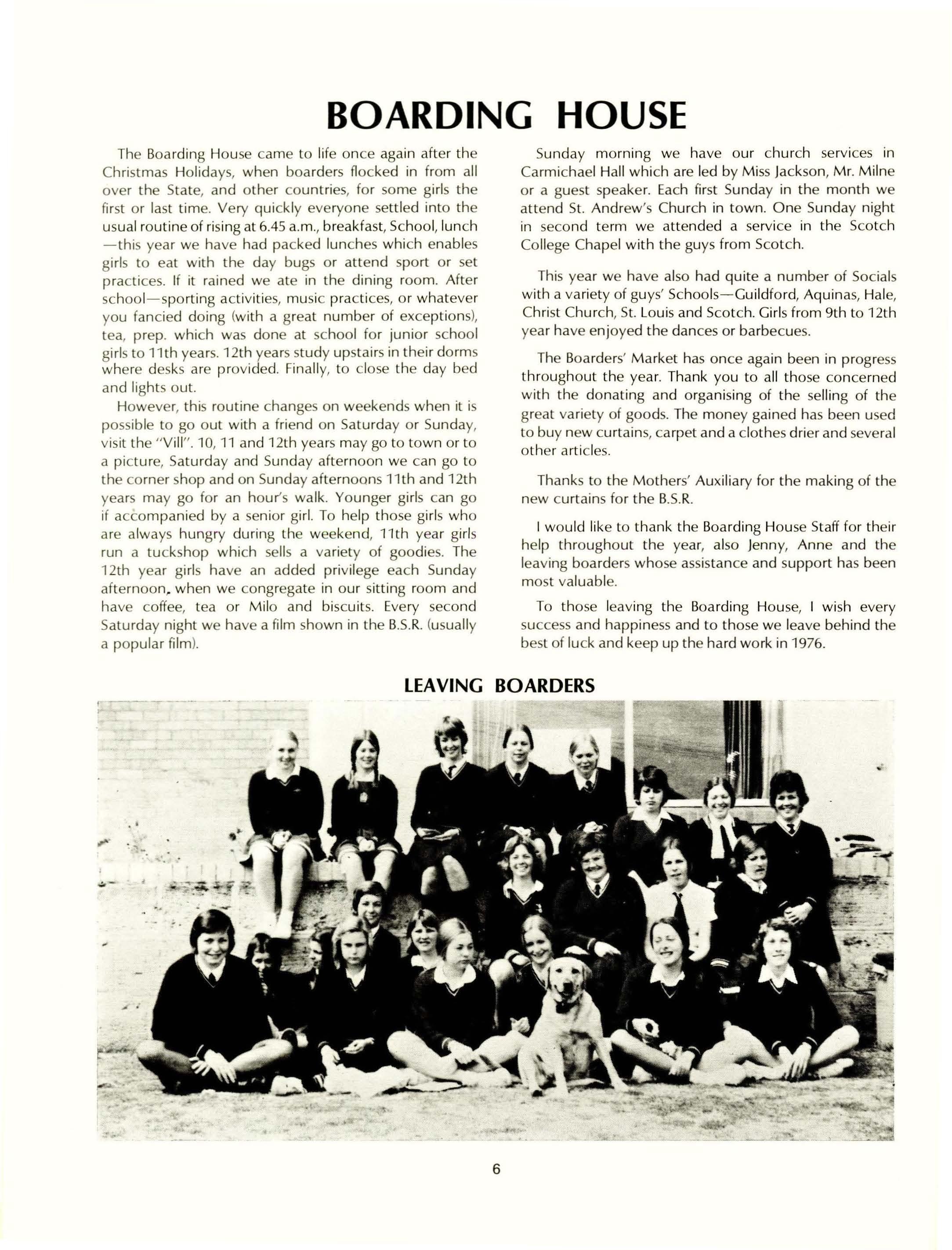 To those leaving the Boarding House, I wish every success and happiness and to those we leave behind the best of luck and keep up the hard work in 1976.