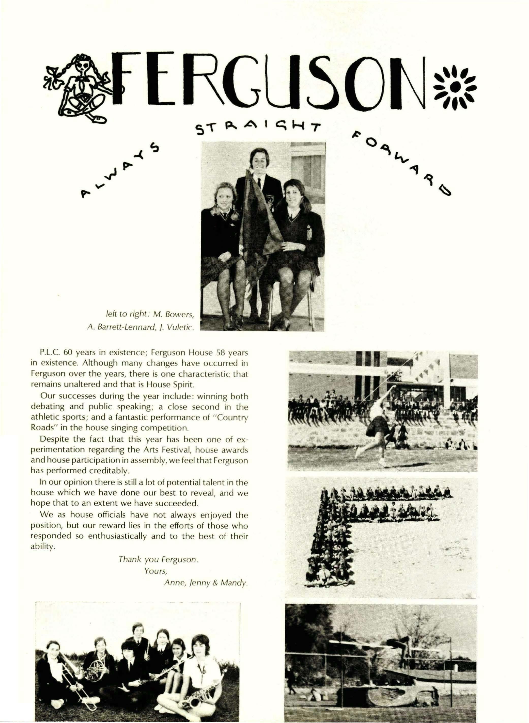 P.L.e. 60 years in existence; Ferguson House 58 years in existence. Although many changes have occurred in Ferguson over the years, there is one characteristic that remains unaltered and that is House Spirit.