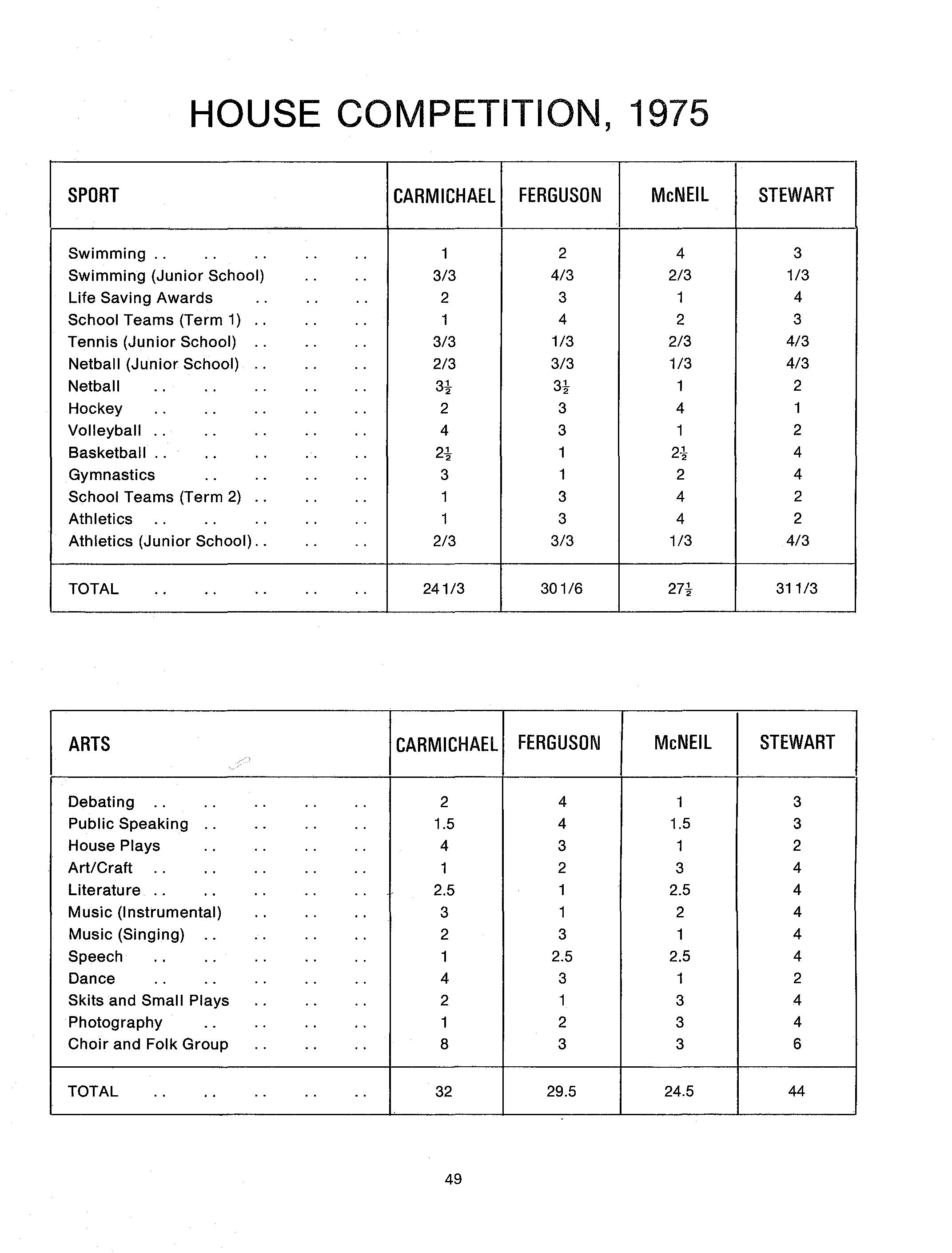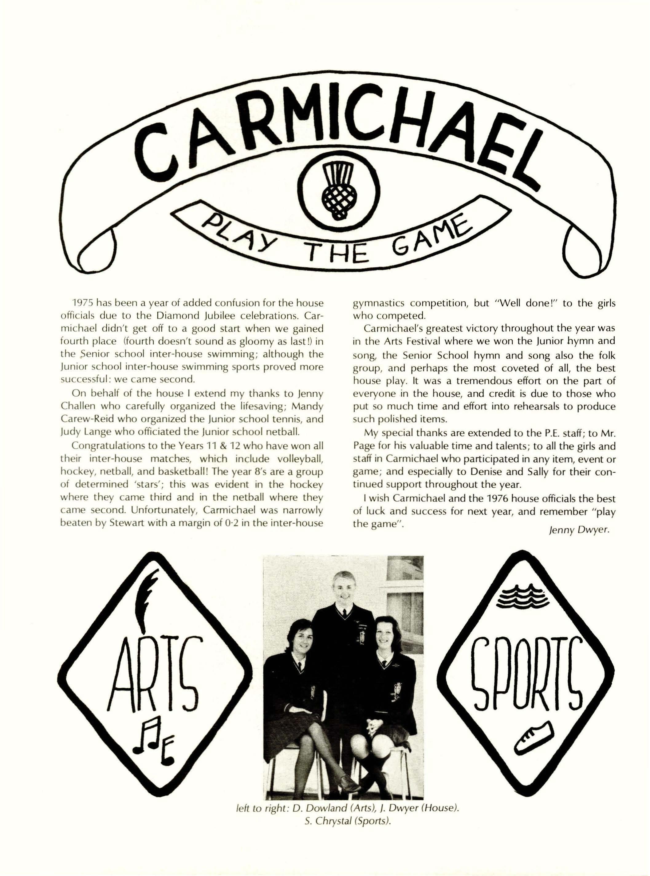 Carmichael's greatest victory throughout the year was in the Arts Festival where we won the Junior hymn and song, the Senior School hymn and song also the folk group, and perhaps the most coveted of all, the best house play. It was a tremendous effort on the part of everyone in the house, and credit is due to those who put so much time and effort into rehearsals to produce such polished items.