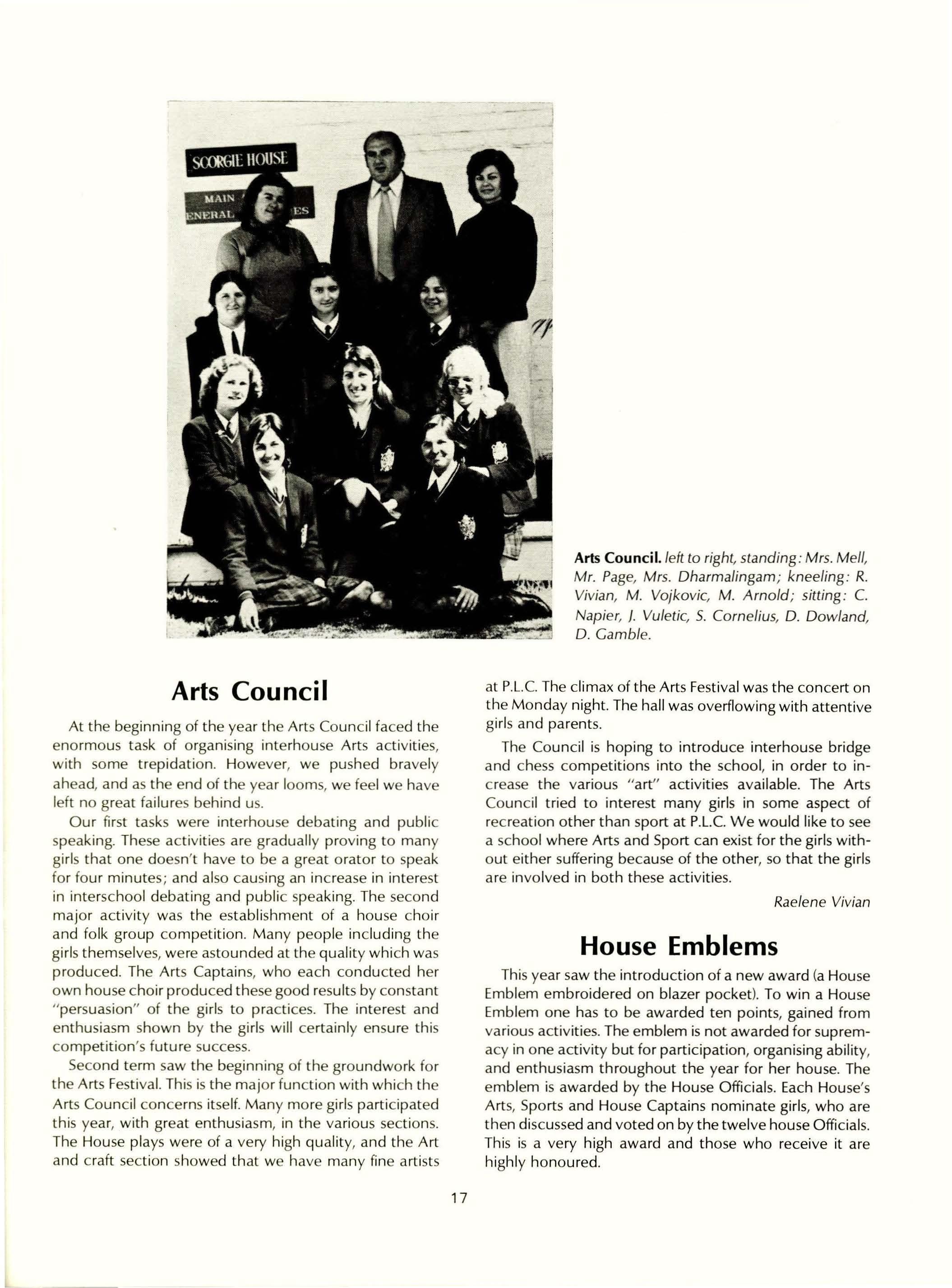 Communication is the key word in the functioning of the Student Council. The need for the members to relate to each other is essential and to the girls of the school, because the Council exists as a representative body of the girls. It is also a body which sorts ideas from both teachers and girls and has the job of putting the decisions into practice. Unfortunately, some people see the Council solely as representatives of the teaching staff and its actions as the policing of their requests. In order for the Council to represent the girls, greater opportunities need