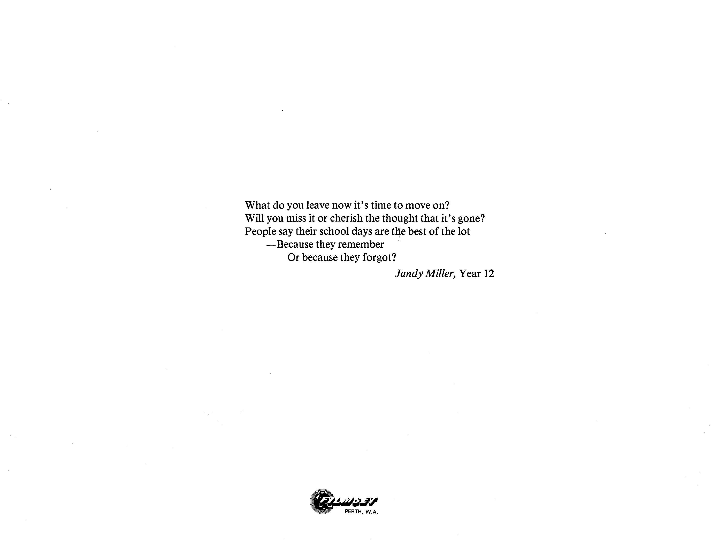 In view of my year as Senior Boarder, I would sincerely like to thank all the teachers and the Boarding House staff who gave me the encouragement and assistance I needed. However without the moral support of the Year 12 boarders the position of Senior Boarder would have been very difficult to fulfil. I cannot convey the gratitude lowe to so many Year 12 girls who sacrificed their time to listen to my problems when I became depressed. One incident I will never forget is the Year 8 and 9 Social, the success of which, initially, was very doubtful. However, it was not only the surprising success of the evening that gave me so much satisfaction, but the many Year 8 and 9s who came up to me afterwards to convey their thanks. It was expressions of satisfaction such as these that made my year as Senior Boarder an unforgettable one.