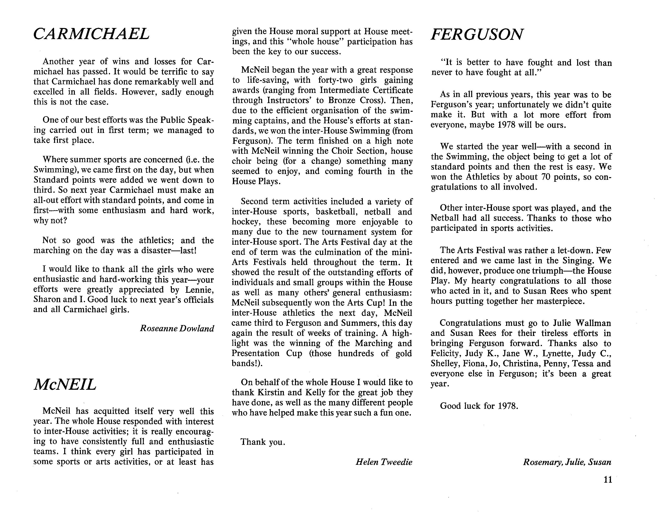 I would like to thank Mrs. Brain very much for her support and the tremendous interest she has shown in all our activities. Good luck to Kate, Anne, Adele and the rest of the House for 1978-may our terrific spirit continue!