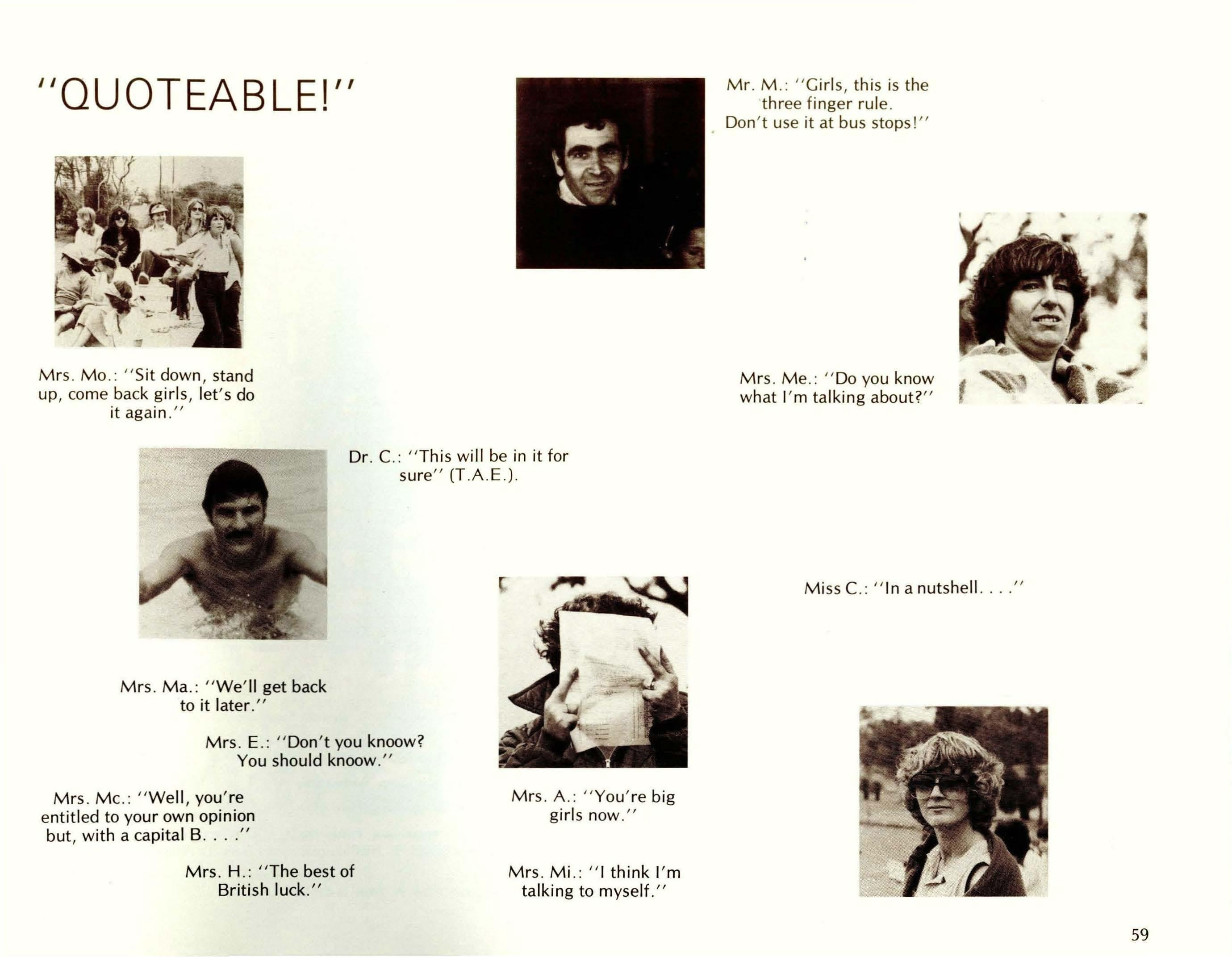 "Monday, 5th February, 1979." ... It had been carved in the minds of 150 girls since December. It signified the start of another year, for some their first, for others of us our last. However, Monday the 5th saw the traditional chaos, that can only belong to a girls' boarding school, descend on No.1 View Street. Cars, cases, parents, sewing machines, hairdryers, pot plants, guitars and tears mingled with the chattering excited mob of girls, all changed with new haircuts, sun tans, clothes, boy-friends and stories to tell.