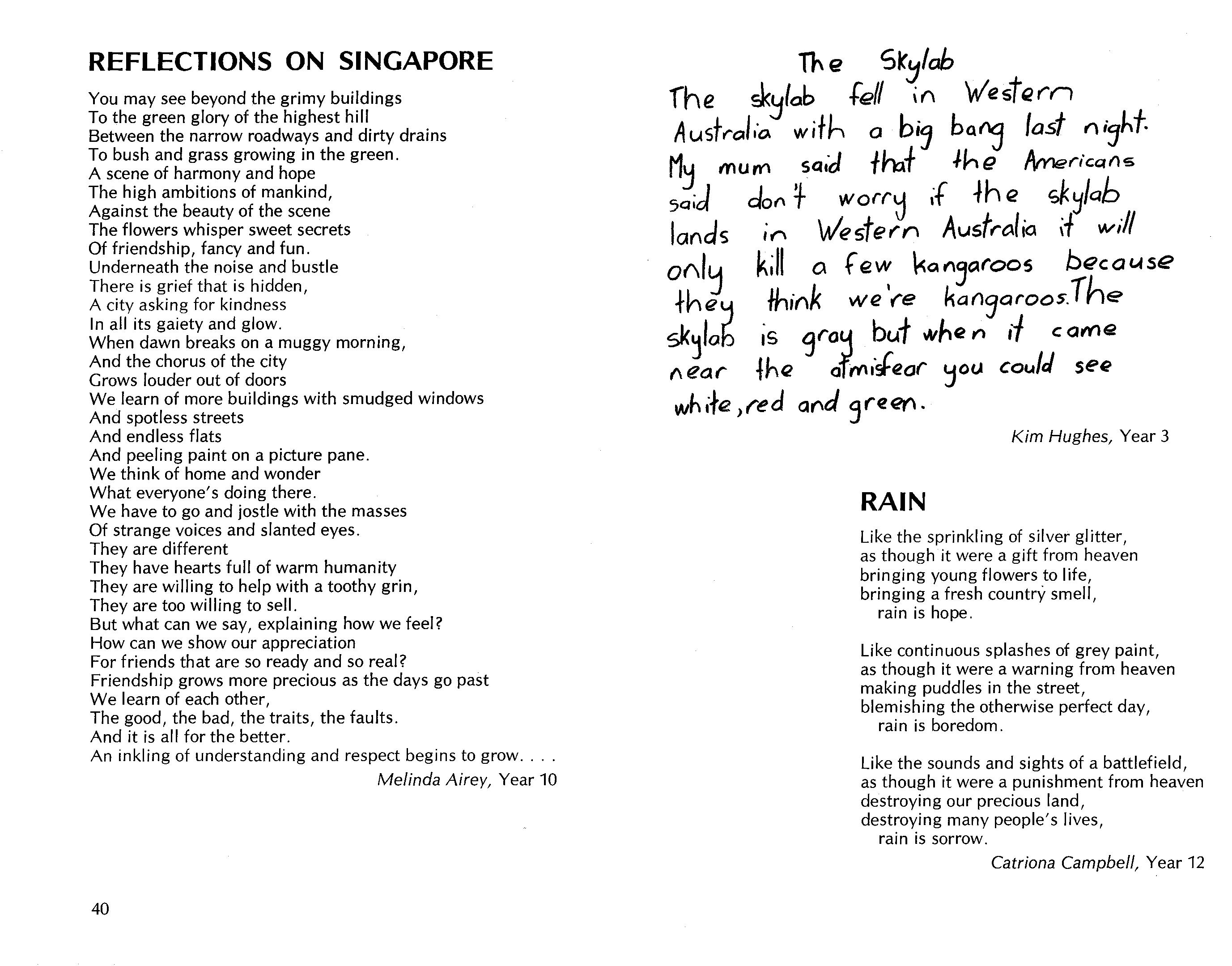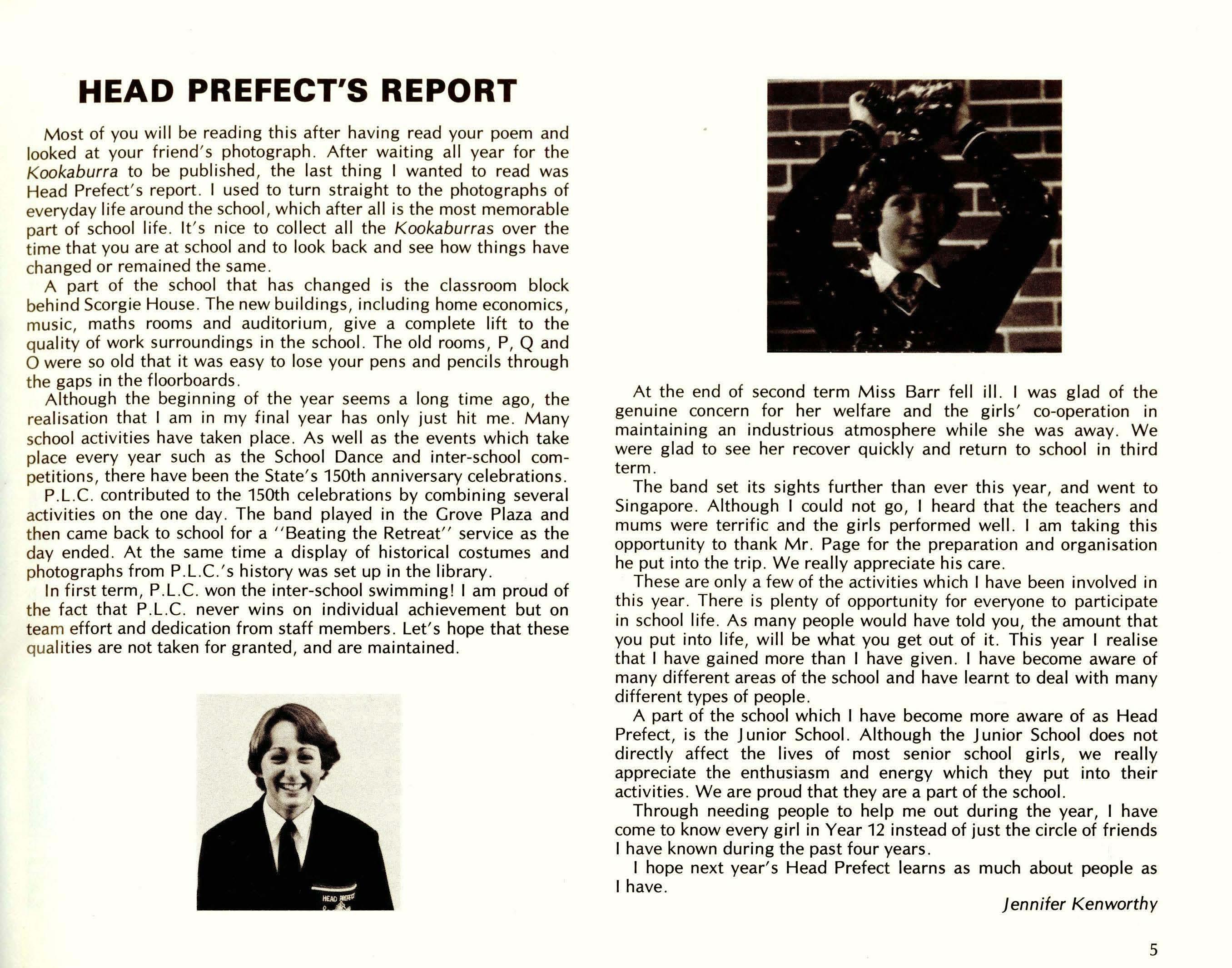 Most of you will be reading this after having read your poem and looked at your friend's photograph. After waiting all year for the Kookaburra to be published, the last thing I wanted to read was Head Prefect's report. I used to turn straight to the photographs of everyday life around the school, which after all is the most memorable part of school life. It's nice to collect all the Kookaburras over the time that you are at school and to look back and see how things have changed or remained the same.