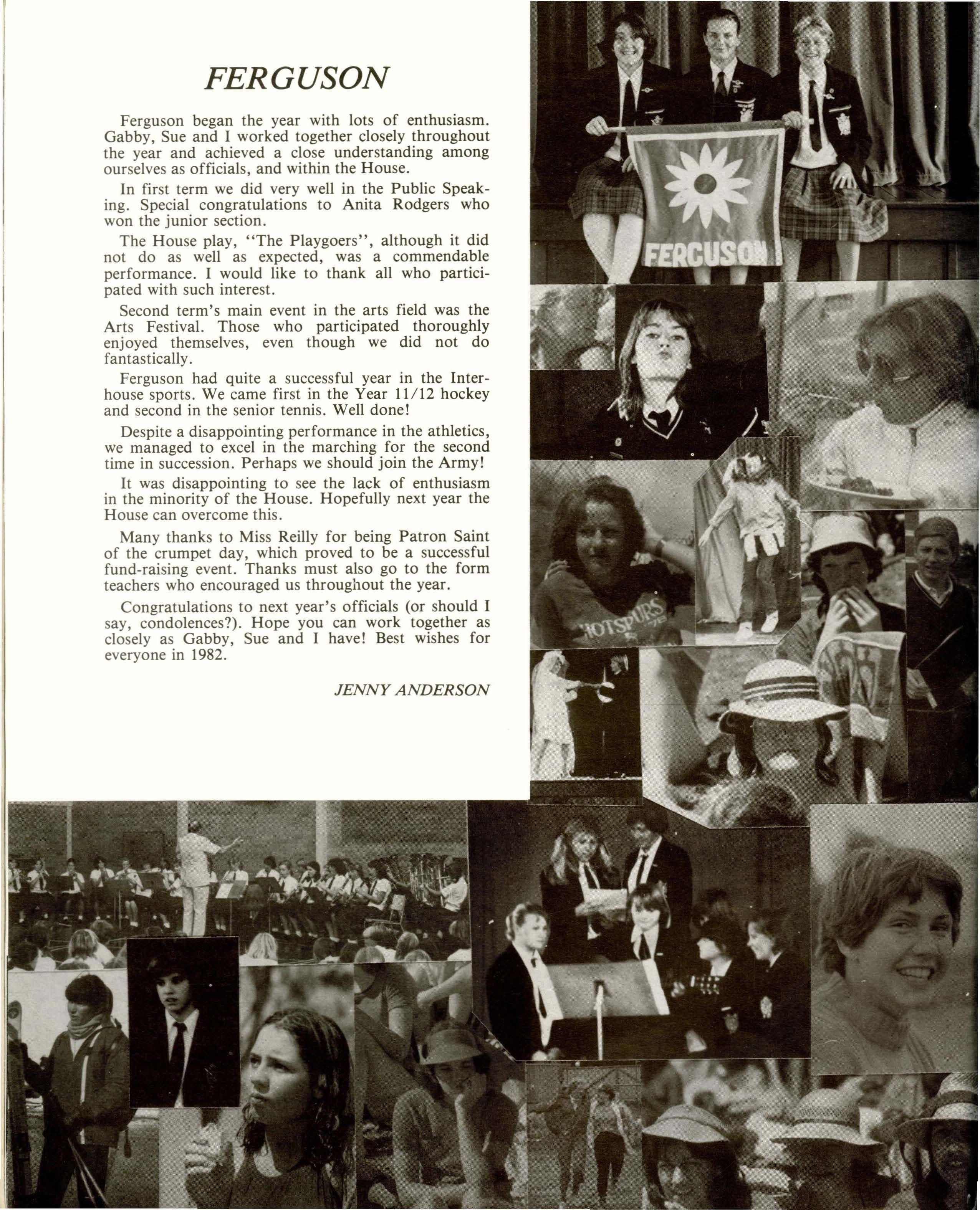Thanks, oranges, for all your help and spirit! I would like to thank the House Advisor, Mrs. Morison, and especially Mrs. Haustead for all the support and encouragement they gave Sue, Ceili and me. I wish Baird all the luck for 1982 and hope the House officials will enjoy their positions as much as we did!