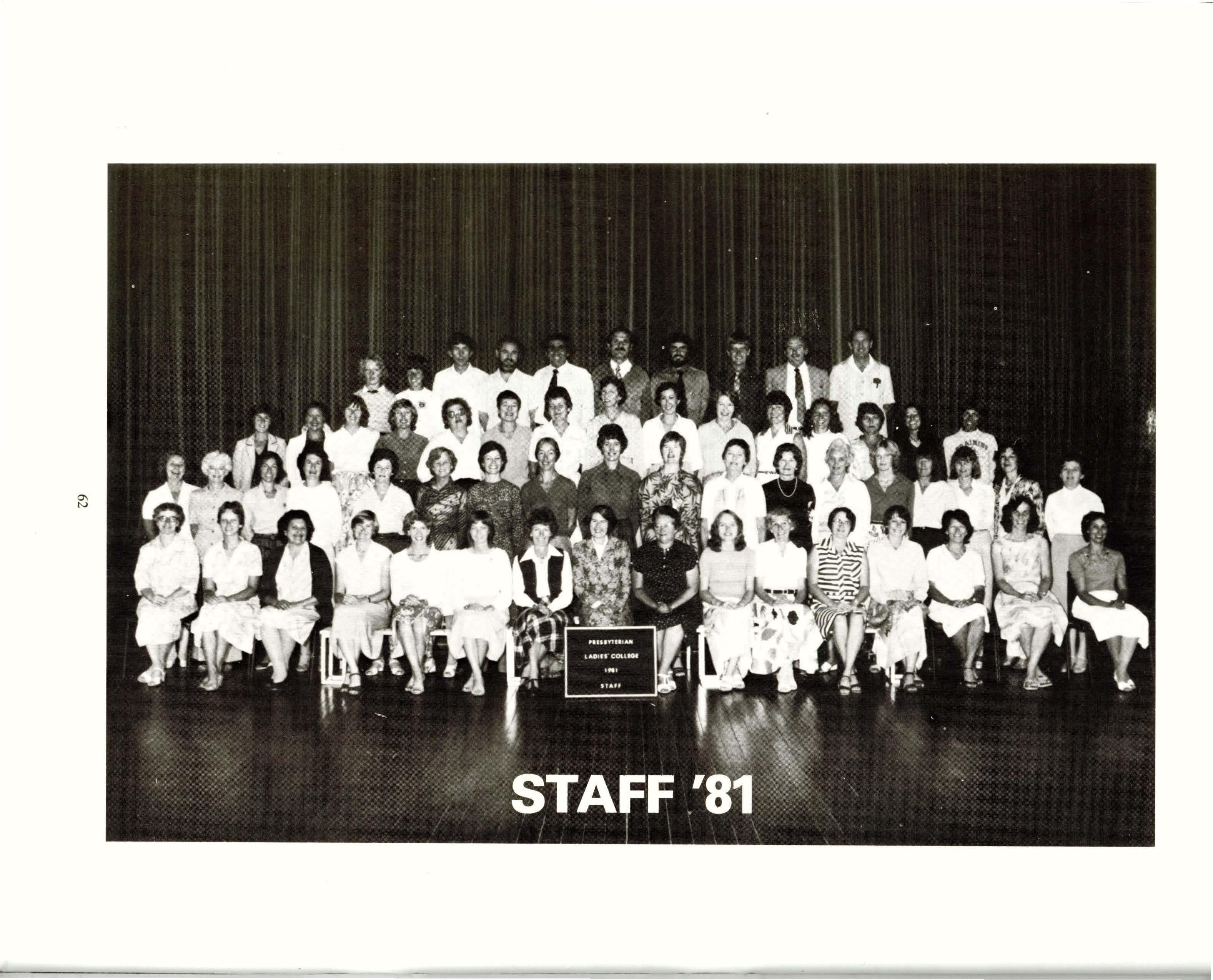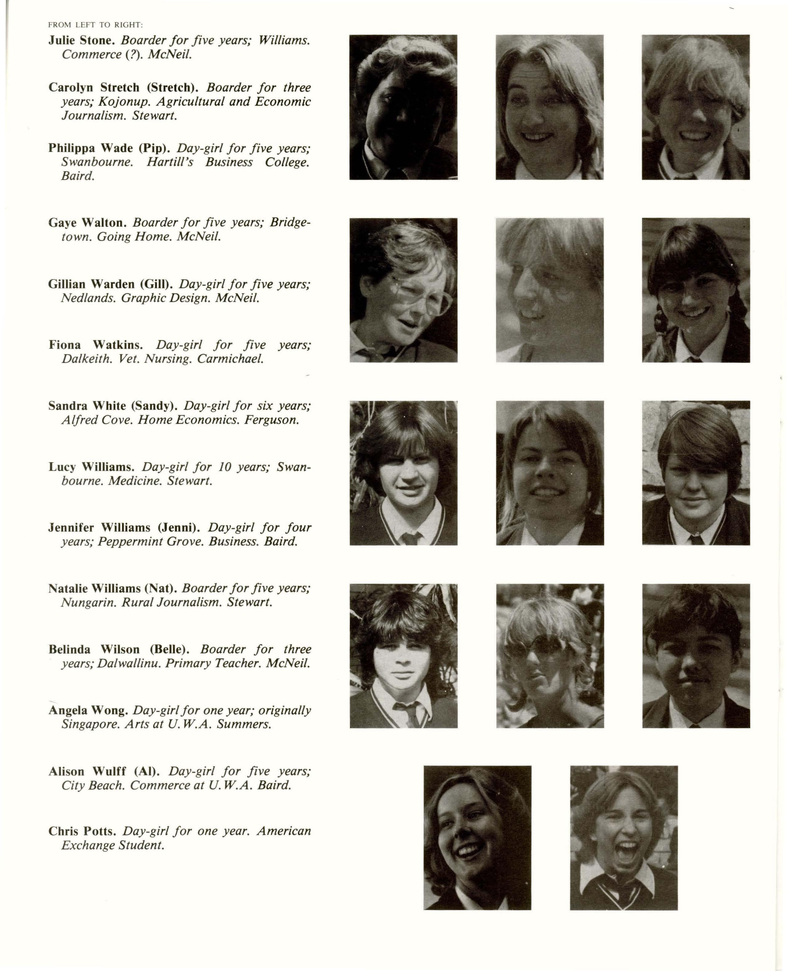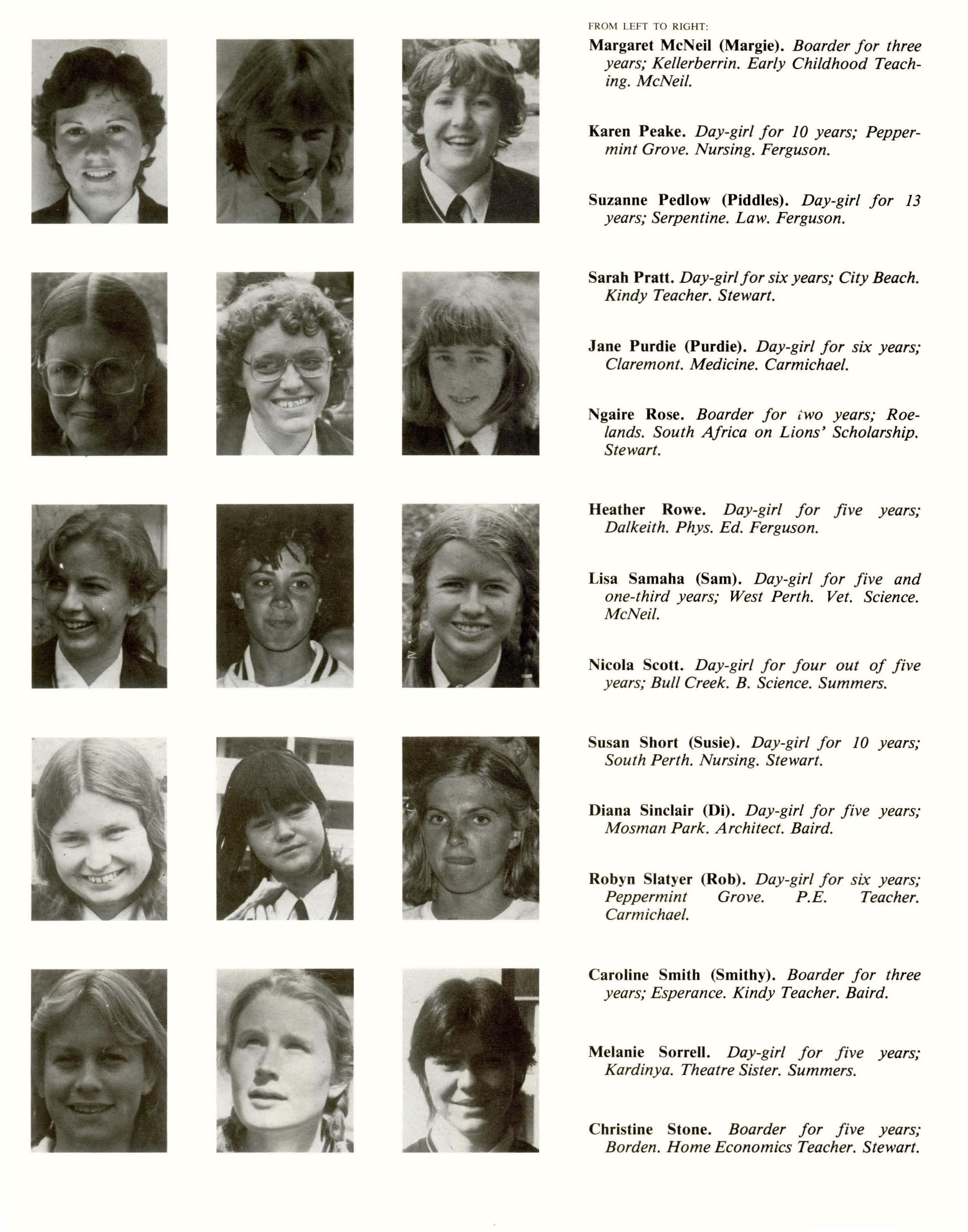 Full-time Teachers: Mrs. D. A. Allsopp, B.Sc., Dip. Ed.; Mrs. D.I. Anderson, Teach. Cert.; Mrs. H. Atchison, Teach. Cert.; Mrs. M. L. Best, Teach. Cert.; Mrs. L. M. Betts, B.A., Dip. Ed., Teach. Cert.; Mrs. S. E. Bonner, B.A. (Joint Hons.) (Aberystwyth), Cert. in Ed. (Aberystwyth); Miss M. I. Boucker, Dip. Teach.; Mrs. G. M. Bull, Dip. Home Sc., Teach. Cert., M.A.C.E.; Dr. R. Charles, Ph.D. (Chem.), (AN.D.), Dip. Teach. (Mercer House); Mrs. W. Chidgey, Teach. Cert. (Liverpool); Miss C. M. Clarke, B.A., B.Ed.; Mrs. D. L. Conway, Teach. Cert.; Mrs. M. R. Davies, Dip. Teach., Grad. Dip. (Reading); Mrs. J. D'Cruz, B.A. (Maths.), B.T. (Madras); Mrs. F. J. Dharmalingam, B.A., Dip. Ed., F.T.C.L., L.S.D.A.; Mrs. J. I. Douge, Grad. Dip. Primary Teaching, Dip. Teach.; Mrs. T. M. Ebert, Dip. Teach., C.S.T.D.; Mrs. D. J. Edinger, B.Sc. (Hons.); Mrs. D. M. Grant, Dip. Ed. (Liverpool); Mrs. J. Hafekost, B.A., Dip. Ed.; Miss C. M. Harrington, Dip. Teach. (Science); Mrs. D. M. Haustead, B.A., Dip. Ed. (D.); Mrs. H. J. Heptinstall, B.Sc. (Hons.) (Manchester), Cert. Ed. (Leics.), Dip. Lib. Stud. (W.AI.T.); Mrs. J. E. Hetherington, B.A. (Hons.); Mrs. J. Hicks, Teach. Cert.; Mrs. V. K. Hutcheson, B.Bus. (D.); Mr. W. K. James; Mrs. S. M. Jarvis, A.C.I.A., Cordon Bleu; Mrs. E. Kenworthy, B.A., Teach. Cert.; Mrs. P. J. Kotai, B.A., Teach. Cert.; Mrs. V. K. Louden, Dip. Teach.; Mrs. R. Macpherson, B.A. (Hons.) (Liverpool); Mrs. D. McArthur, B.A., Dip. Ed.; Miss J. L. McFarlane, Dip. Teach.; Mrs. J. A. McMahon, Teach. Cert.; Mrs. J. B. Mell. Dip. Occ. Therapy (Melb.); Mr. D. M. Melville, B.Sc., Dip. Ed.; Mrs. B. Mills, Dip. Teach., Grad. Dip. Teach Remediation, Teach. Cert. (Sheffield); Mrs. E. M. Milne, B.Com. (Melb.), Dip. Ed. (Melb.); Mrs. S. M. Morison, Dip. P.E. (Melb.); Mrs. F. J. Nalder, B.A., Dip. Teach.; Miss A. G. Nylander, Dip. Teach.; Mr. E. Page, R.M.S.M., L.T.C.L., AB.B.C.M.; Mrs. M. L. Page, L.Mus., L.T.C.L.; Mrs. J. A. Papineau, Dip. Teach.; Mrs. A. T. Pears, Dip. P.E. (Dunfermline), Teach. Cert. Sec. (Scot.); Miss M. J. Reilly, B.A., Dip. Ed.; Mrs. J. Robison, B.A. (A.N.D.), Dip. Ed. (Syd.), Dip. Lib. Stud. (W.A.I.T.); Mrs. G. M. Routley, Teach. Cert.; Mrs. D. Rosendorff, B.Sc. (Hons.), Cert. in Ed.; Mr. D. J. Ruddle, B.Ed.; Mr. B. Rust, (commenced 2nd term); Mrs. M. Sandover, Assoc. Dip. Home. Ec.,