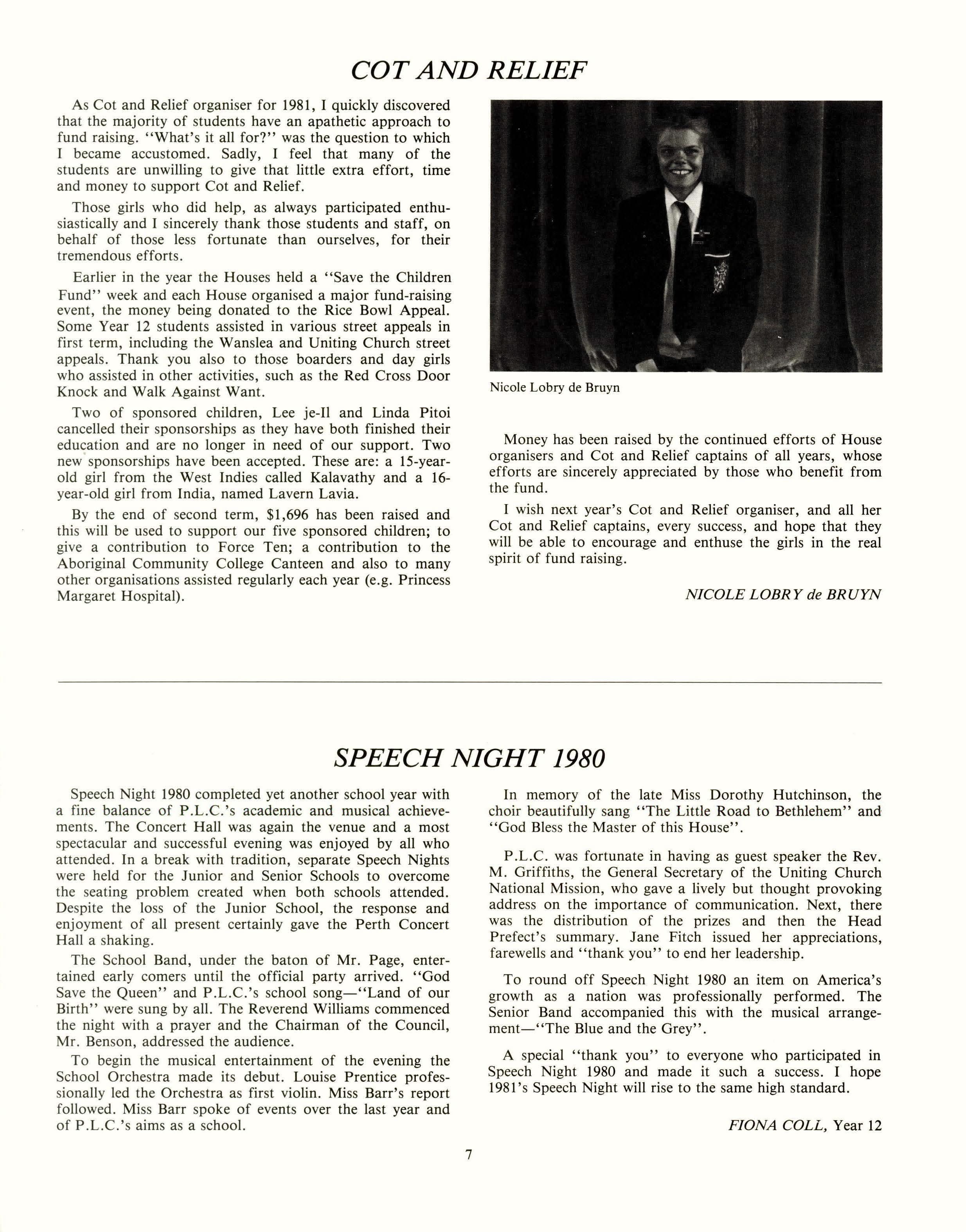 Speech Night 1980 completed yet another school year with a fine balance of P.L.Co's academic and musical achievements. The Concert Hall was again the venue and a most spectacular and successful evening was enjoyed by all who attended. In a break with tradition, separate Speech Nights were held for the Junior and Senior Schools to overcome the seating problem created when both schools attended. Despite the loss of the Junior School, the response and enjoyment of all present certainly gave the Perth Concert Hall a shaking.