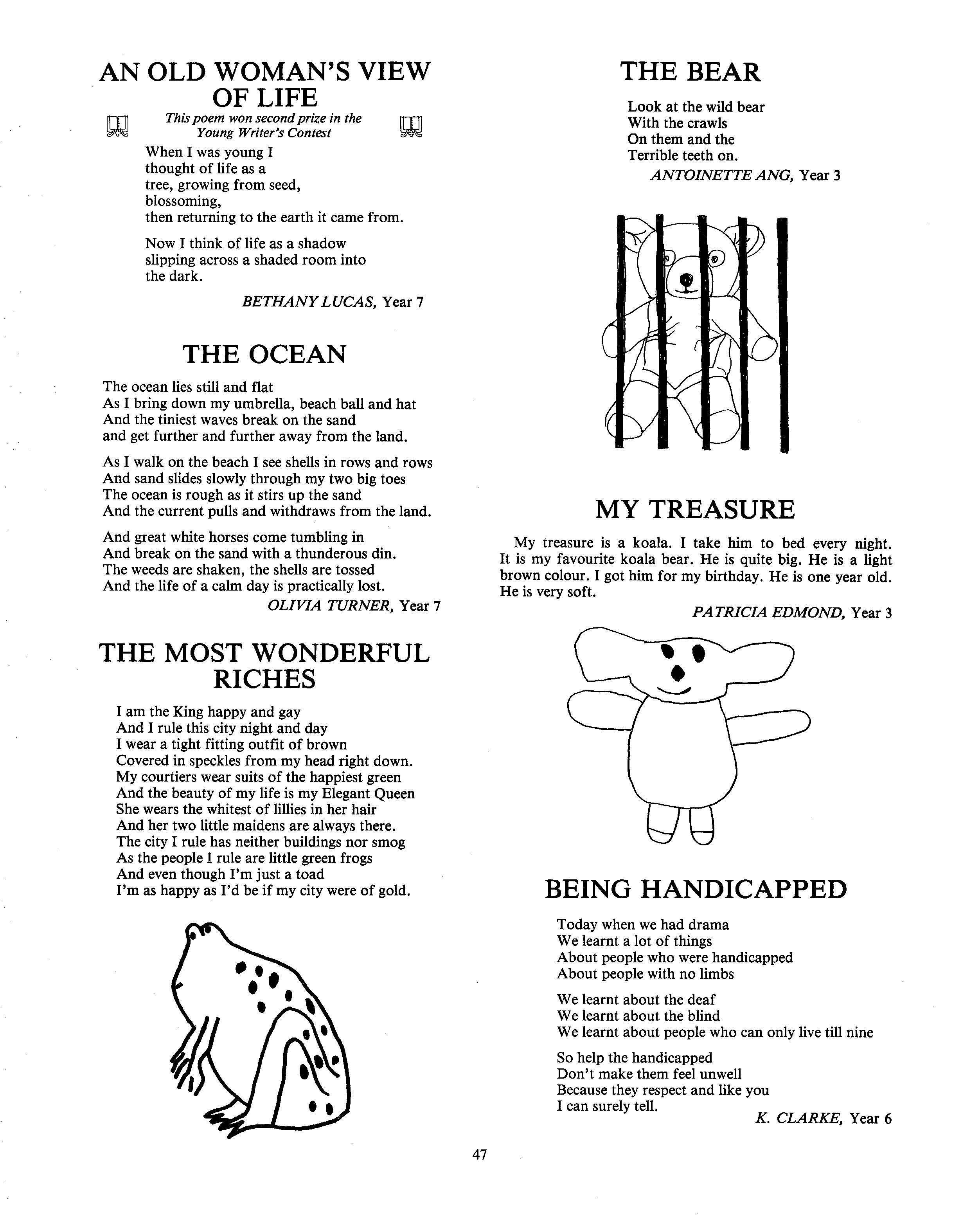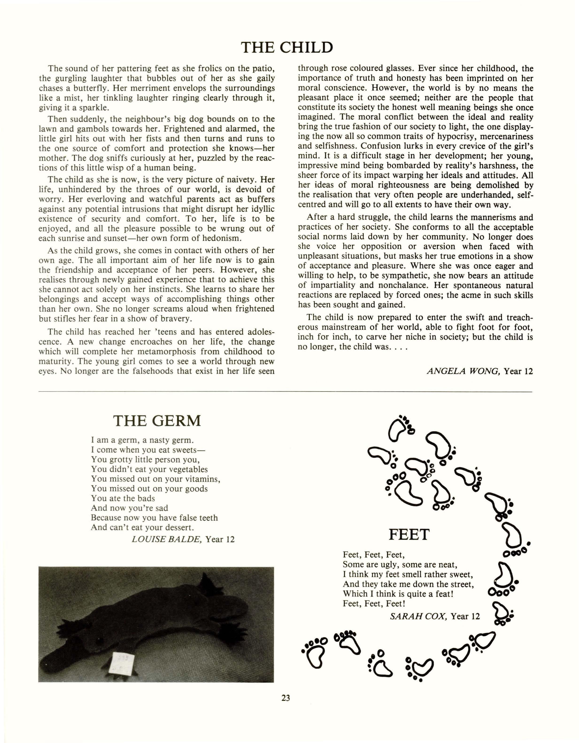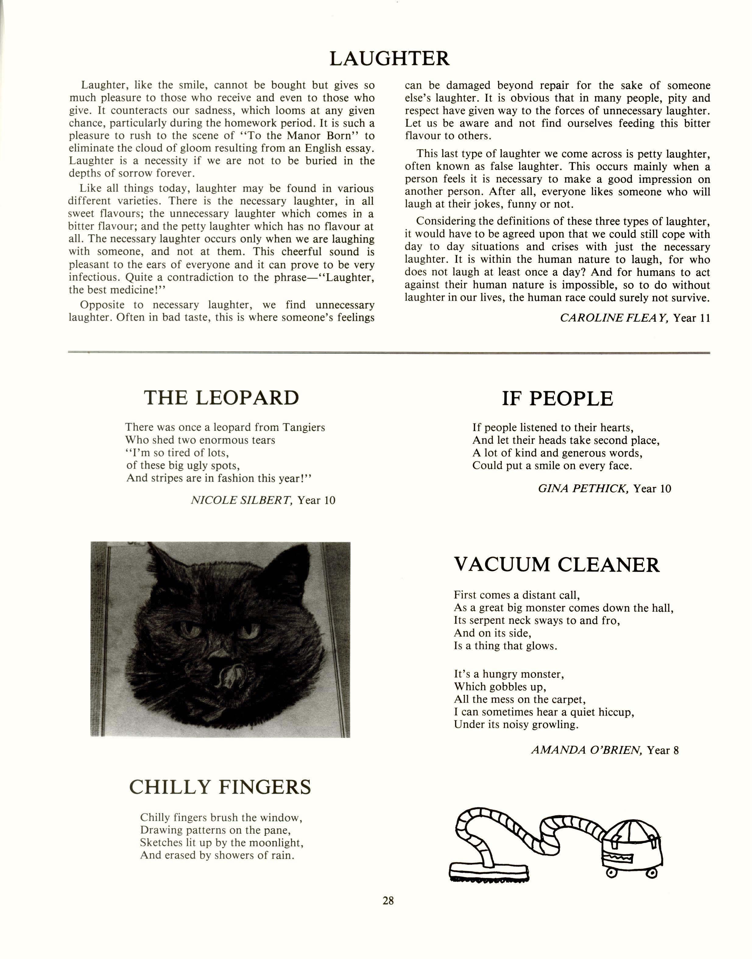 Besides being our last year at school, this year has been the Year of the Disabled with its resounding theme of "Break down the Barriers". It is for that very theme that I have chosen not to take the obvious path and let every page tell of courage, and triumph over adversity. Those poems that do tell of these things, incidentally all written by girls from the Junior School, have been placed alongside the other poems, with only their subject to set them apart from the rest. In this manner I hope to remove a brick or two from the invisible wall that divides the lucky from the unlucky.