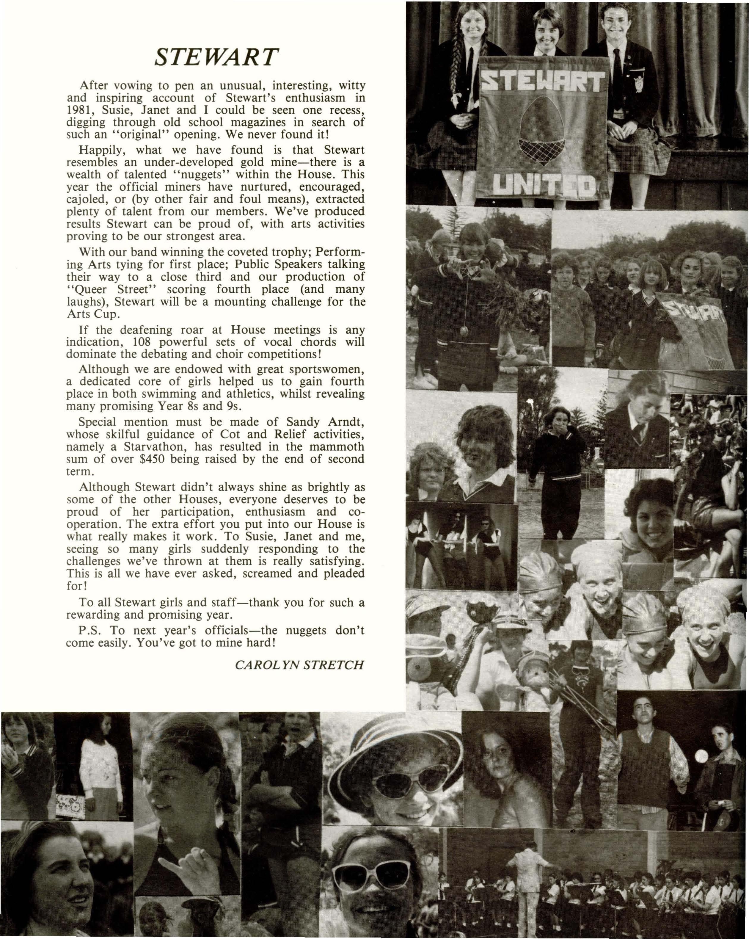Although Stewart didn't always shine as brightly as some of the other Houses, everyone deserves to be proud of her participation, enthusiasm and cooperation. The extra effort you put into our House is what really makes it work. To Susie, Janet and me, seeing so many girls suddenly responding to the challenges we've thrown at them is really satisfying. This is all we have ever asked, screamed and pleaded for!