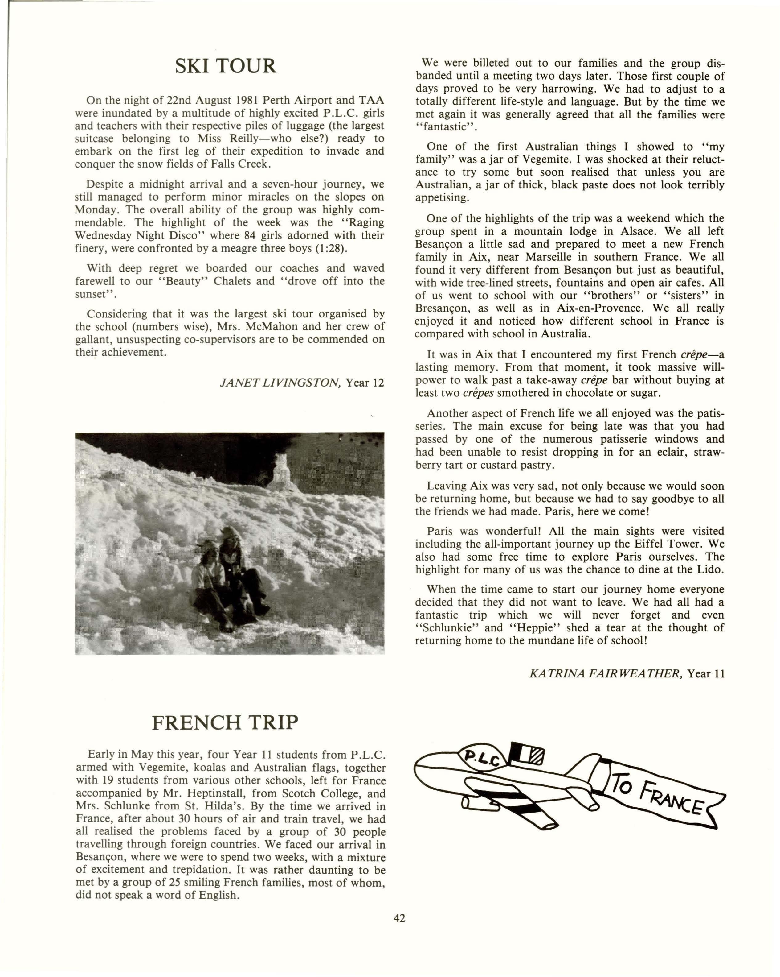 Two Year 12 girls have been fortunate enough to win exchange scholarships for 1982. Jocelyn Langley has won a Rotary Scholarship for 12 months stay in Tokyo and Ngaire Rose has won a six week scholarship to South Africa sponsored by the Lions Club.