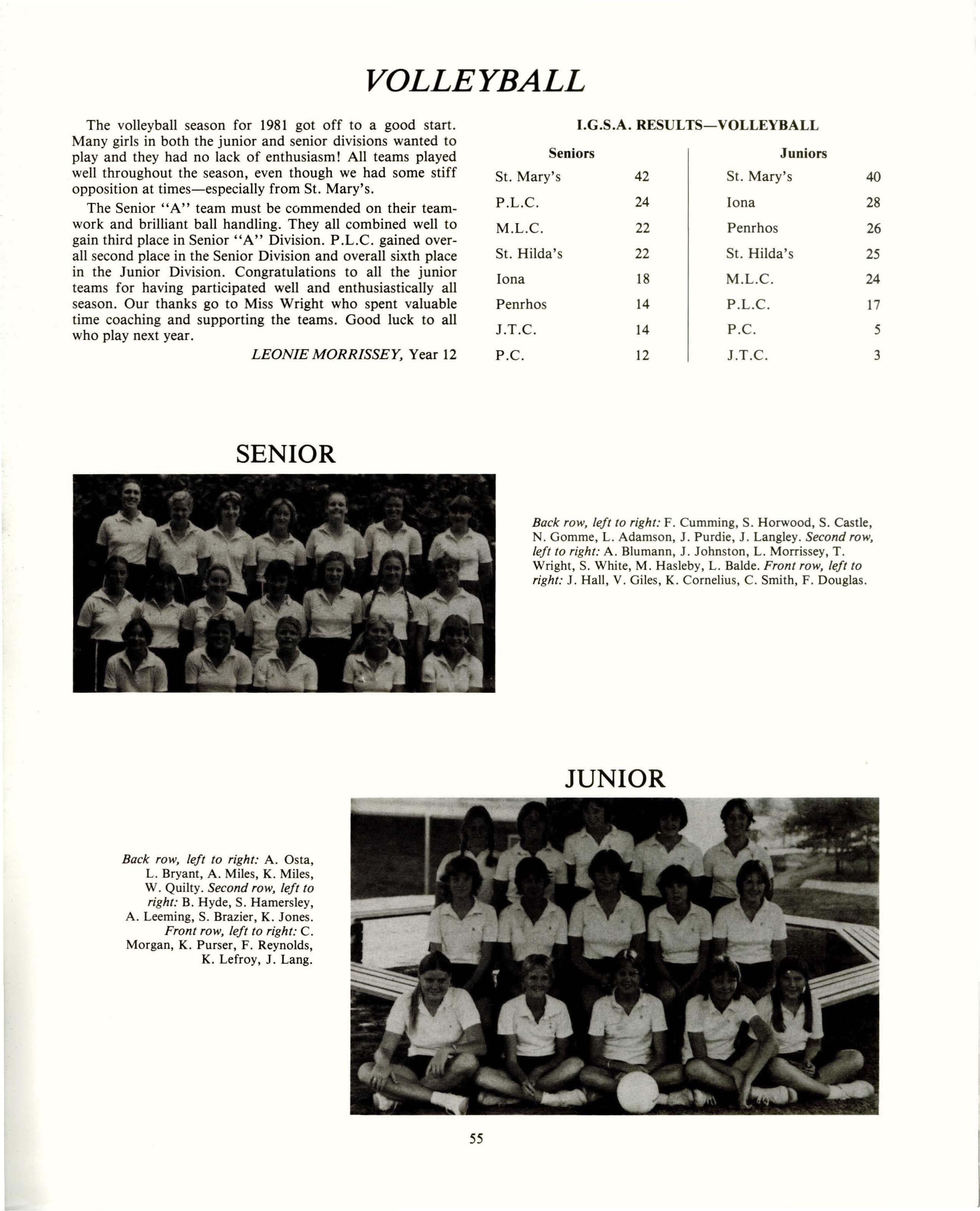 The volleyball season for 1981 got off to a good start. Many girls in both the junior and senior divisions wanted to play and they had no lack of enthusiasm! All teams played well throughout the season, even though we had some stiff opposition at times-especially from St. Mary's.