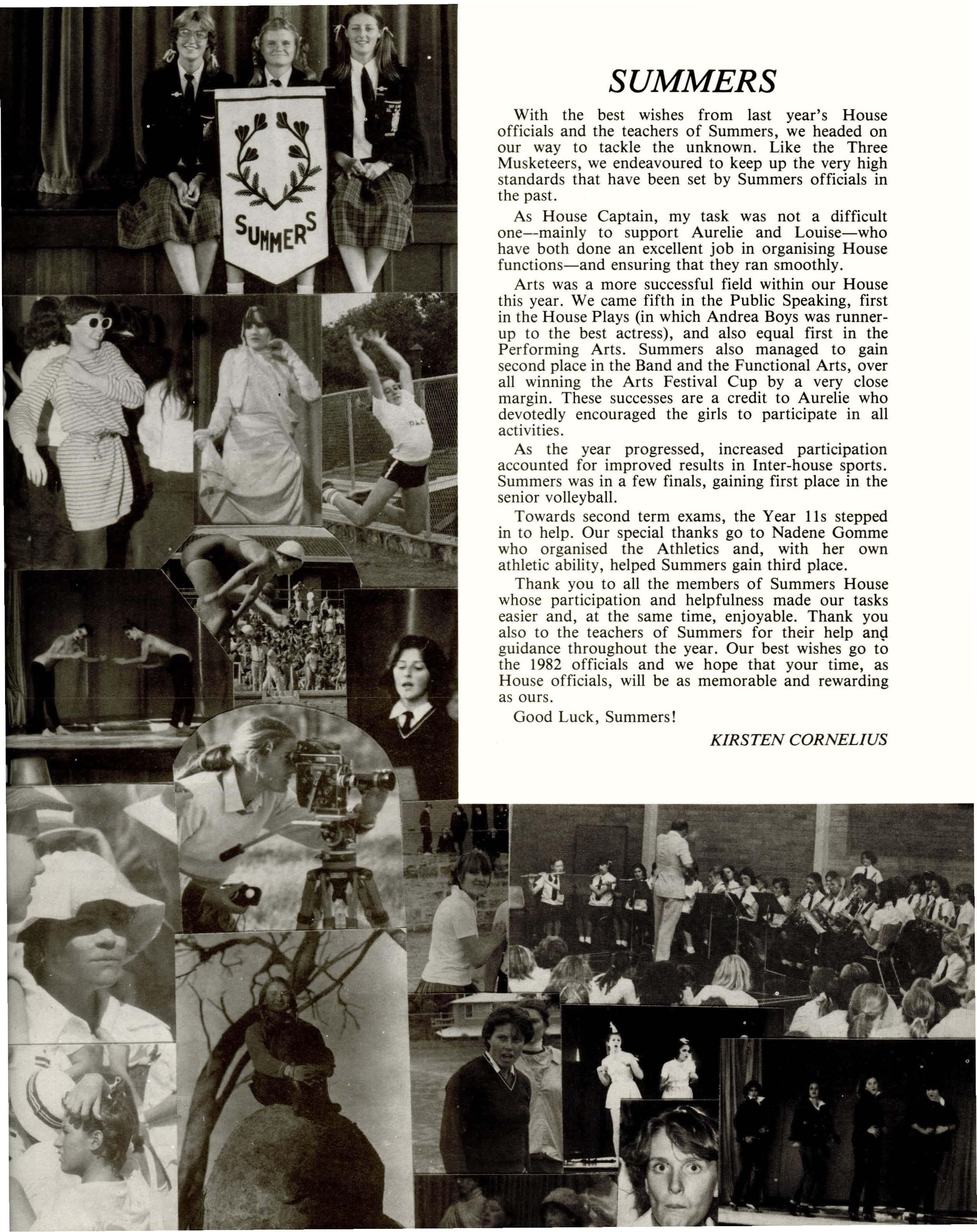 With the best wishes from last year's House officials and the teachers of Summers, we headed on our way to tackle the unknown. Like the Three Musketeers, we endeavoured to keep up the very high standards that have been set by Summers officials in the past.