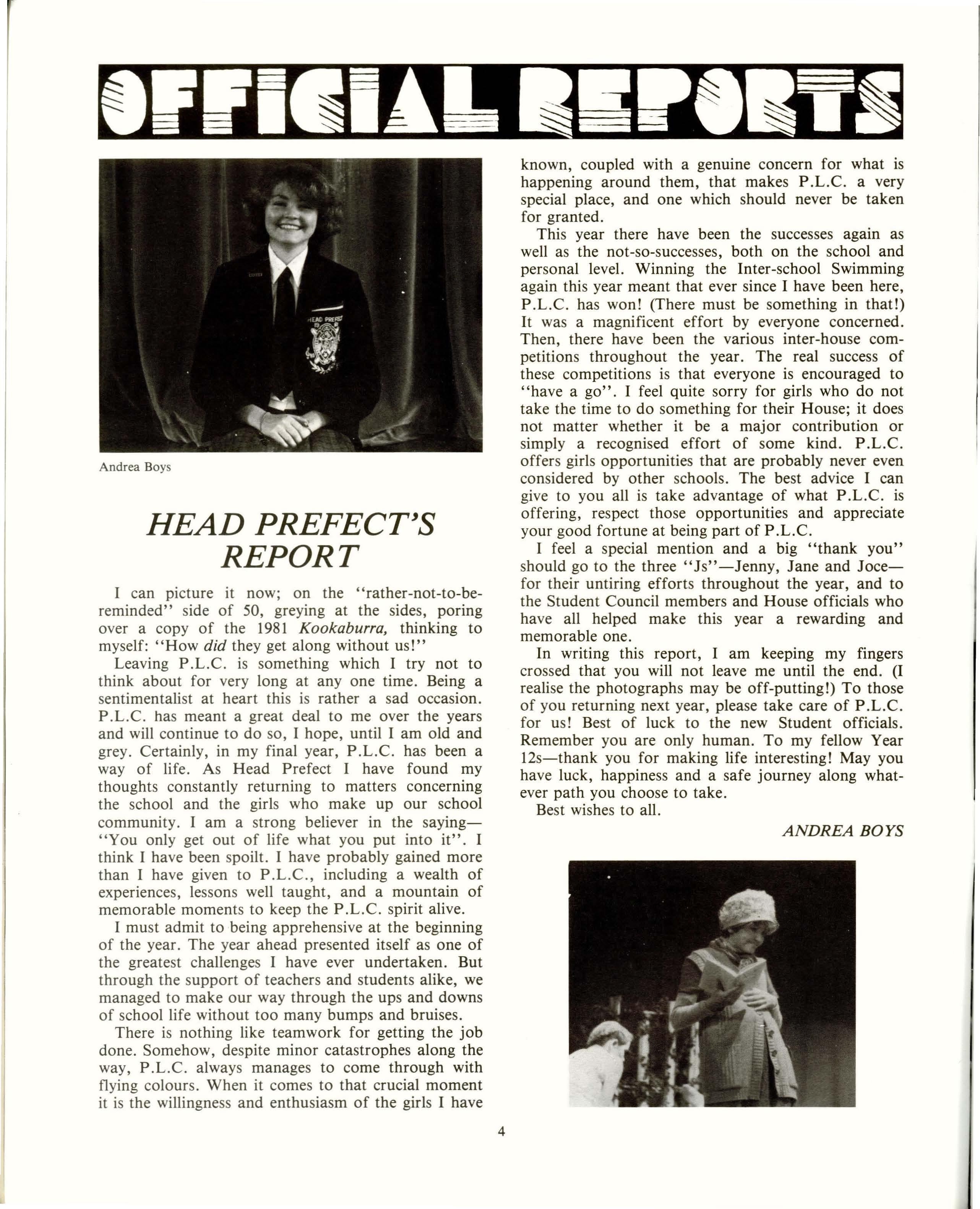 Leaving P.L.C. is something which I try not to think about for very long at anyone time. Being a sentimentalist at heart this is rather a sad occasion. P .L.C. has meant a great deal to me over the years and will continue to do so, I hope, until I am old and grey. Certainly, in my final year, P.L.C. has been a way of life. As Head Prefect I have found my thoughts constantly returning to matters concerning the school and the girls who make up our school community. I am a strong believer in the saying"You only get out of life what you put into it". I think I have been spoilt. I have probably gained more than I have given to P .L.e., including a wealth of experiences, lessons well taught, and a mountain of memorable moments to keep the P .L.C. spirit alive.
