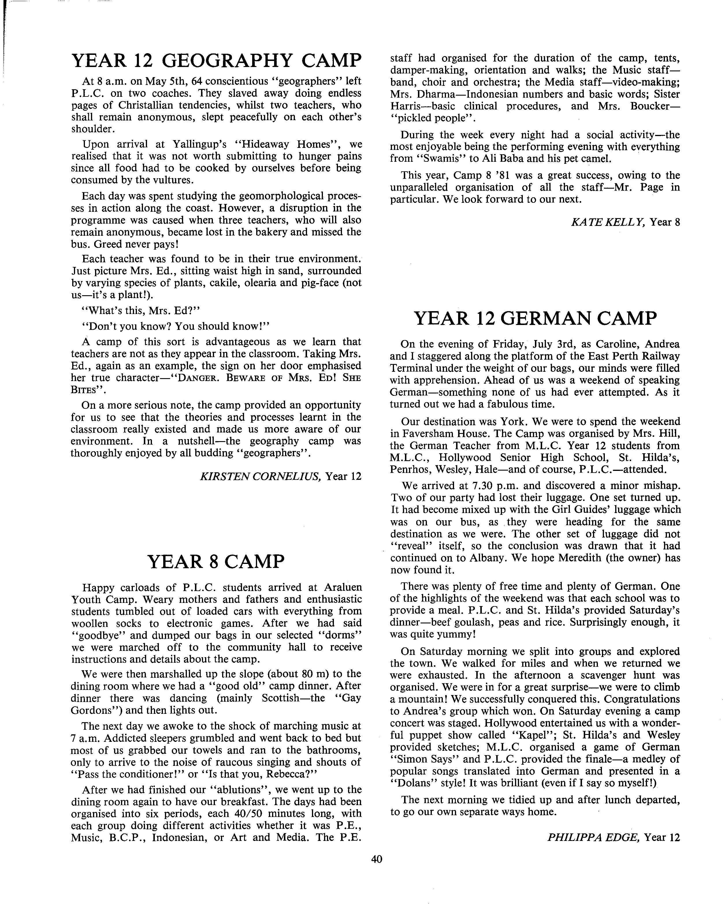 This year there have been the successes again as well as the not-so-successes, both on the school and personal level. Winning the Inter-school Swimming again this year meant that ever since I have been here, P.L.C. has won! (There must be something in that!) It was a magnificent effort by everyone concerned. Then, there have been the various inter-house competitions throughout the year. The real success of these competitions is that everyone is encouraged to "have a go". I feel quite sorry for girls who do not take the time to do something for their House; it does not matter whether it be a major contribution or simply a recognised effort of some kind. P .L.C. offers girls opportunities that are probably never even considered by other schools. The best advice I can give to you all is take advantage of what P .L.C. is offering, respect those opportunities and appreciate your good fortune at being part of P .L.C.