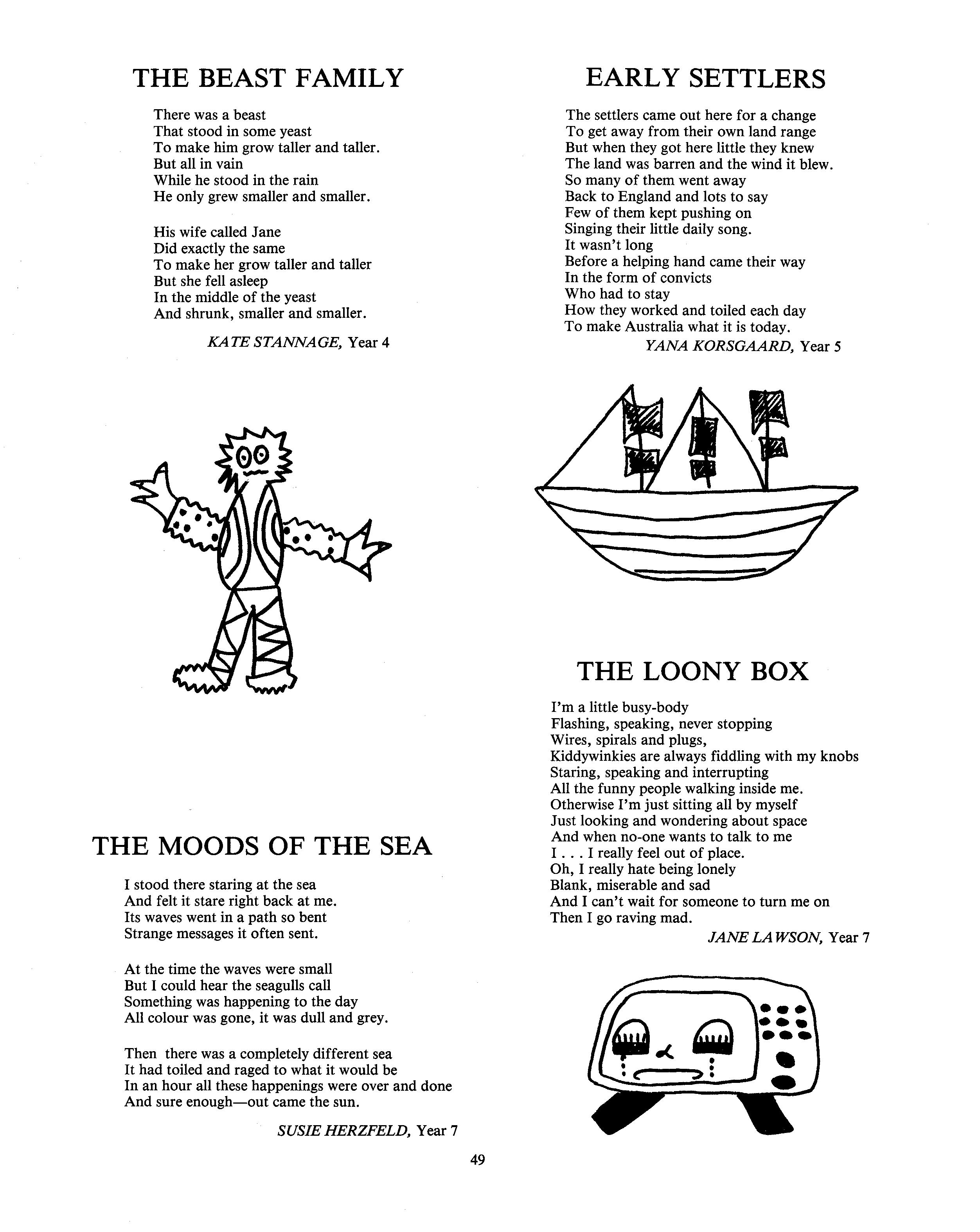 The House play "Passion, Poison and Petrification" was a fine production and earned McNeil third place. Congratulations to the cast and to Beth, who put a lot of hard work and worry into it. The Performing Arts were overrun by McNeil. We gained r..early half of the number of firsts, yet came equal first with two other Houses. We had our usual "Arts Festival Regulars" who contributed much with the help of others. The Functional Arts was not as much of a hit, though there were some good individual performers-of whom Gill Warden was one. Our thanks to the Year 11 deputies who helped Beth in the never-ending organisation of the Arts.