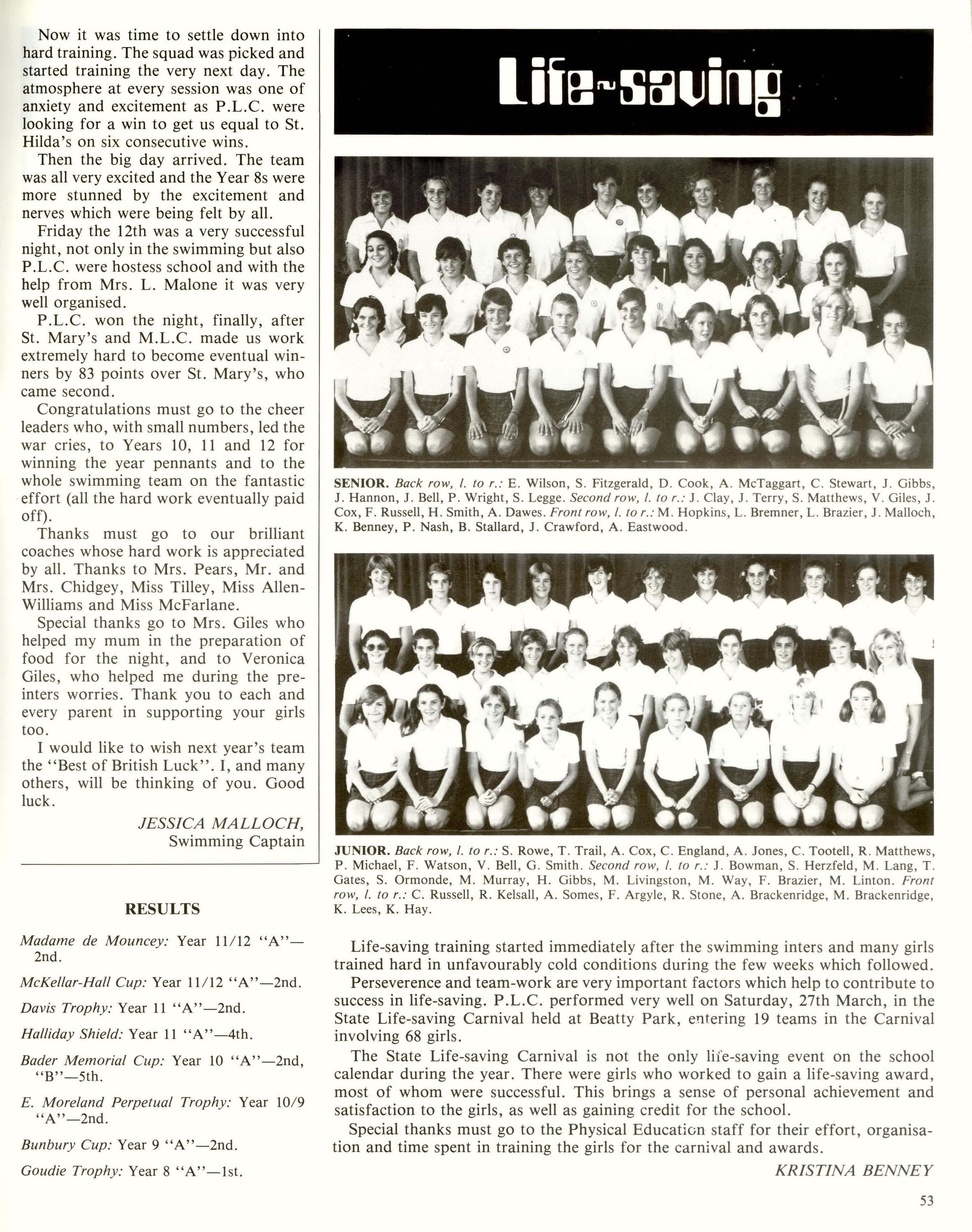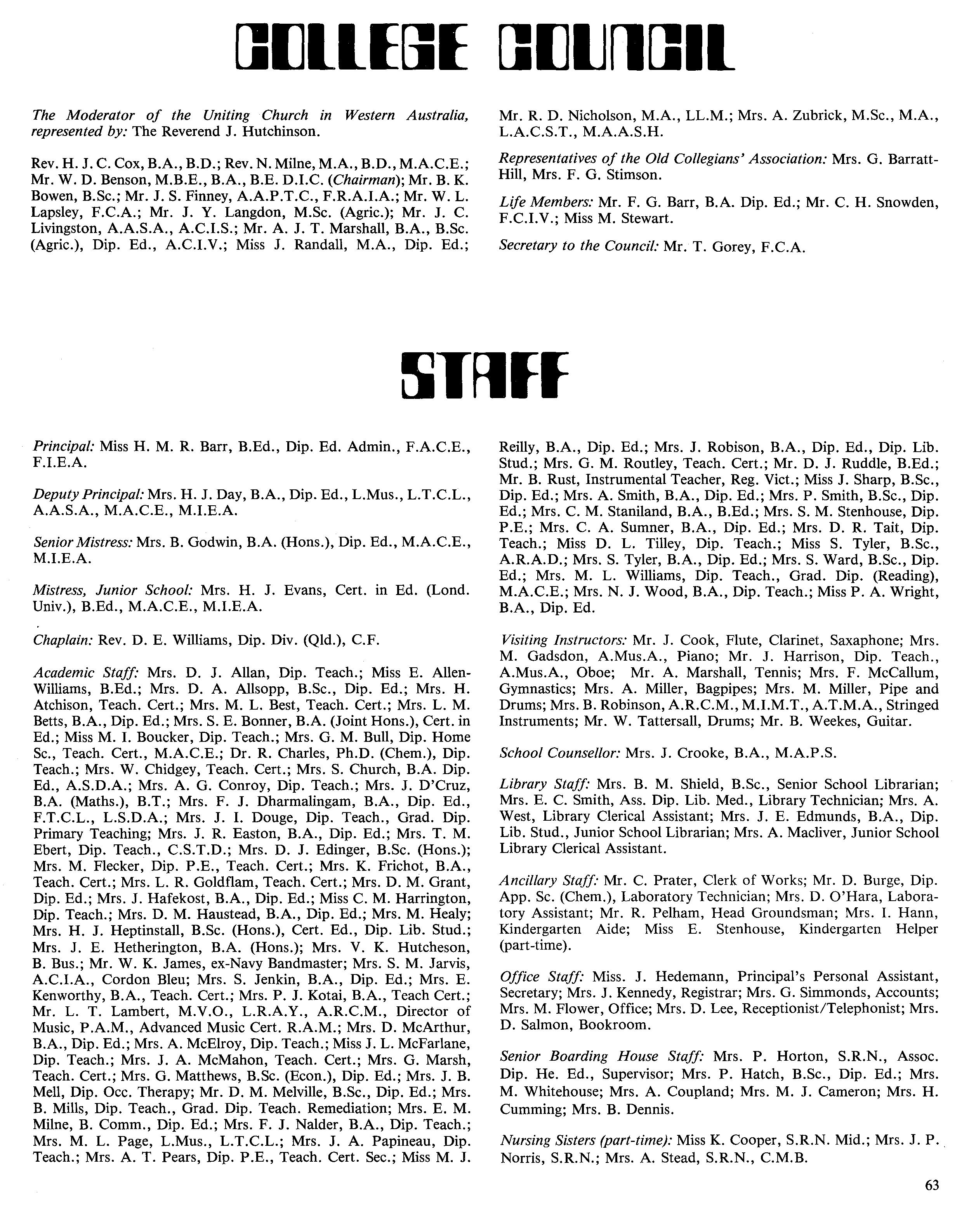 Academic Staff: Mrs. D. J. Allan, Dip. Teach.; Miss E. AllenWilliams, B.Ed.; Mrs. D. A. Allsopp, B.Sc., Dip. Ed.; Mrs. H. Atchison, Teach. Cert.; Mrs. M. L. Best, Teach. Cert.; Mrs. L. M. Betts, B.A., Dip. Ed.; Mrs. S. E. Bonner, B.A. (Joint Hons.), Cert. in Ed.; Miss M. L Boucker, Dip. Teach.; Mrs. G. M. Bull, Dip. Home Sc., Teach. Cert., M.A.C.E.; Dr. R. Charles, Ph.D. (Chern.), Dip. Teach.; Mrs. W. Chidgey, Teach. Cert.; Mrs. S. Church, B.A. Dip. Ed., A.S.D.A.; Mrs. A. G. Conroy, Dip. Teach.; Mrs. J. D'Cruz, B.A. (Maths.), B.T.; Mrs. F. J. Dharmalingam, B.A., Dip. Ed., F.T.C.L., L.S.D.A; Mrs. J. L Douge, Dip. Teach., Grad. Dip. Primary Teaching; Mrs. J. R. Easton, B.A, Dip. Ed.; Mrs. T. M. Ebert, Dip. Teach., C.S.T.D.; Mrs. D. J. Edinger, B.Sc. (Hons.); Mrs. M. Flecker, Dip. P.E., Teach. Cert.; Mrs. K. Frichot, B.A, Teach. Cert.; Mrs. L. R. Goldflam, Teach. Cert.; Mrs. D. M. Grant, Dip. Ed.; Mrs. J. Hafekost, B.A, Dip. Ed.; Miss C. M. Harrington, Dip. Teach.; Mrs. D. M. Haustead, B.A, Dip. Ed.; Mrs. M. Healy; Mrs. H. J. Heptinstall, B.Sc. (Hons.), Cert. Ed., Dip. Lib. Stud.; Mrs. J. E. Hetherington, B.A. (Hons.); Mrs. V. K. Hutcheson, B. Bus.; Mr. W. K. James, ex-Navy Bandmaster; Mrs. S. M. Jarvis, A.C.I.A., Cordon Bleu; Mrs. S. Jenkin, B.A, Dip. Ed.; Mrs. E. Kenworthy, B.A., Teach. Cert.; Mrs. P. J. Kotai, B.A., Teach Cert.; Mr. L. T. Lambert, M.V.O., L.R.A.Y., A.R.C.M., Director of Music, P.A.M., Advanced Music Cert. R.A.M.; Mrs. D. McArthur, B.A., Dip. Ed.; Mrs. A. McElroy, Dip. Teach.; Miss J. L. McFarlane, Dip. Teach.; Mrs. J. A McMahon, Teach. Cert.; Mrs. G. Marsh, Teach. Cert.; Mrs. G. Matthews, B.Sc. (Econ.), Dip. Ed.; Mrs. J. B. Mell, Dip. Occ. Therapy; Mr. D. M. Melville, B.Sc., Dip. Ed.; Mrs. B. Mills, Dip. Teach., Grad. Dip. Teach. Remediation; Mrs. E. M. Milne, B. Comm., Dip. Ed.; Mrs. F. J. Nalder, B.A., Dip. Teach.; Mrs. M. L. Page, L.Mus., L.T.C.L.; Mrs. J. A Papineau, Dip. Teach.; Mrs. A. T. Pears, Dip. P.E., Teach. Cert. Sec.; Miss M. J.