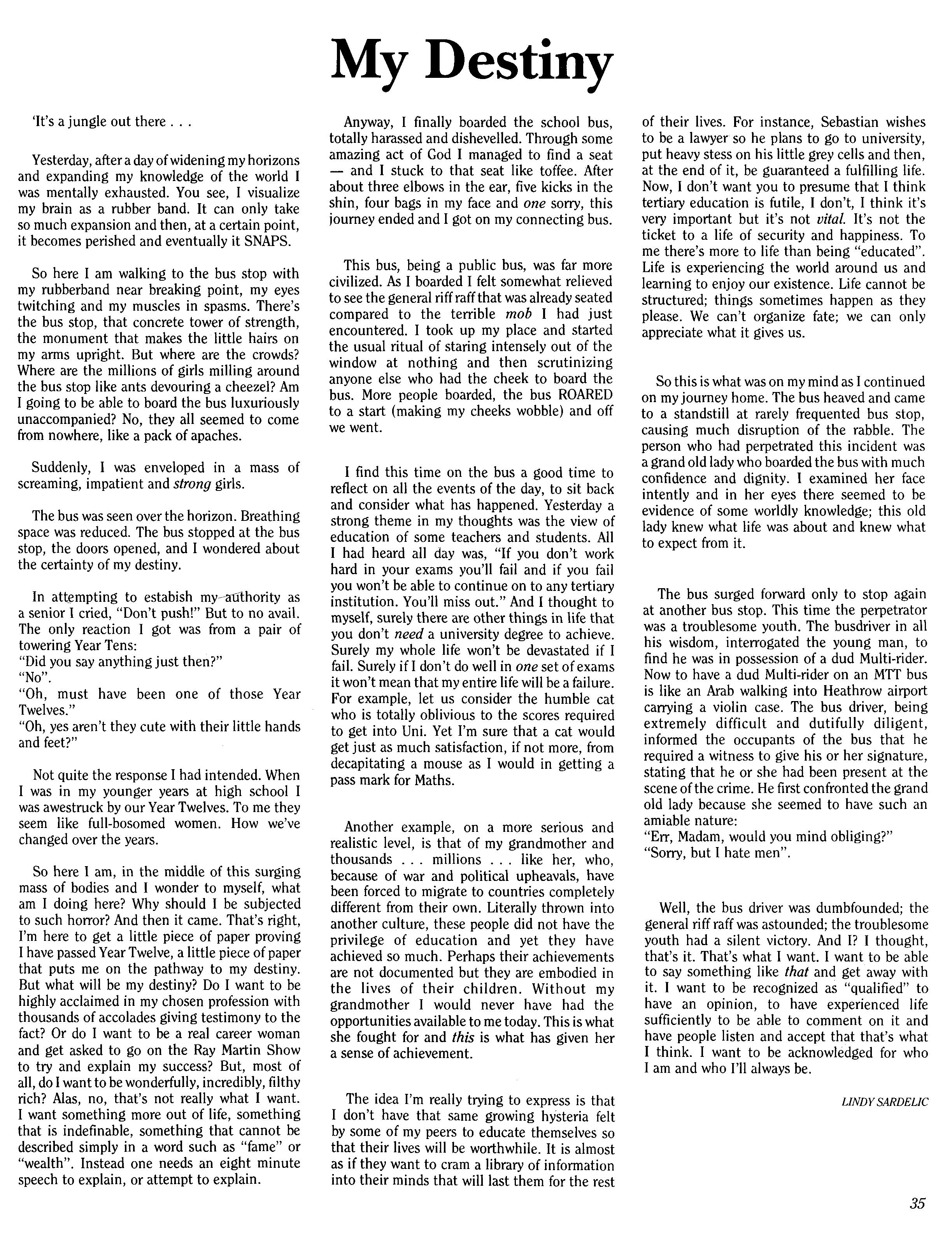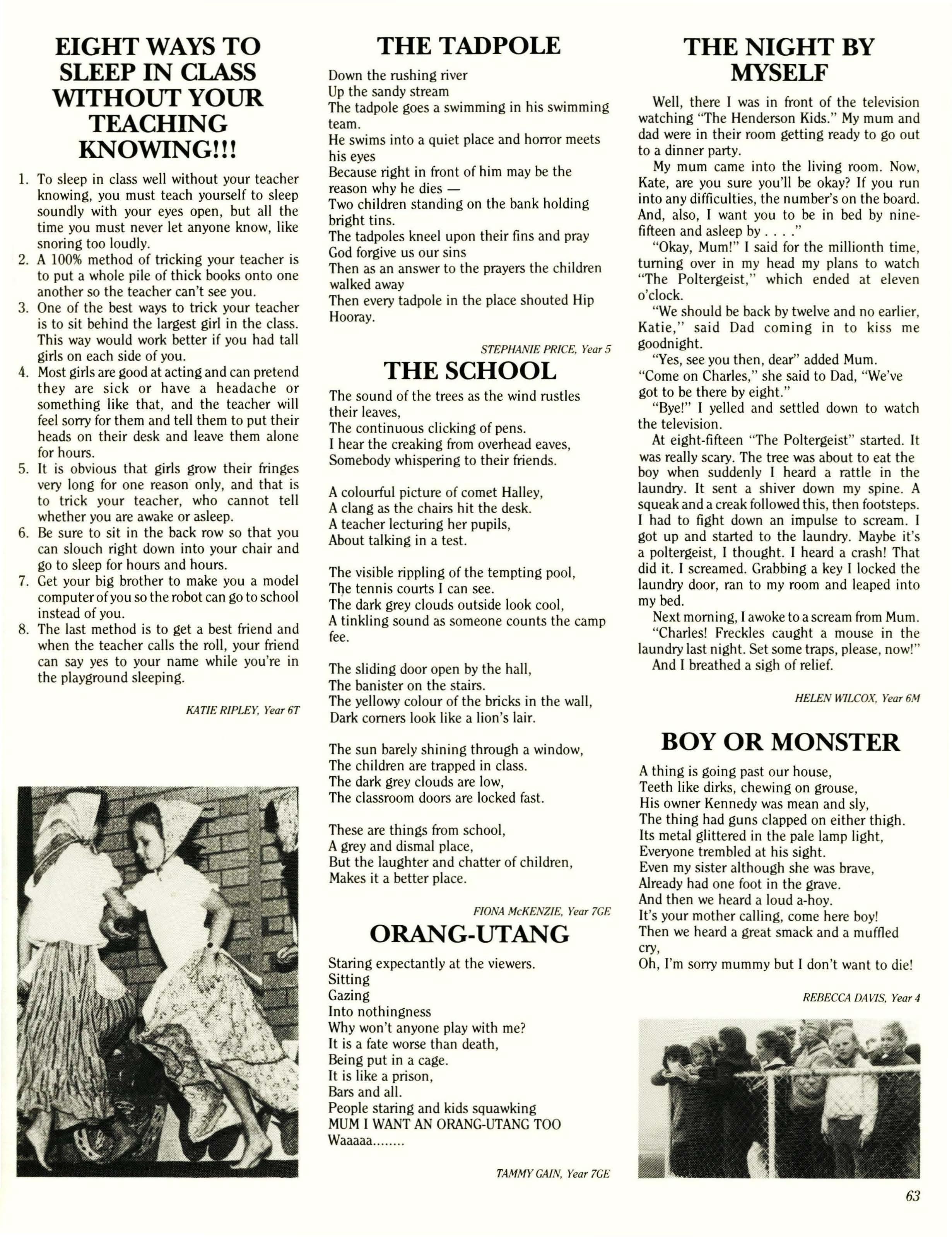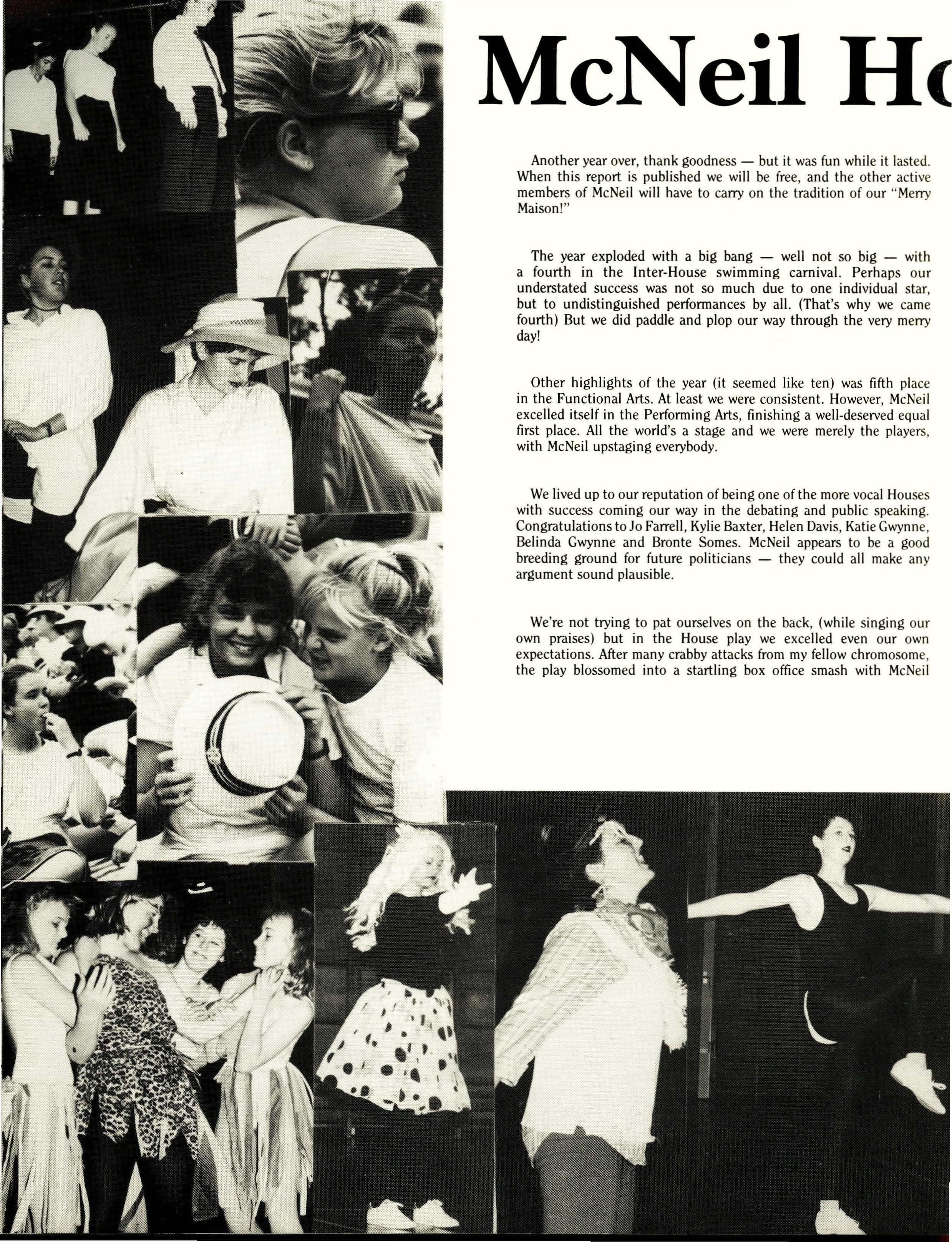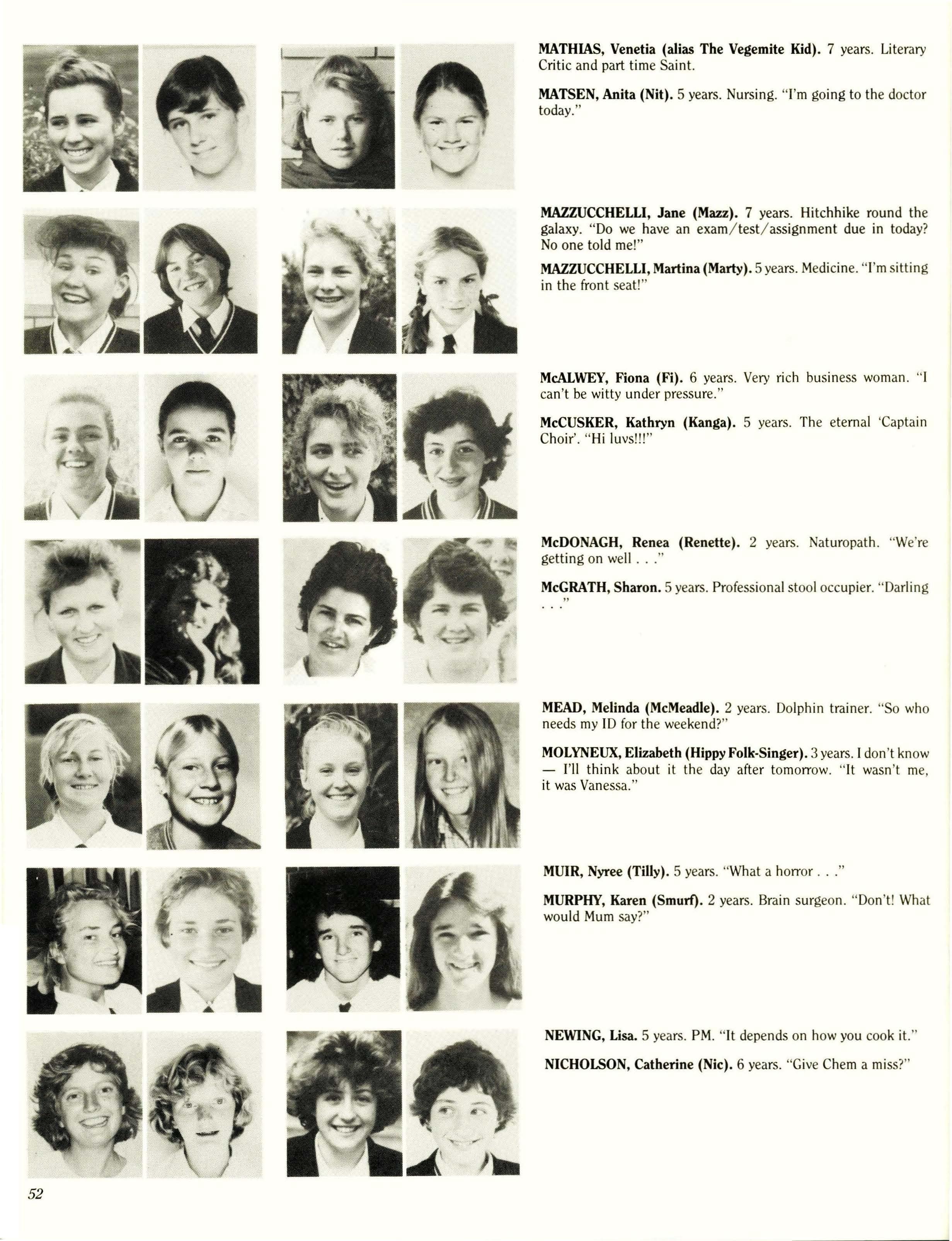 Of course "Kookaburra" added to our P.L.C. Year-of-no-peace-at-all. All those involved have had a slightly harrassing time. Thanks must be extended to Mrs McArthur and Mrs McMahon, and also to the secretaries, particularly Simone, who deserves a special Award for Patience. To all of those who have laboured on the "Kookaburra" Committee, as well as those now famous - or infamousphotographers, Cathie and Paula, you have my gratitude, as well as any other appropriate word in the Thesaurus.