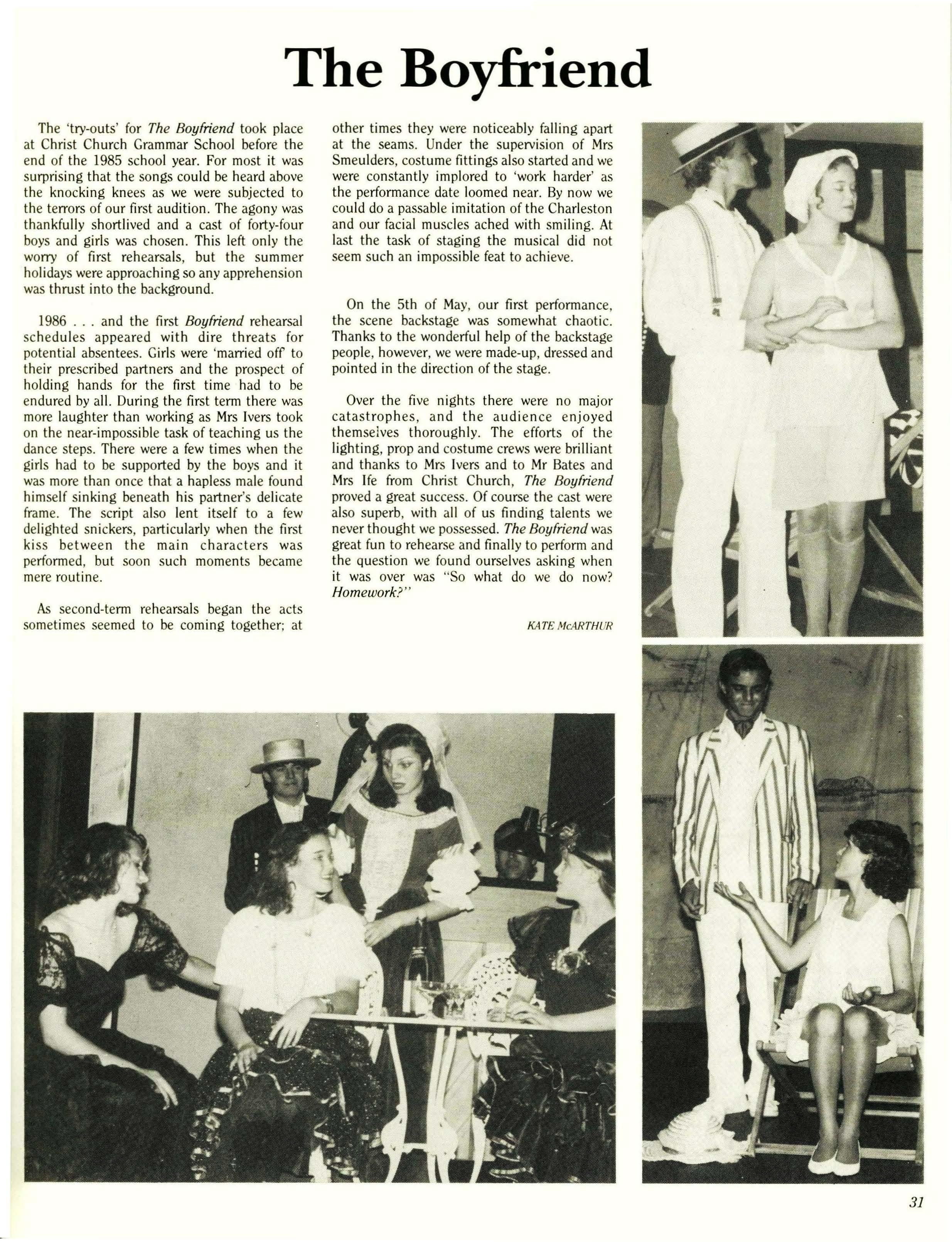 Such enthusiasm and School feeling has been displayed on countless occasions during the year. An extremely high standard of performance was displayed in various Inter-House and InterSchool competitions, in the musical 'The Boyfriend' with Christ Church and the Boardwalk Festival.