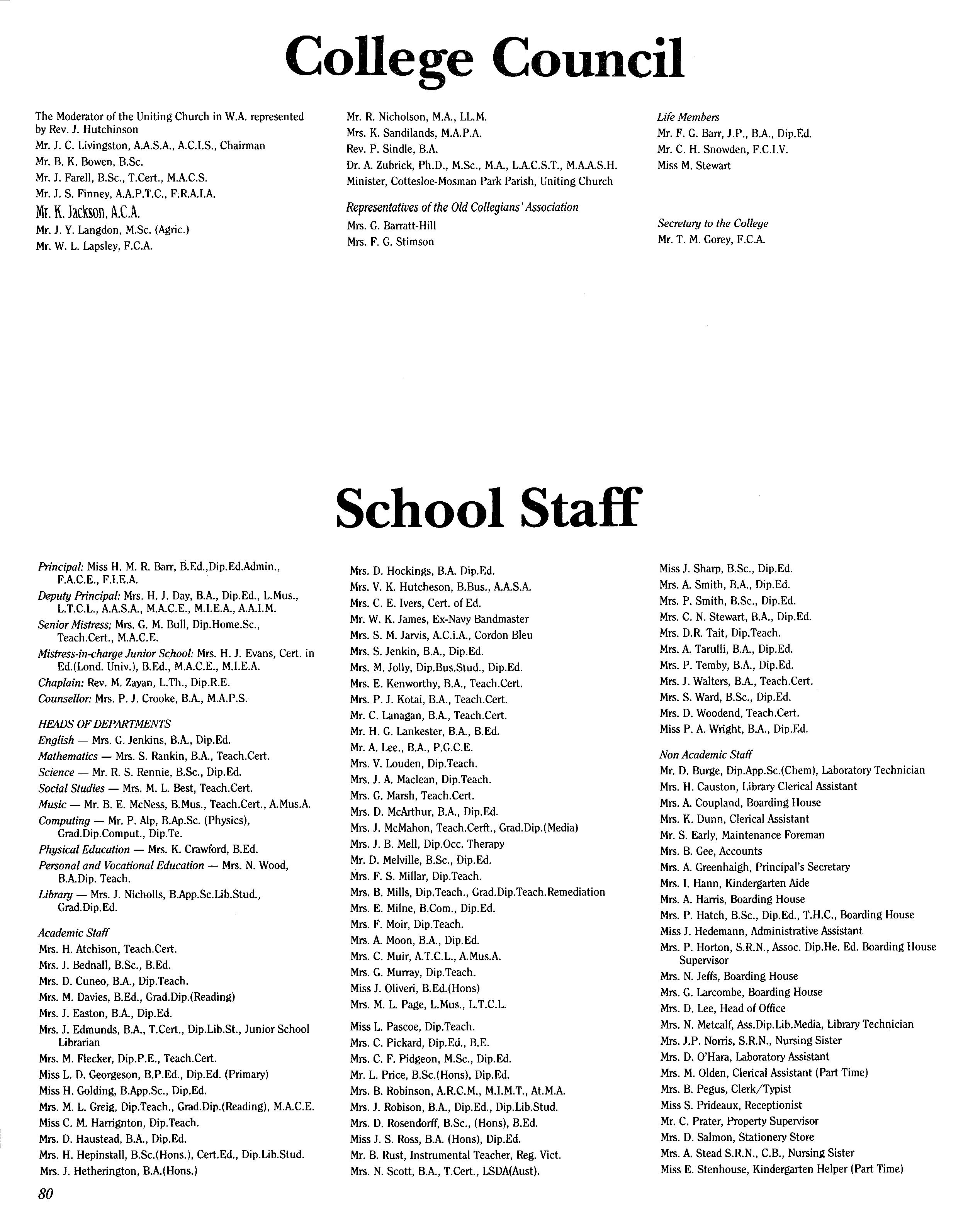 The Official Party entered and after our School hymn and prayers from Reverend Zayan, we were addressed briefly by the Chairman of the School Council, Mr J. Livingston. Then Miss Barr gave the annual Principal's Report in which she summarized the year's events. Miss Barr was followed by the Moderator, Miss Beryl Grant.