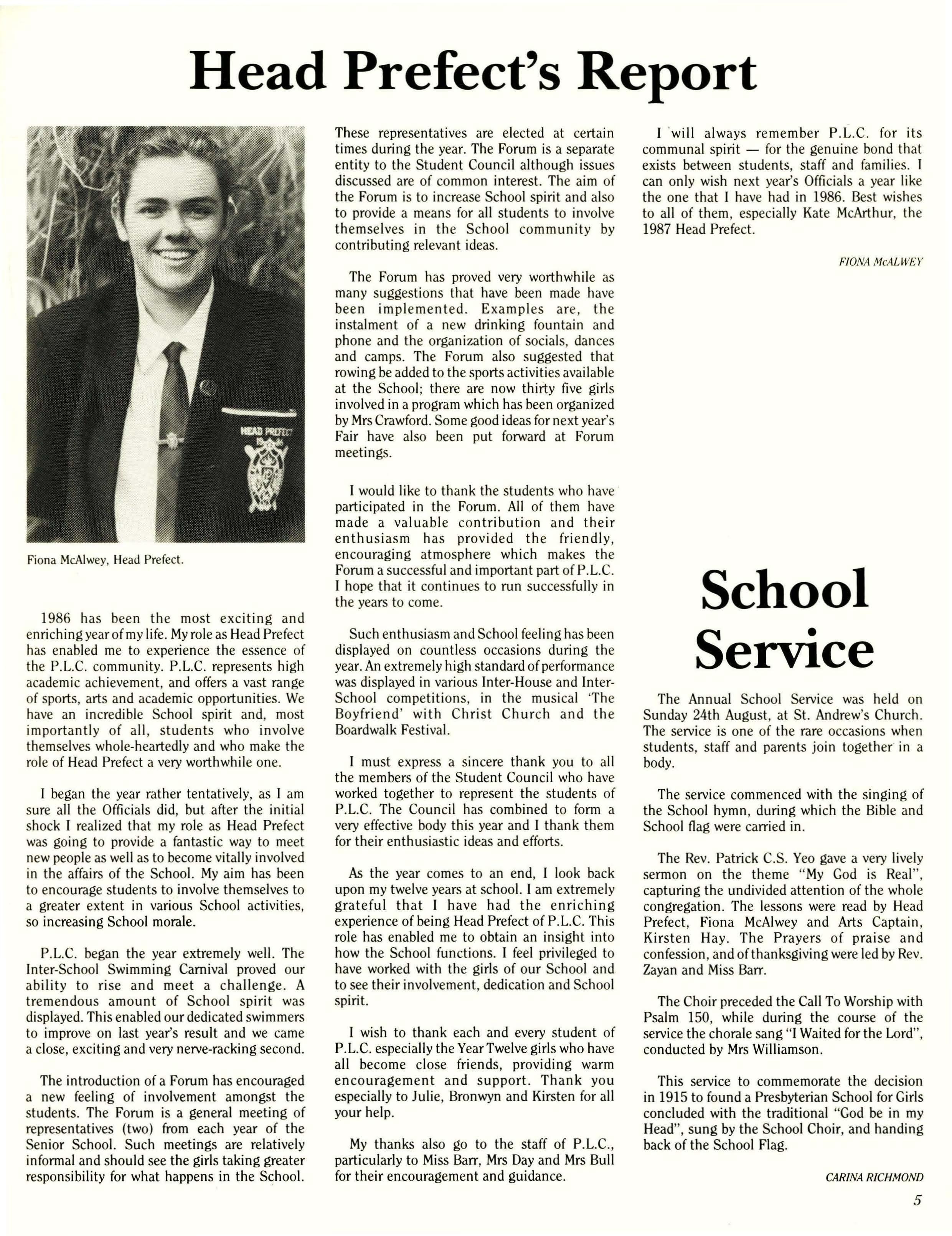 I 'will always remember P.L.C. for its communal spirit - for the genuine bond that exists between students, staff and families. I can only wish next year's Officials a year like the one that I have had in 1986. Best wishes to all of them, especially Kate McArthur, the 1987 Head Prefect.