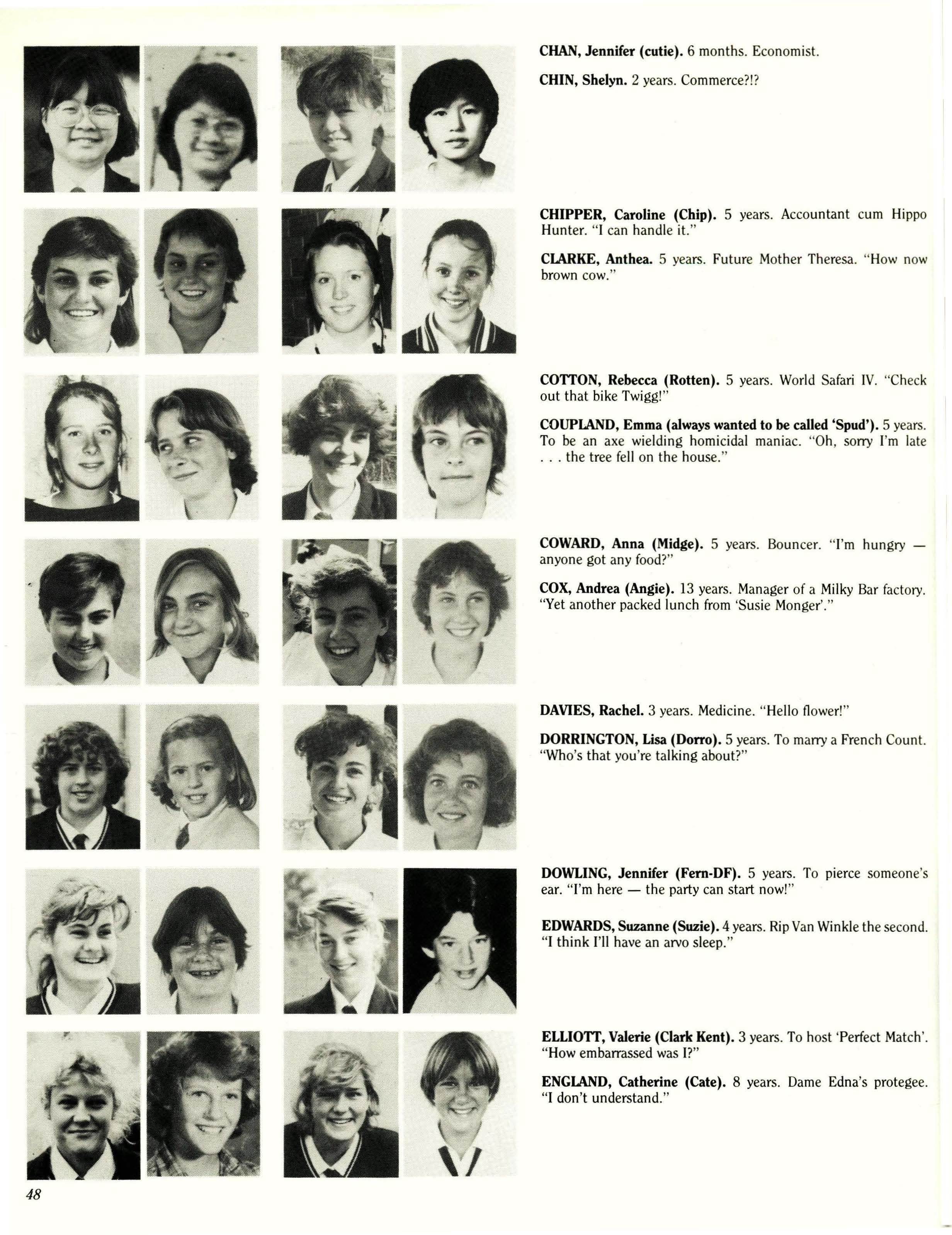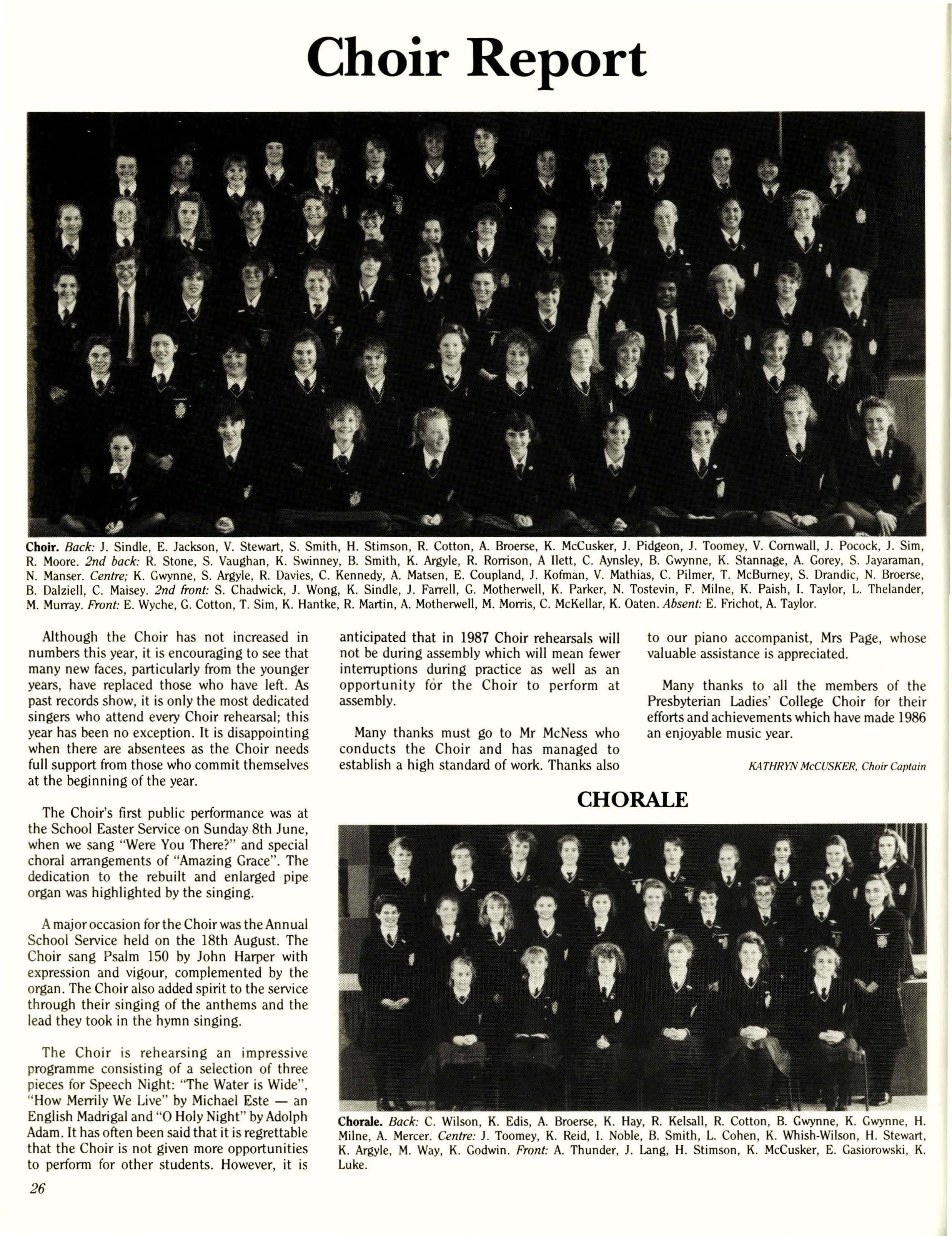Well, the 1986 Cot and Relief team has completed its term of office. The "Terrific Ten" who worked so hard all year to achieve what sometimes seemed the impossible cannot go unmentioned. My thanks go to lemma Hardie (Baird), Kerri Whish-Wilson and Jo Thom (Carmichael), Venetia Mathias and Rachel Davies (McNeil), Sandie Stewart and Romola Buhler (Stewart) and Robyn and Kathryn White (Summers). The tenth whose support has been greatly appreciated is Miss Wright. She gave up a lot of time to attend our meetings and to handle the correspondence from the various organizations and sponsored children who write to us.