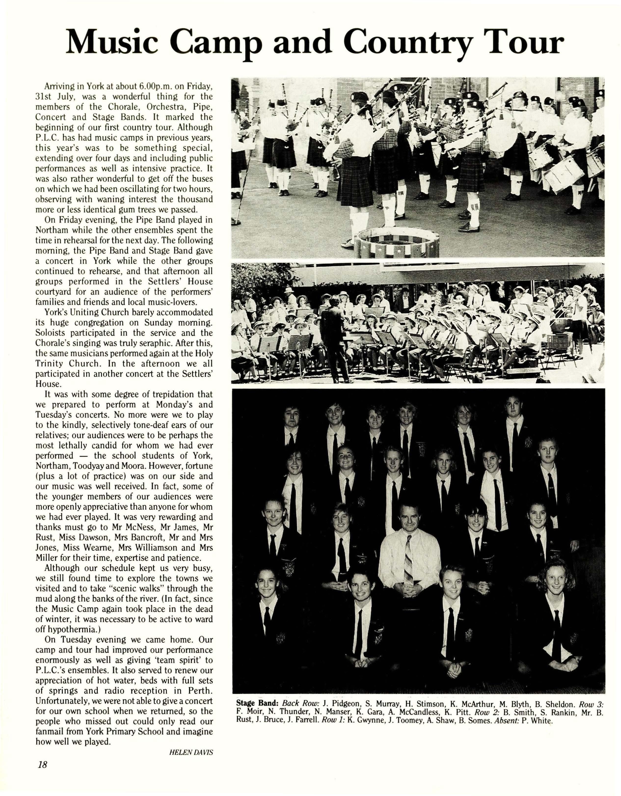 Although P.L.C. is a school of many traditions, this year saw some new developments. One was the Music Tour. P.L.C.'s musical ensembles spent four days performing in country towns and strengthening our feeling of camaraderie. Another momentous occasion