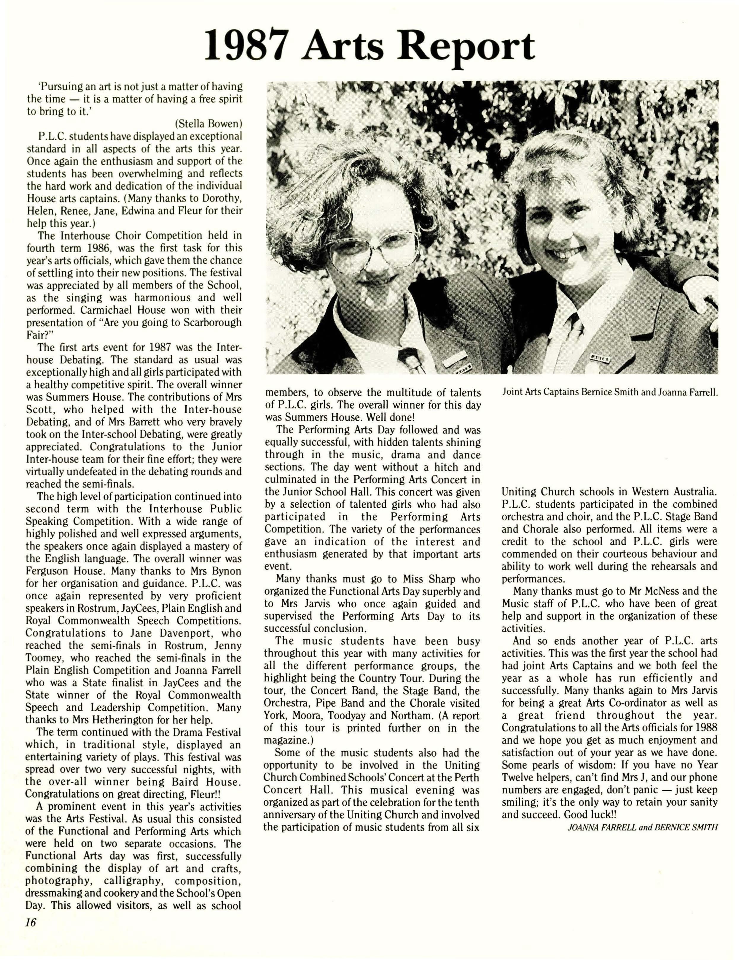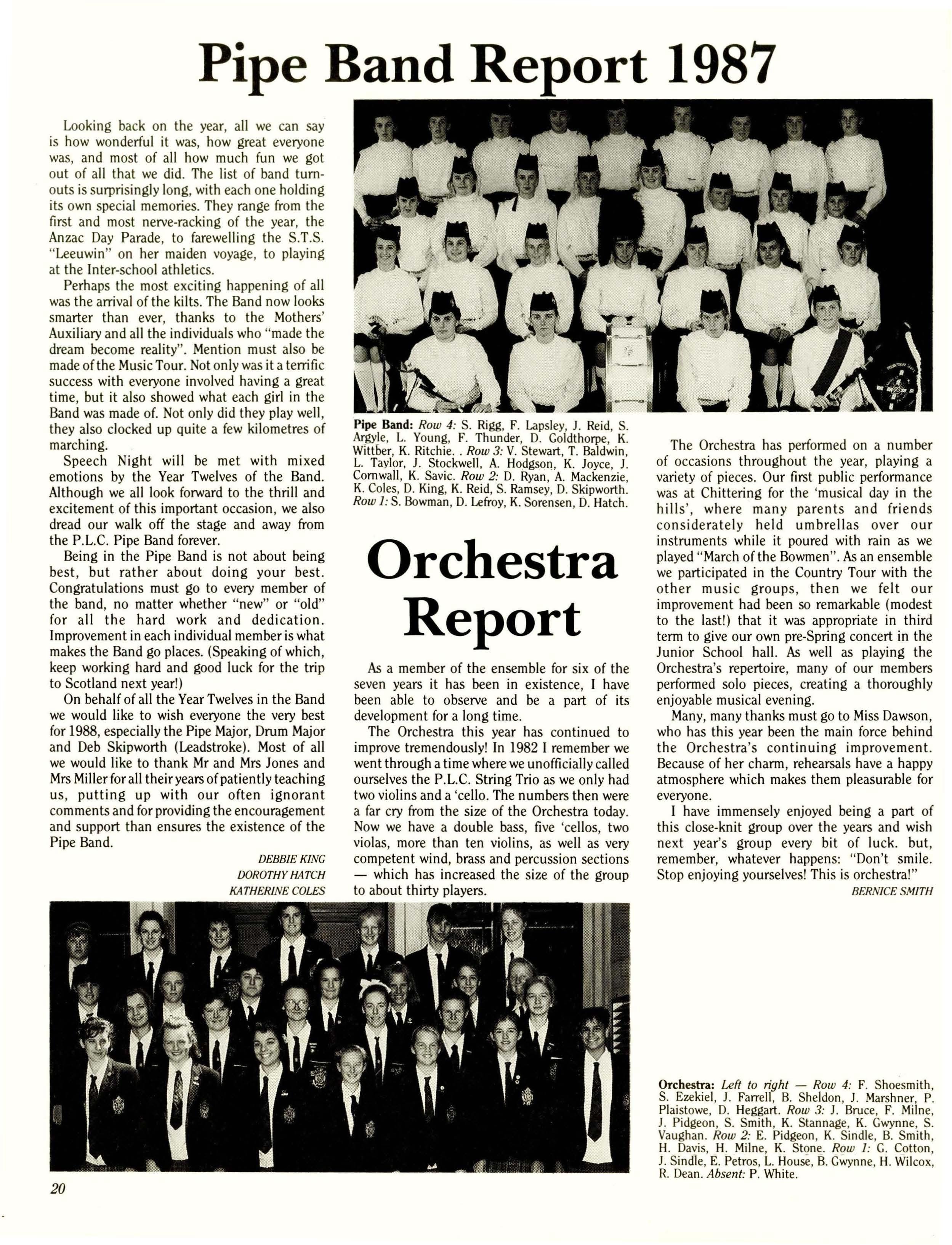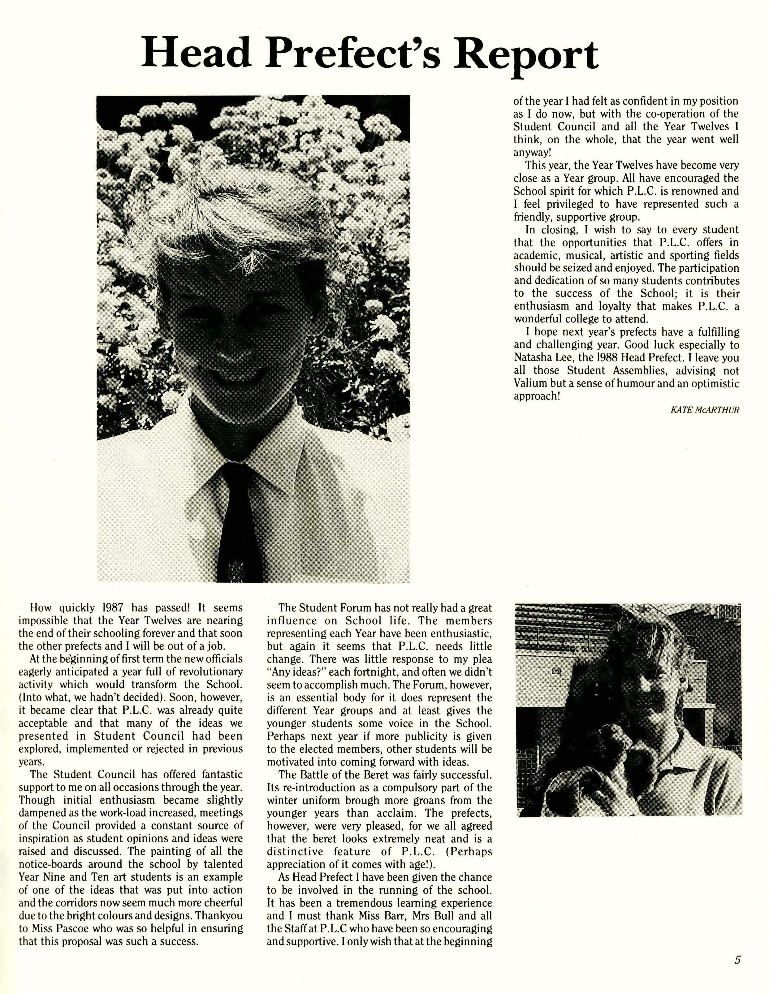 How quickly 1987 has passed! It seems impossible that the Year Twelves are nearing the end of their schooling forever and that soon the other prefects and I will be out of a job. At the be'ginning of first term the new officials eagerly anticipated a year full of revolutionary activity which would transform the School. (Into what, we hadn't decided). Soon, however, it became clear that P.L.C. was already quite acceptable and that many of the ideas we presented in Student Council had been explored, implemented or rejected in previous years.