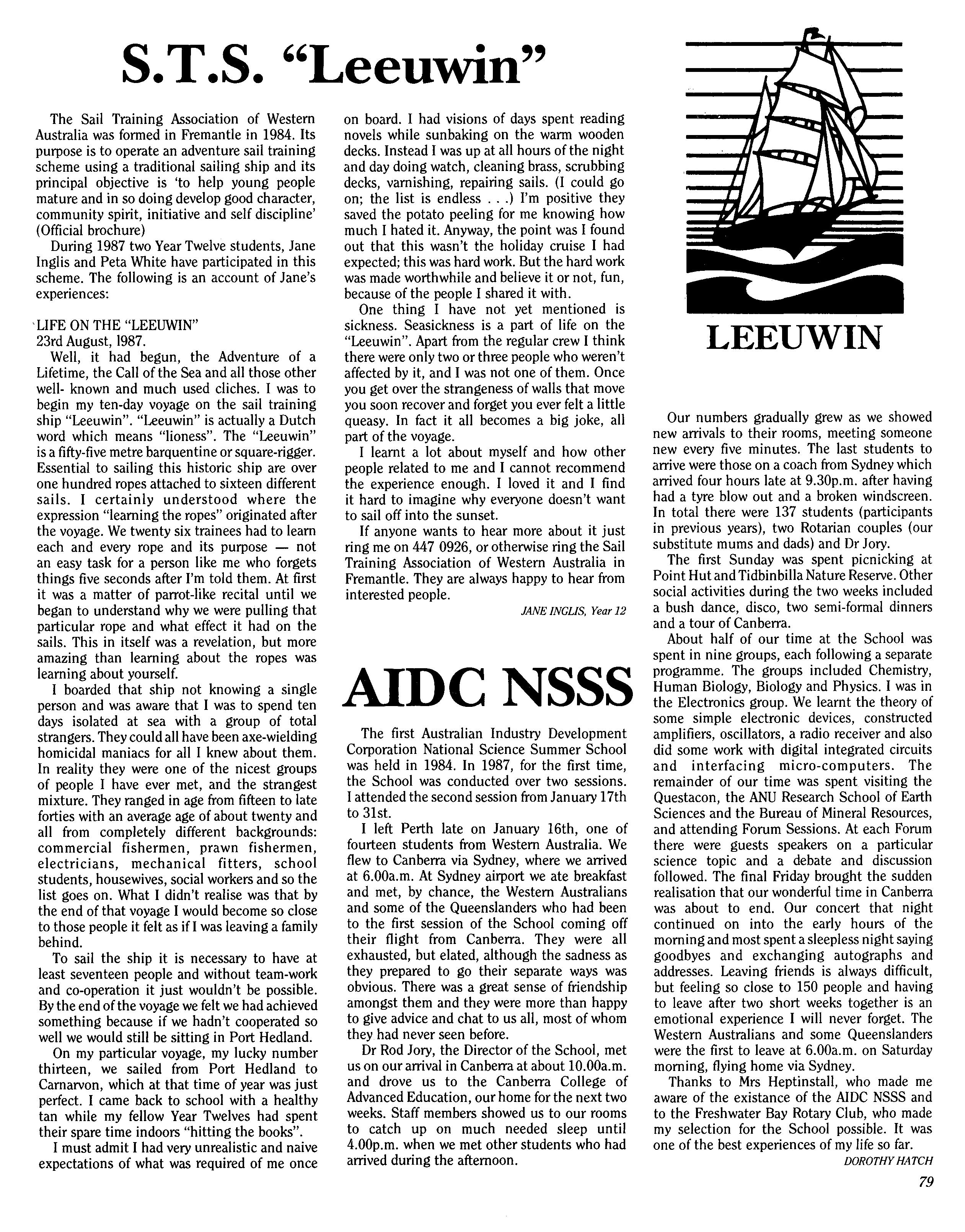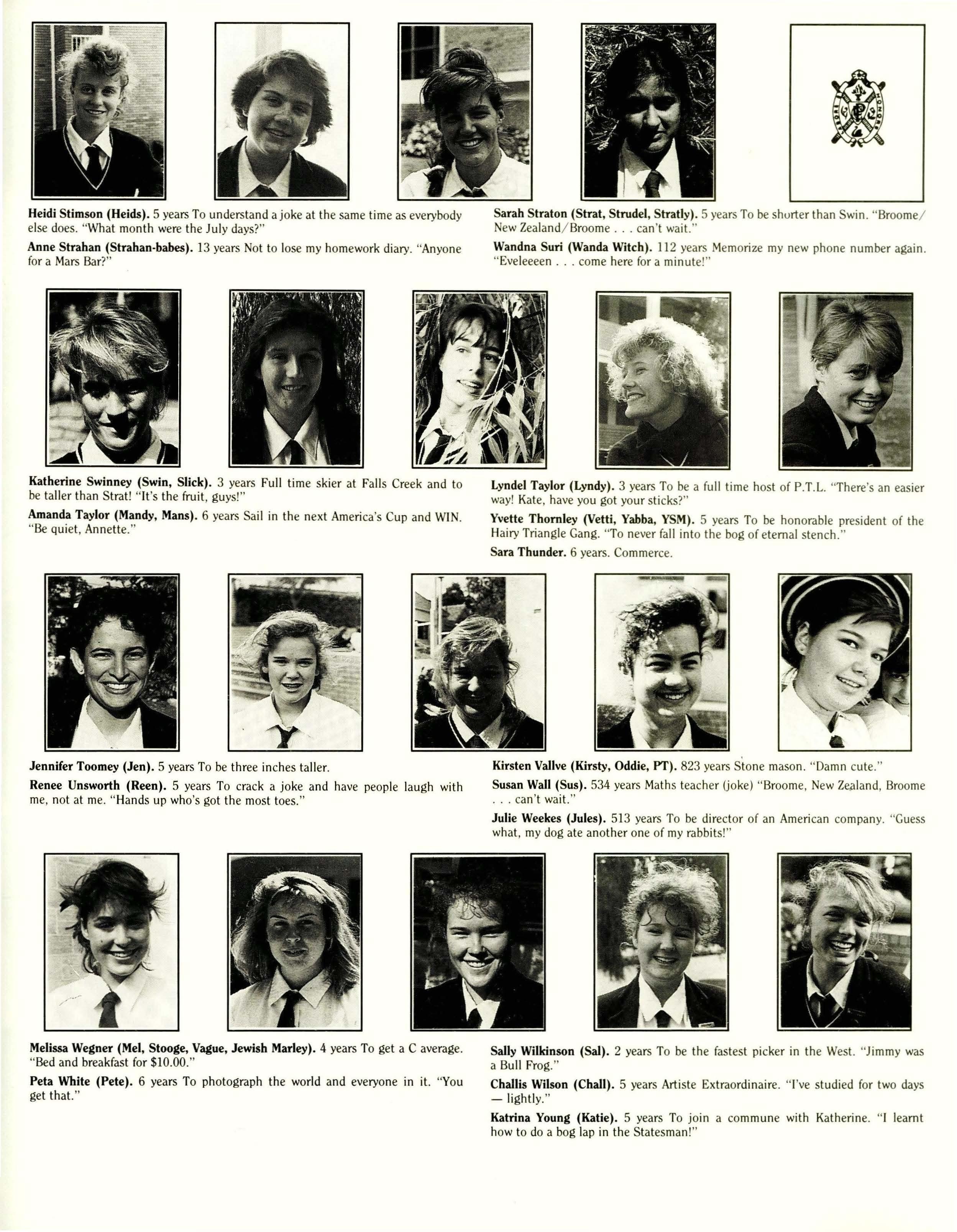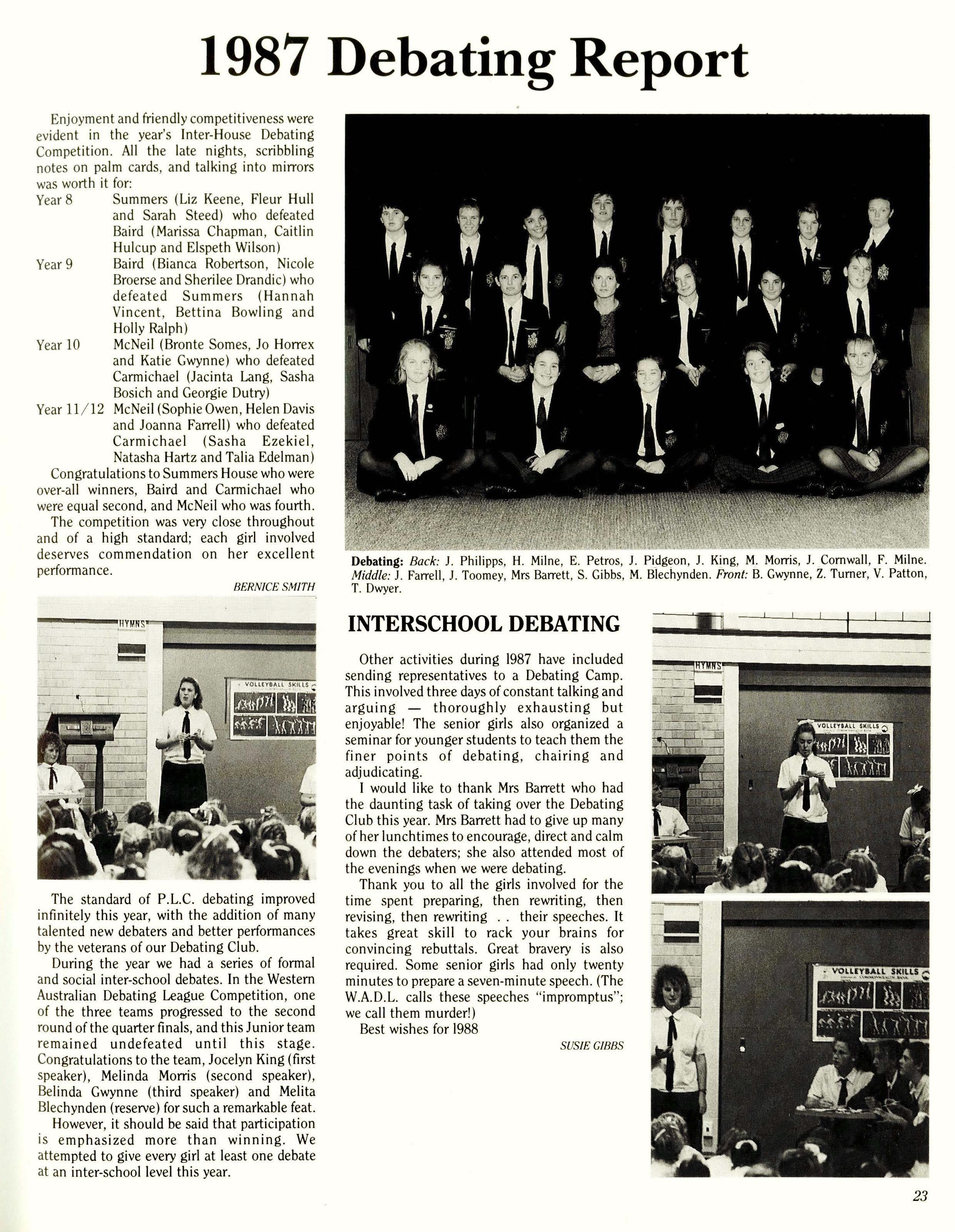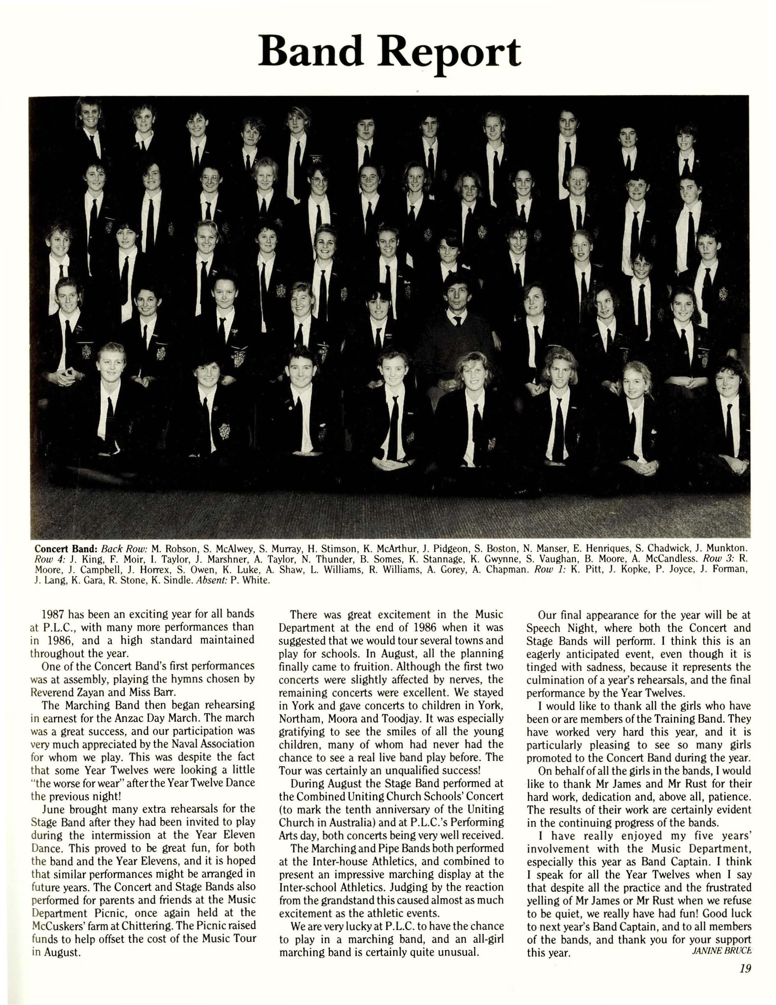 How quickly 1987 has passed! It seems impossible that the Year Twelves are nearing the end of their schooling forever and that soon the other prefects and I will be out of a job. At the be'ginning of first term the new officials eagerly anticipated a year full of revolutionary activity which would transform the School. (Into what, we hadn't decided). Soon, however, it became clear that P.L.C. was already quite acceptable and that many of the ideas we presented in Student Council had been explored, implemented or rejected in previous years.
