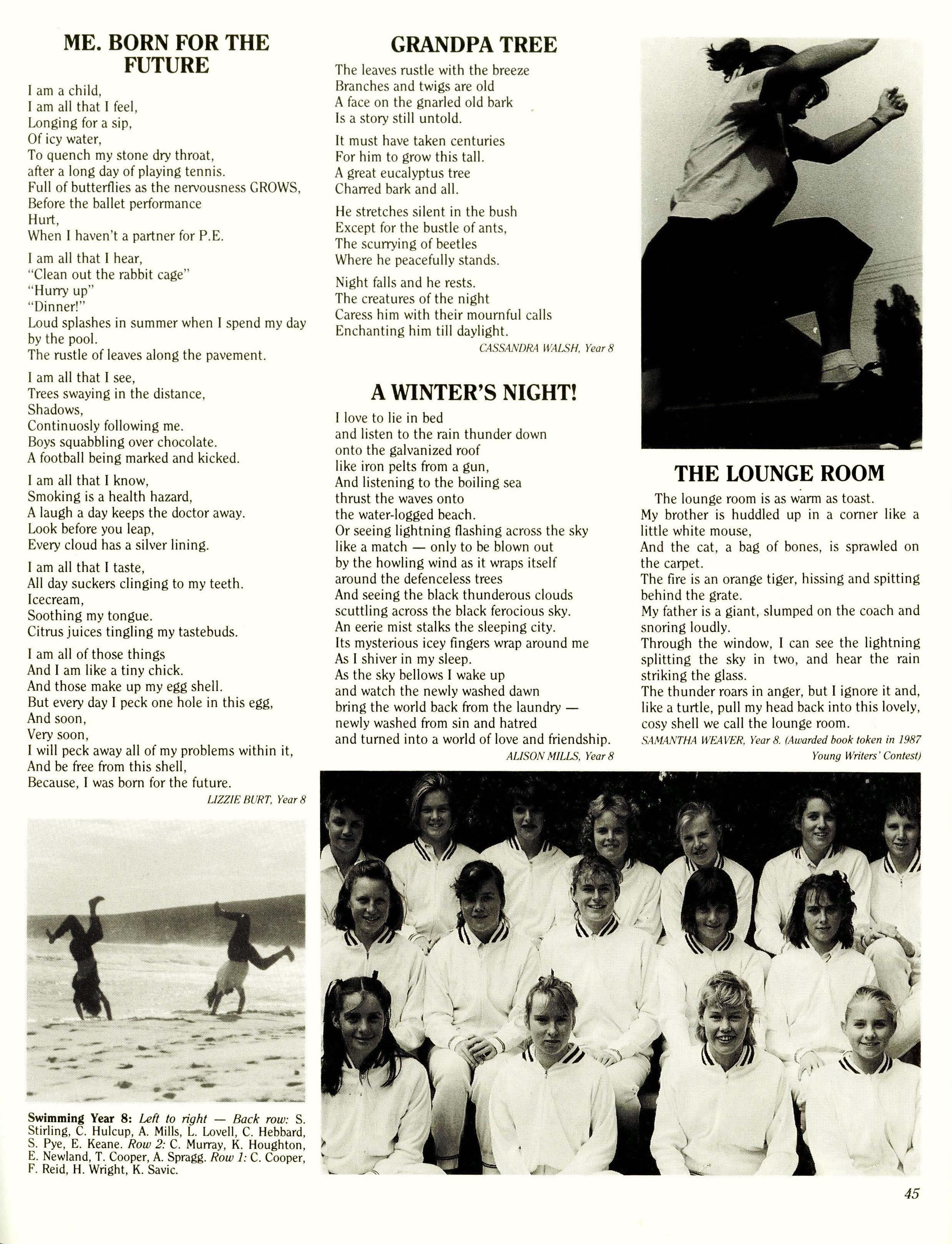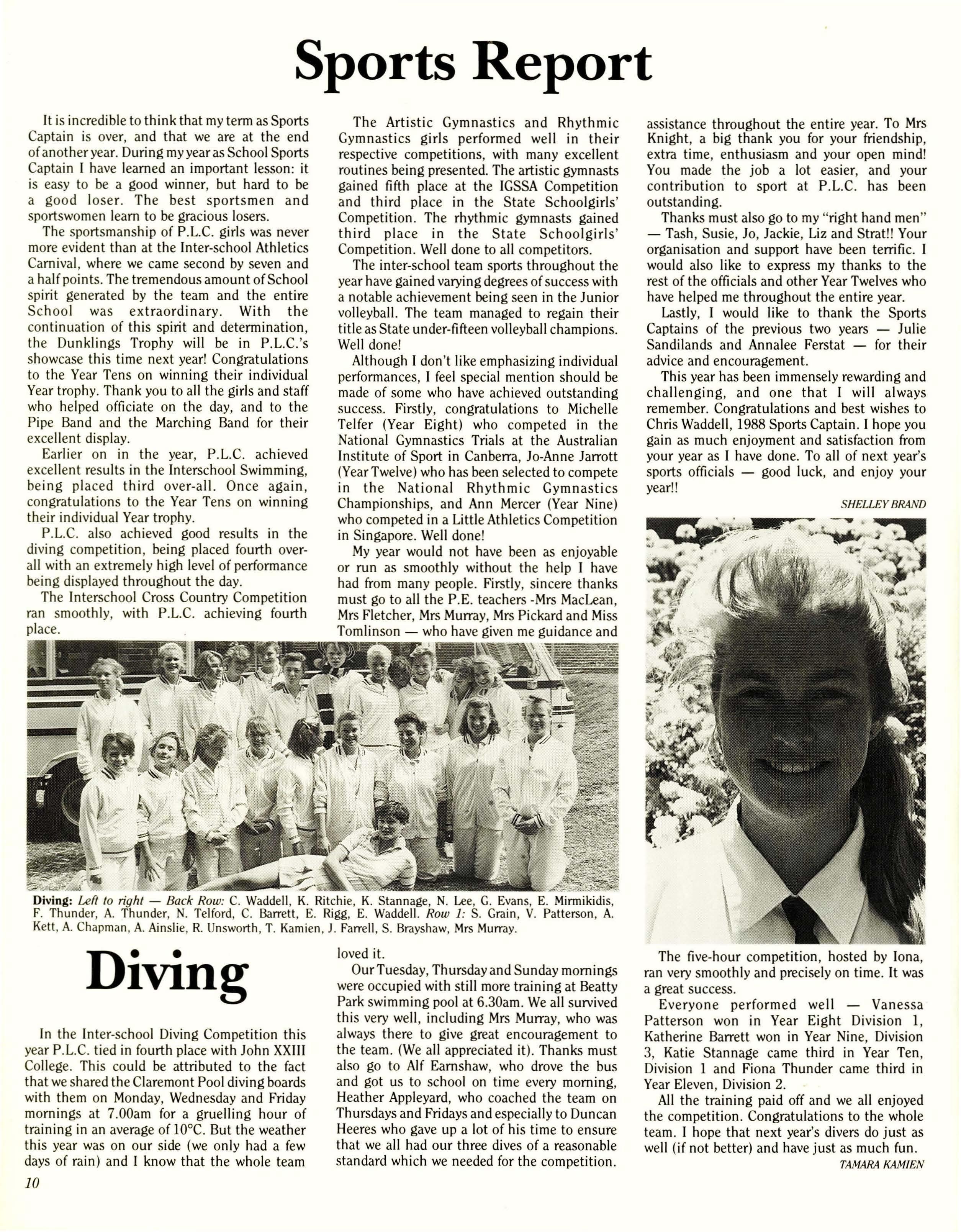 In the Inter-school Diving Competition this year P.L.C. tied in fourth place with John XXIII College. This could be attributed to the fact that we shared the Claremont Pool diving boards with them on Monday, Wednesday and Friday mornings at 7.00am for a gruelling hour of training in an average of lOoC. But the weather this year was on our side (we only had a few days of rain) and I know that the whole team