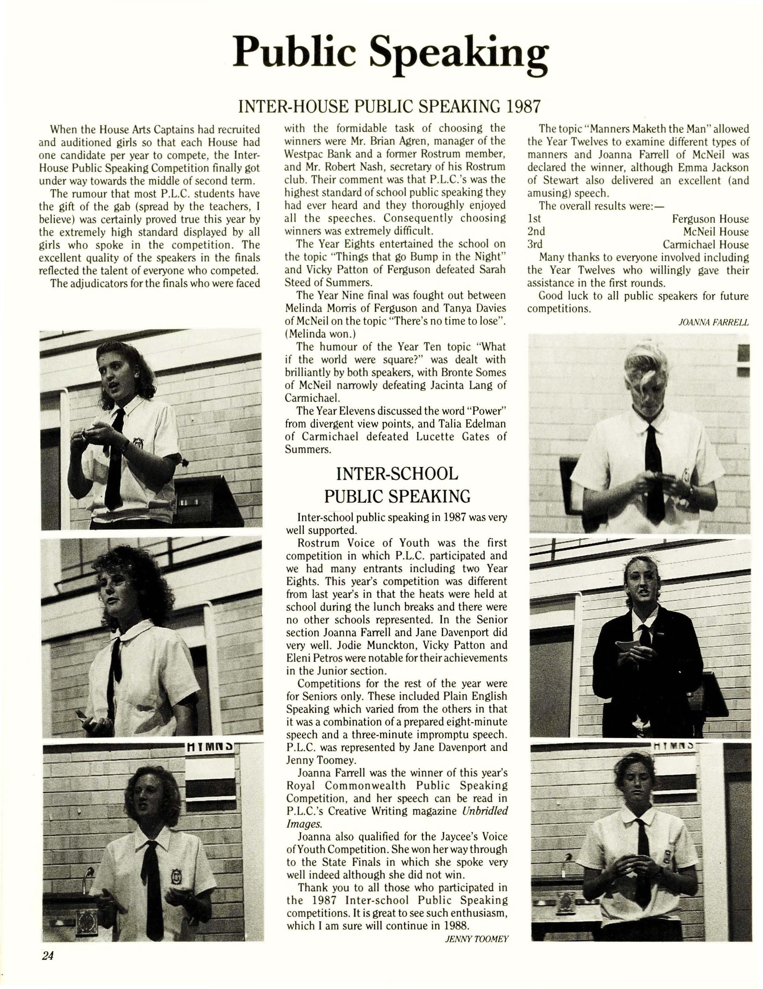 Miss Grant was followed by the 1986 Head Prefect, Fiona McAlwey, who made her farewell address to the School.Fiona spoke about attitudes of apathy and co-operation in a very thought-provoking way.