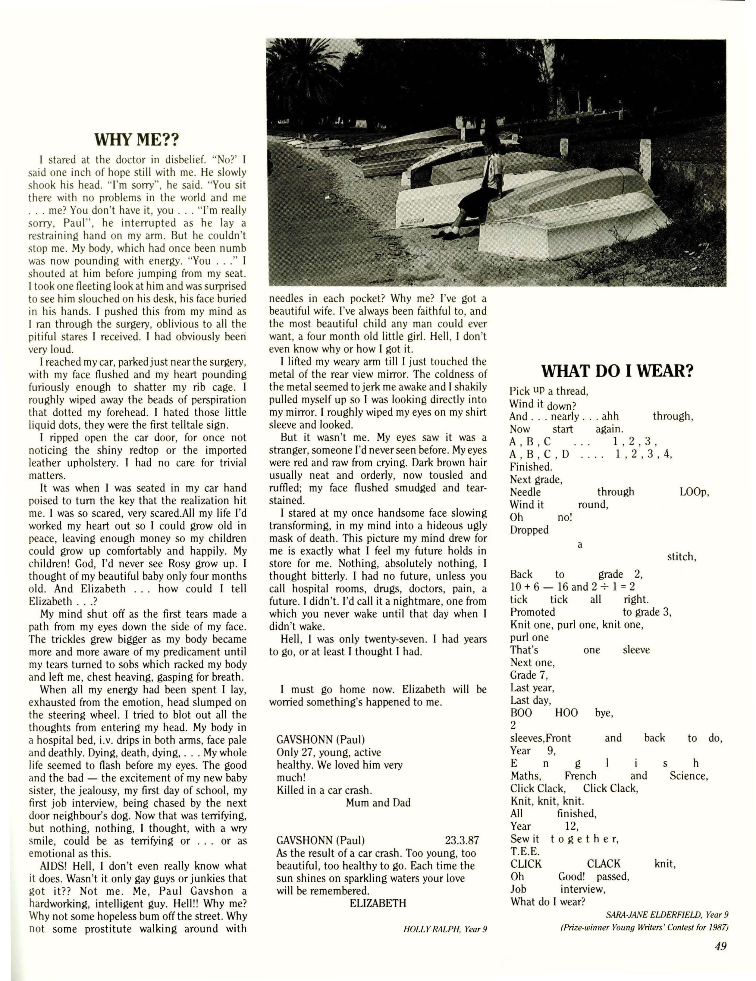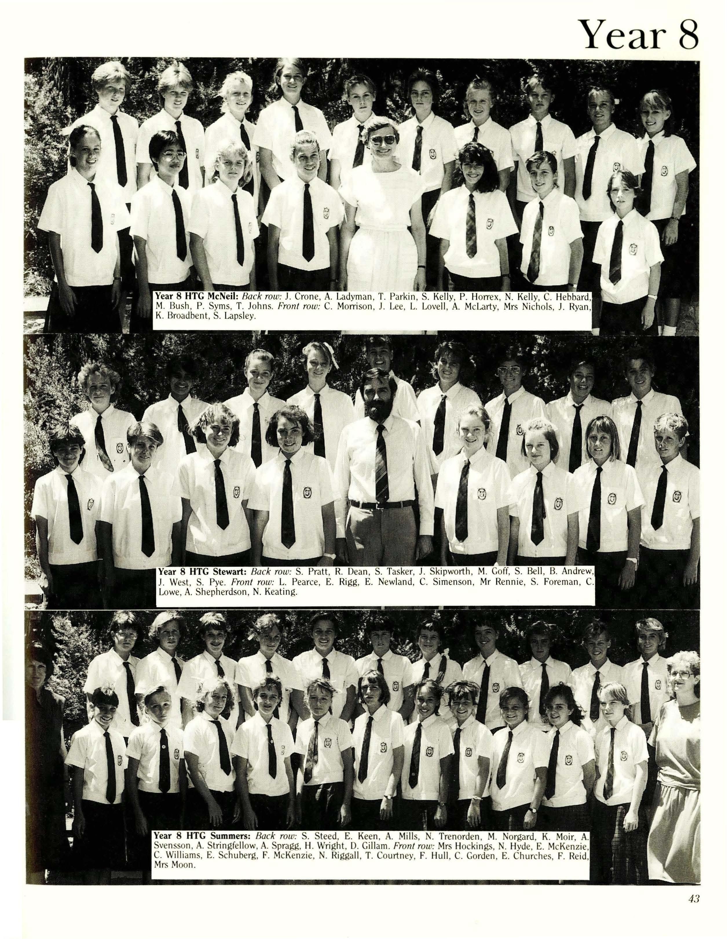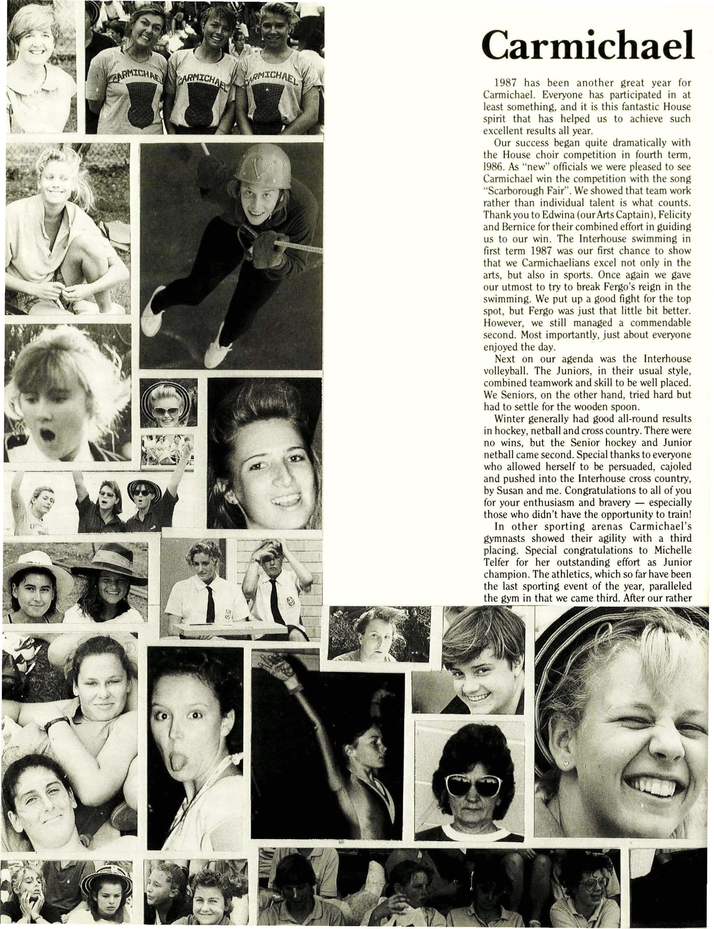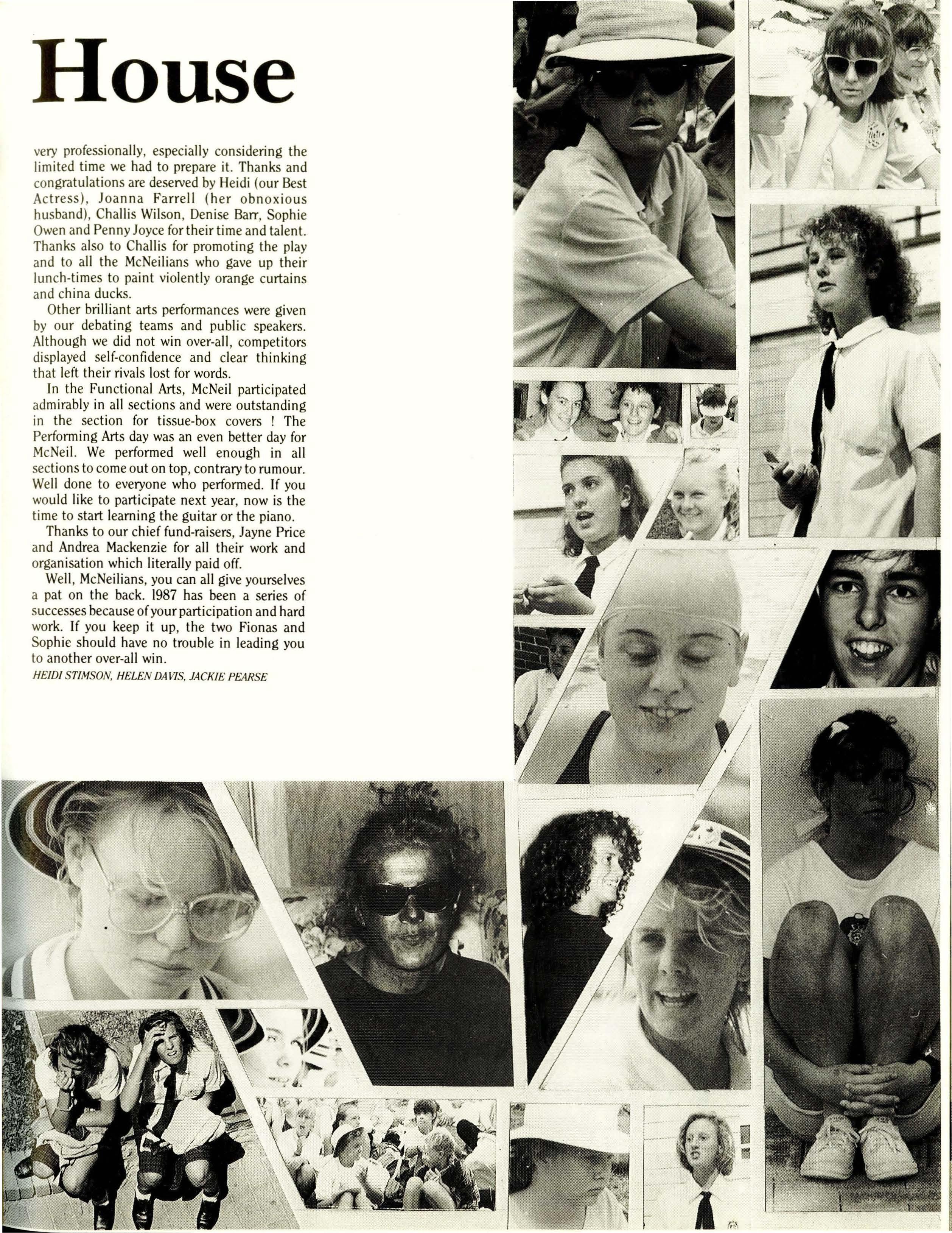 Among the more important issues pushed to the front of the agenda for immediate attention in February were the choice of band for the Year Twelve dance, and the design of the "leavers' jumpers". The latter turned out to be quite controversial, but finally it was decided that in 1987 windcheaters would replace the rugby jumper favoured in previous years. Designed by Fleur Doonan and Pene Brown, these windcheaters are comfortable to wear and look terrific.