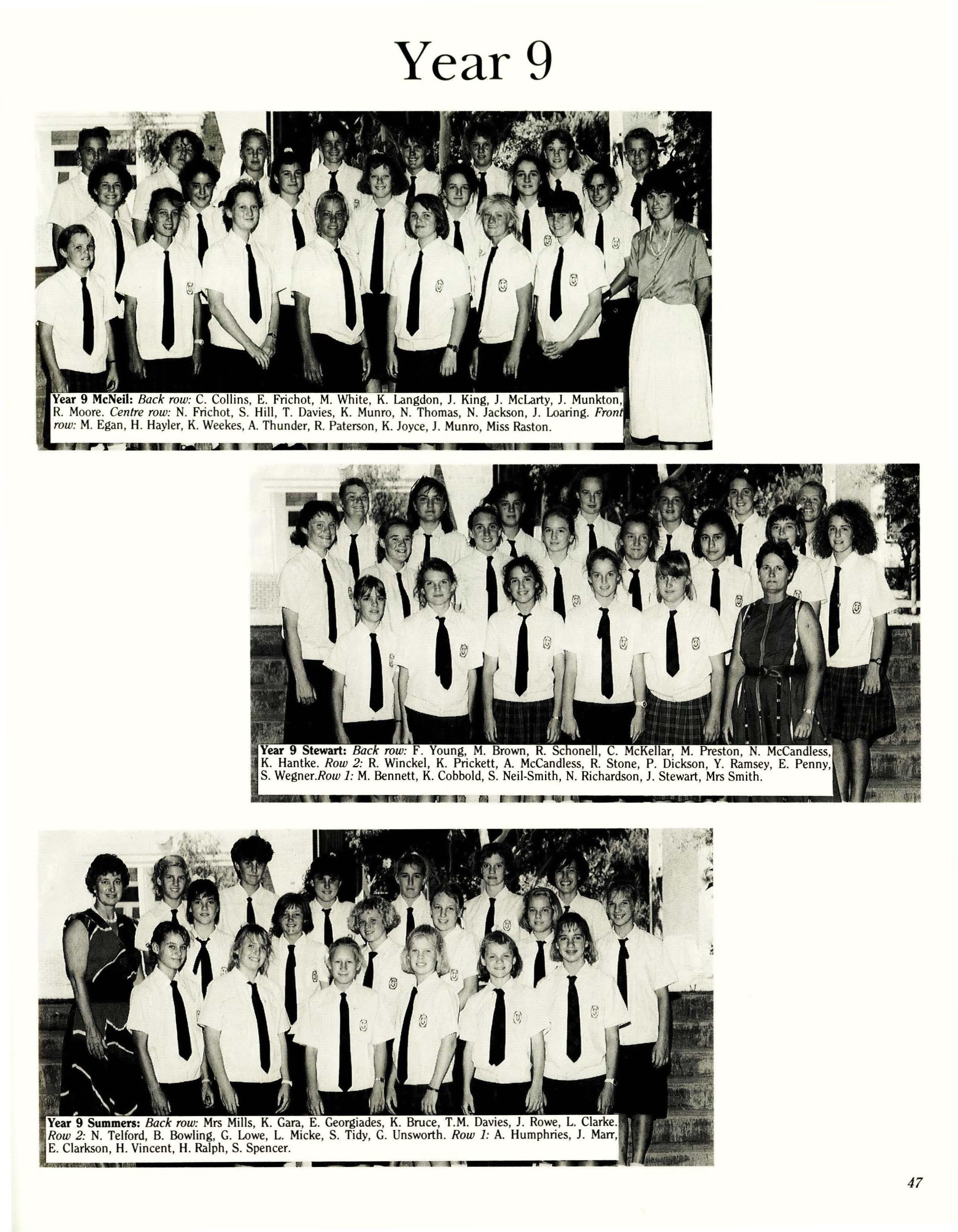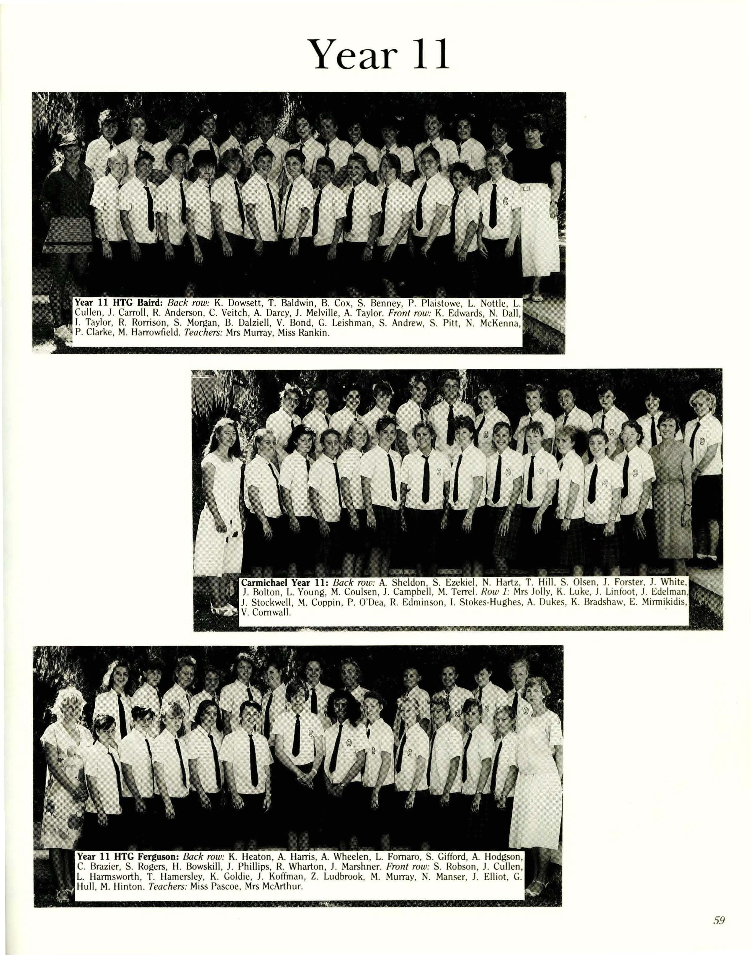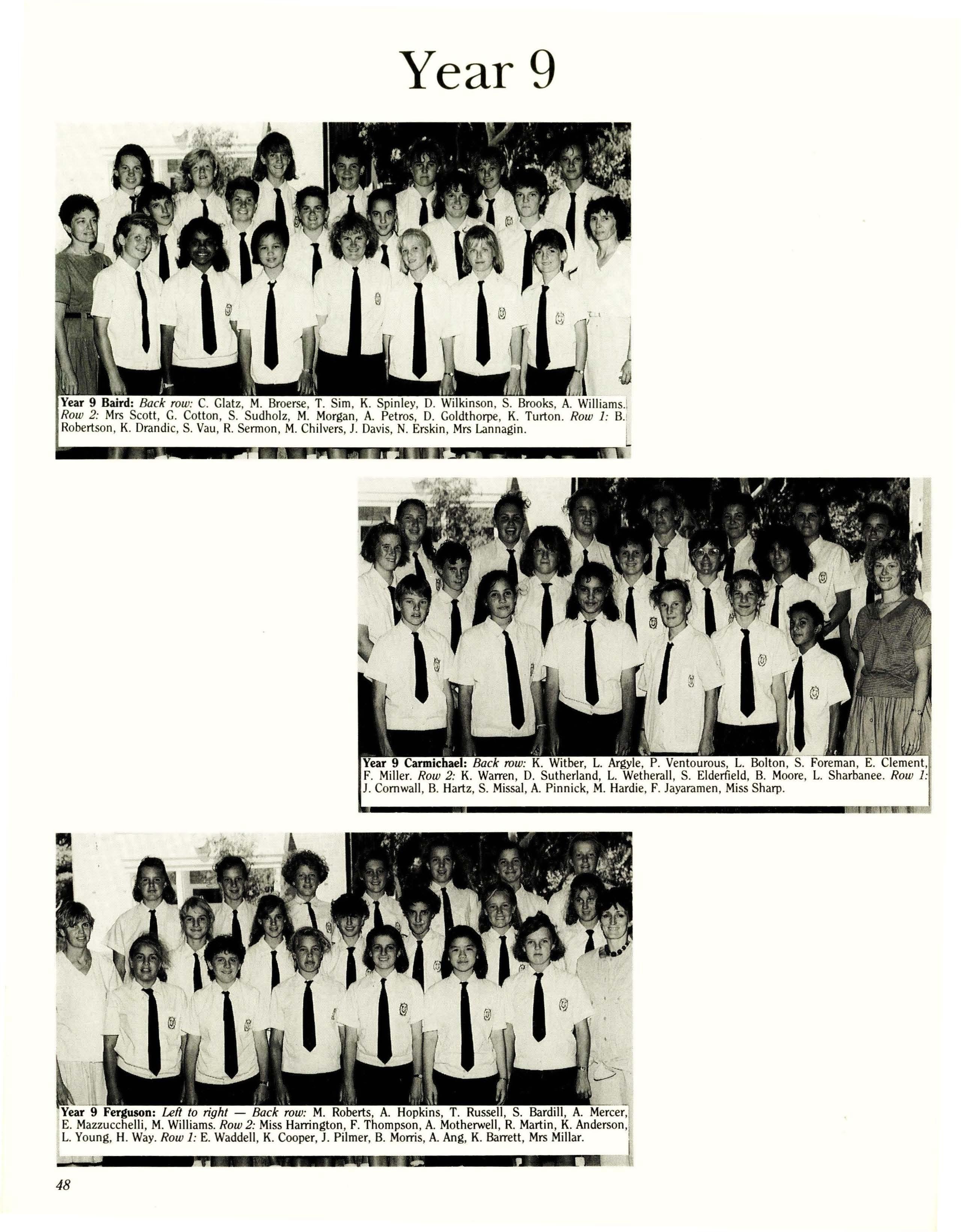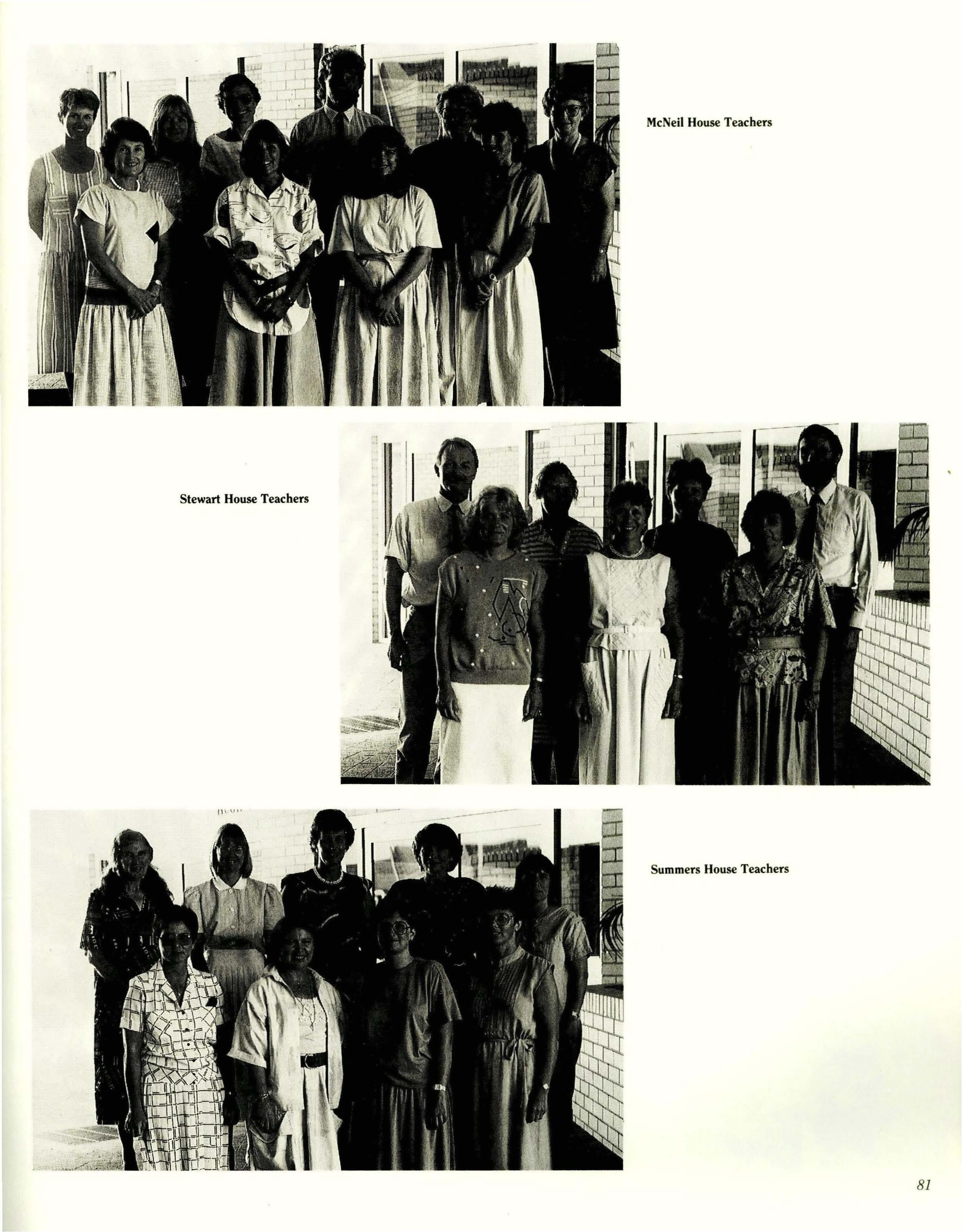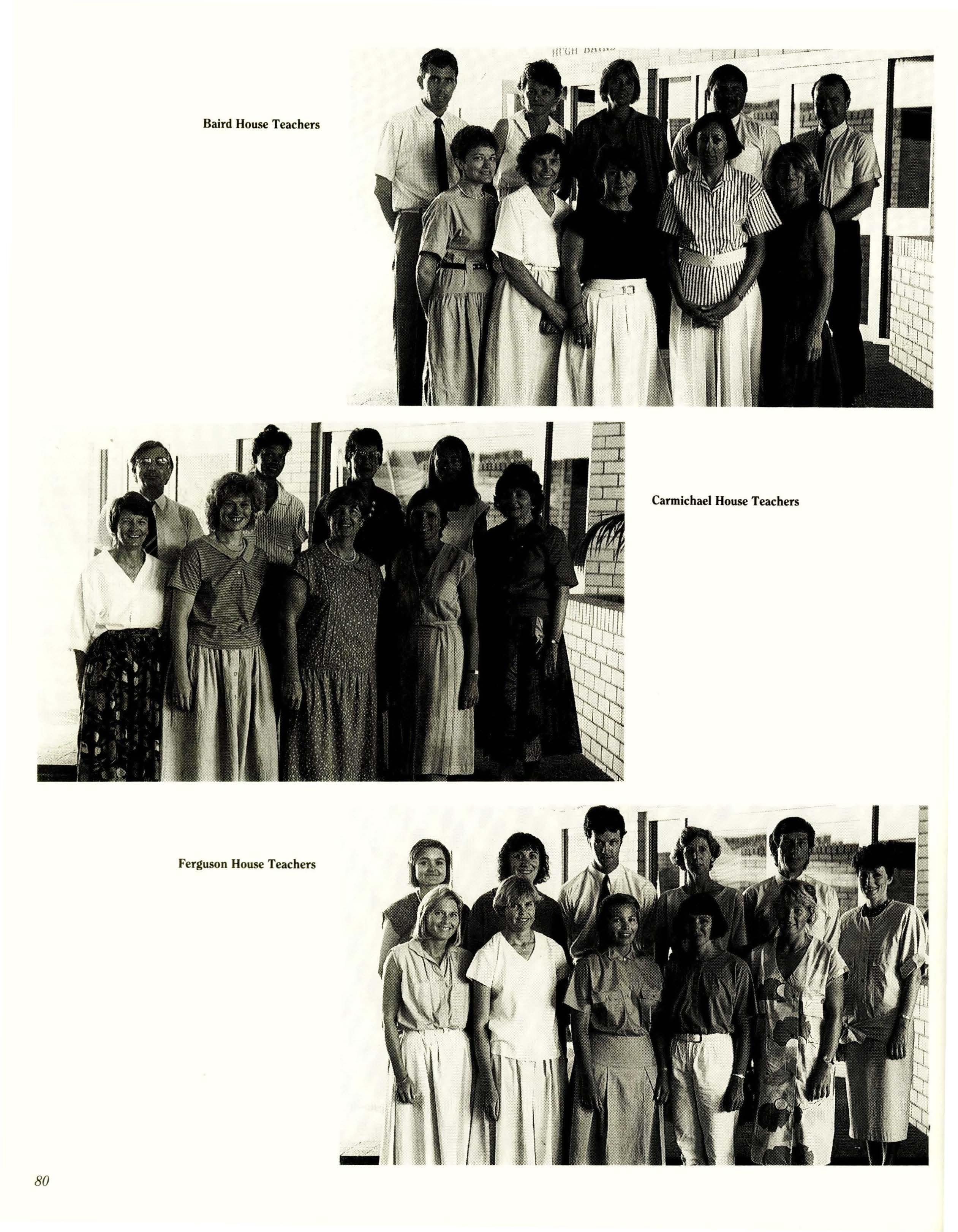 Baird - Miss P. Wright, B.A., Dip.Ed. Carmichael- Mrs. S. Jarvis, A.C.I.A., Cordon Bleu. Ferguson - Mrs. J. MacLean, Dip.Teach. McNeil- Mrs. J. McMahon, Teach.Cert., Grad.Dip. (Media) Stewart - Mrs. H. Heptinstall, B.Sc. (Hons), Cert.Ed., Dip.Lib.Stud.
