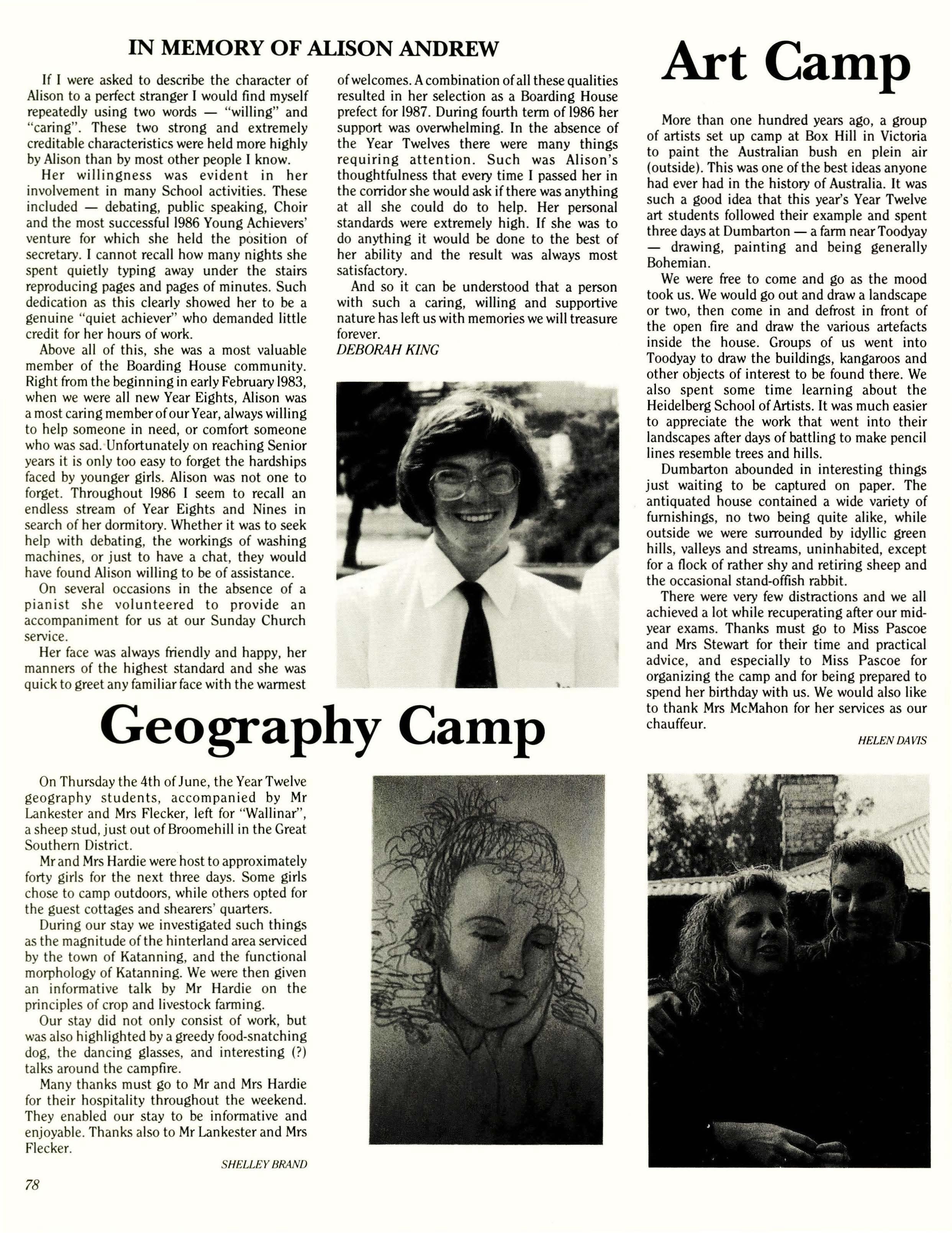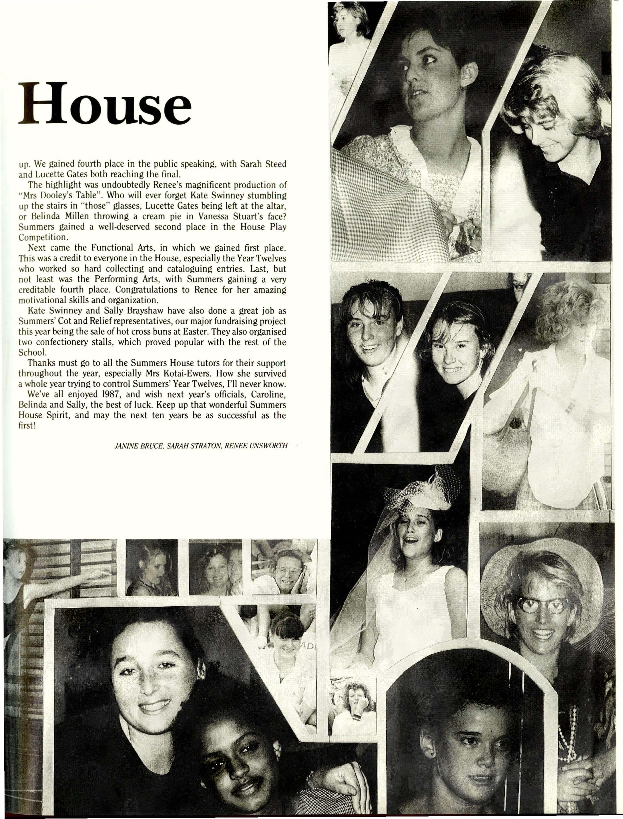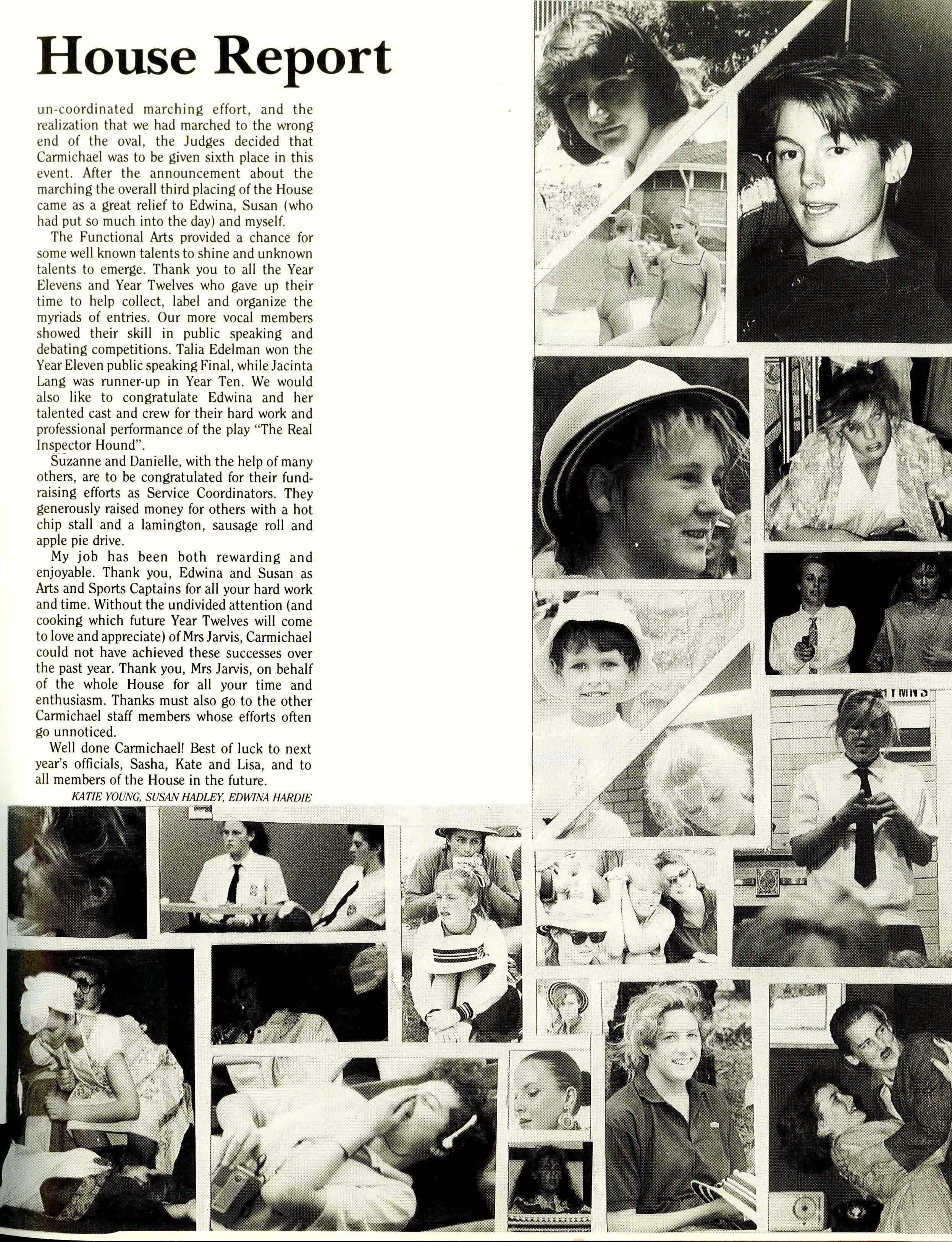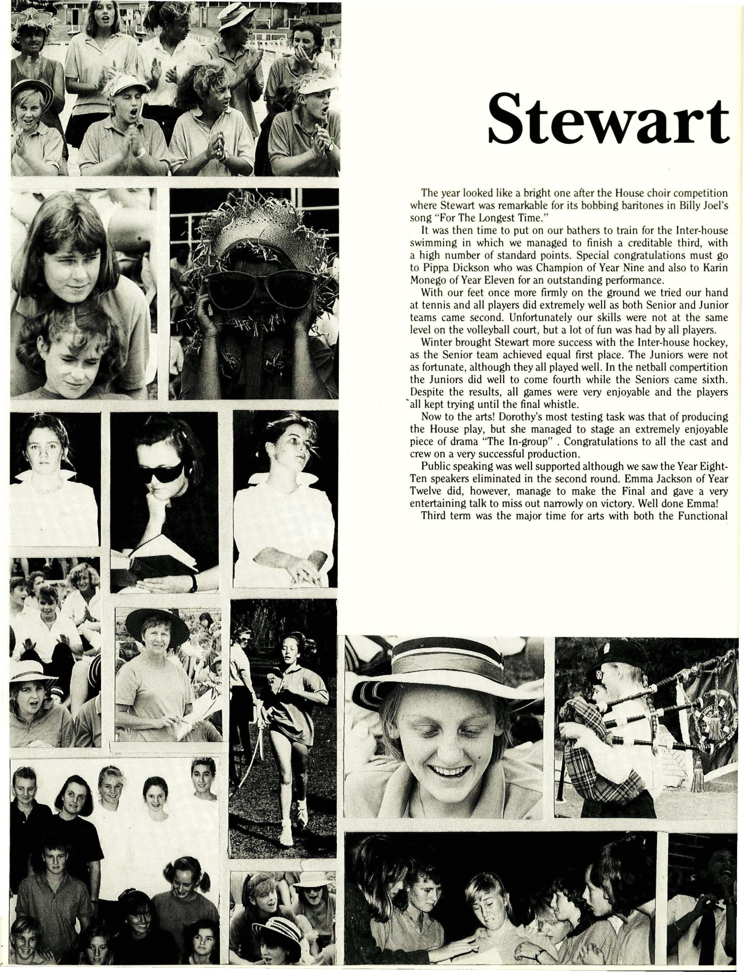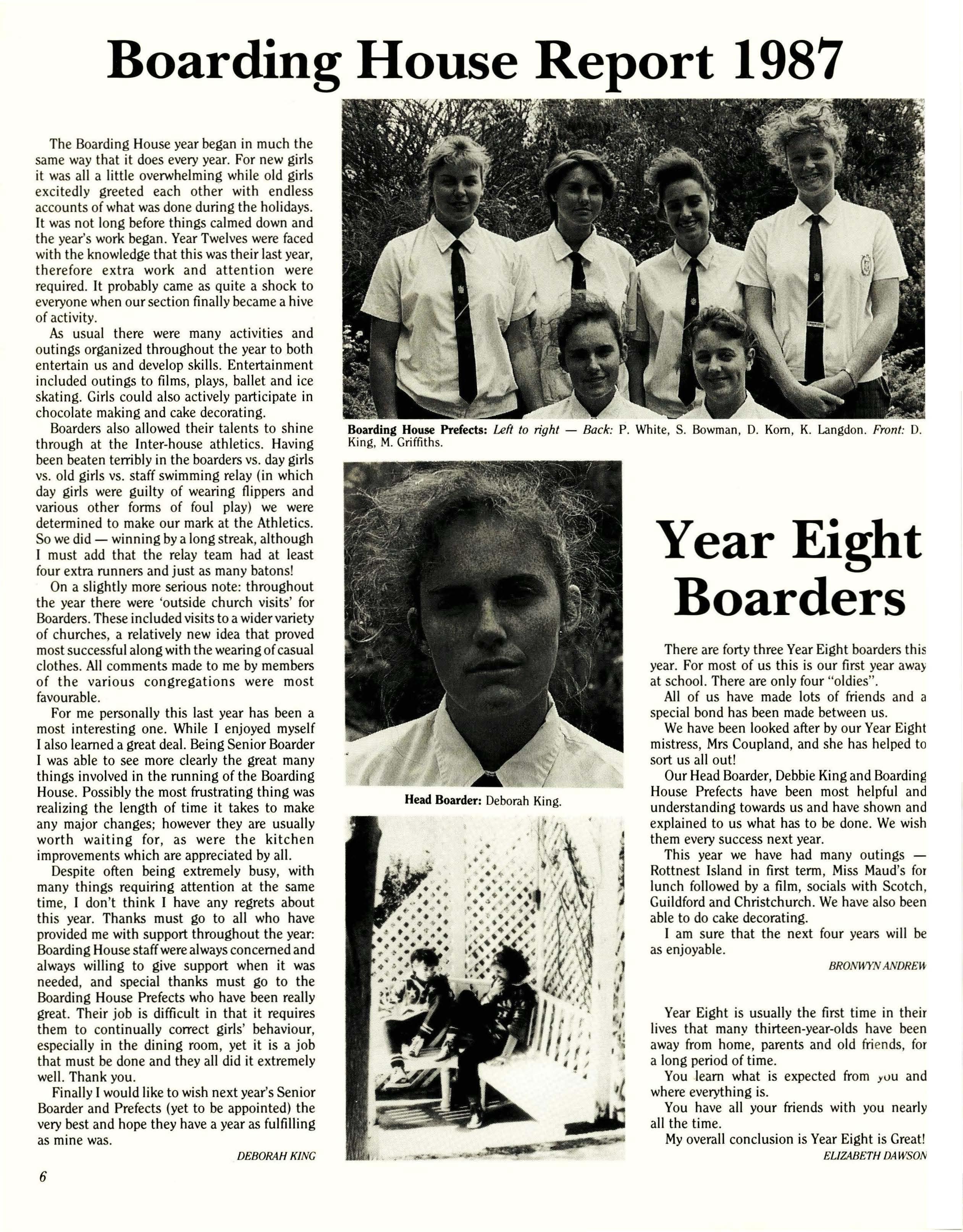 Despite often being extremely busy, with many things requiring attention at the same time, I don't think I have any regrets about this year. Thanks must go to all who have provided me with support throughout the year: Boarding House staff were always concerned and always willing to give support when it was needed, and special thanks must go to the Boarding House Prefects who have been really great. Their job is difficult in that it requires them to continually correct girls' behaviour, especially in the dining room, yet it is a job that must be done and they all did it extremely well. Thank you.