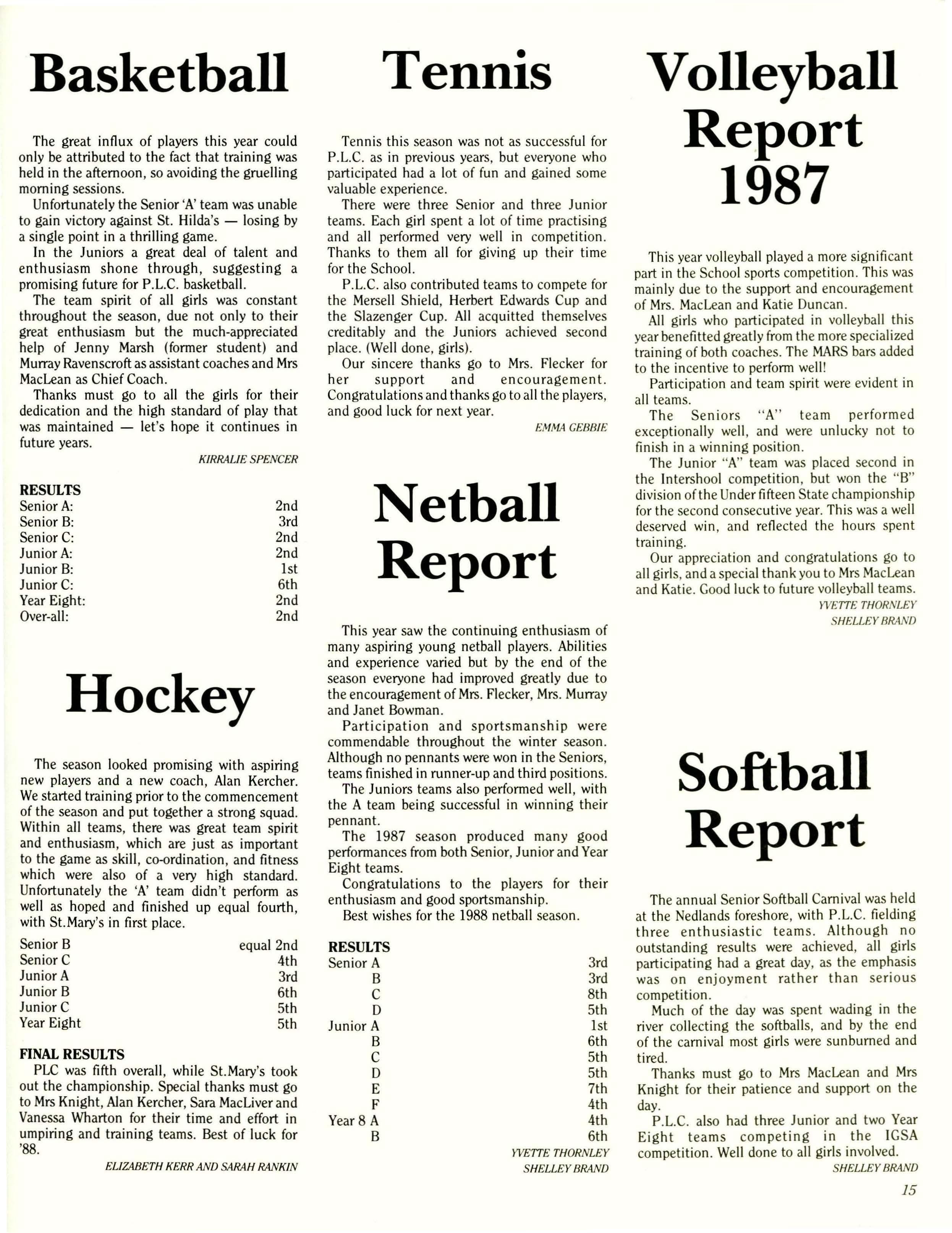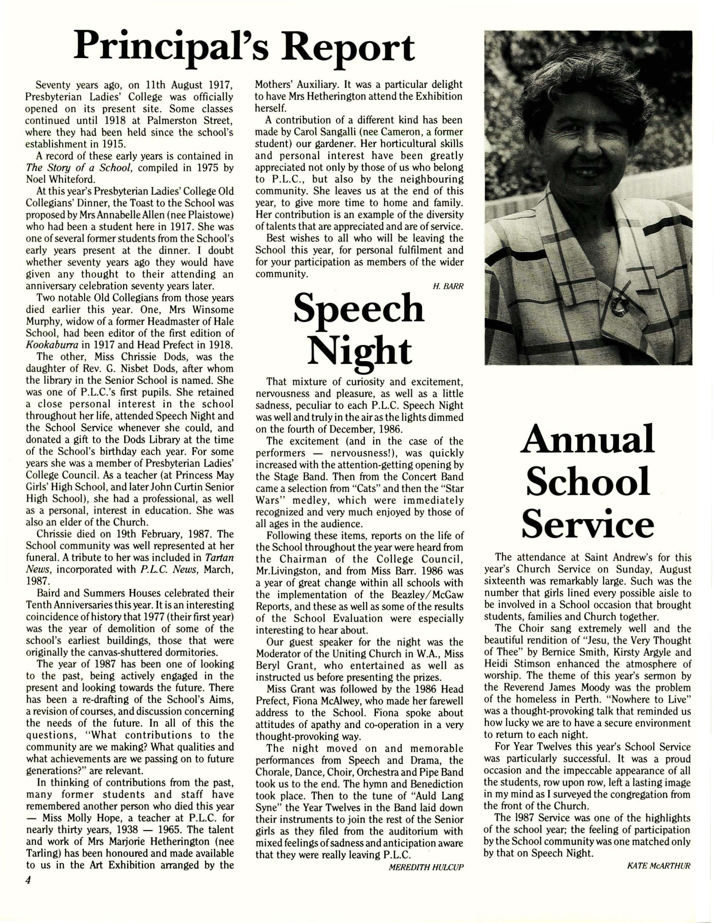 Following these items, reports on the life of the School throughout the year were heard from the Chairman of the College Council, Mr.Livingston, and from Miss Barr. 1986 was a year of great change within all schools with the implementation of the Beazley/McGaw Reports, and these as well as some of the results of the School Evaluation were especially interesting to hear about.
