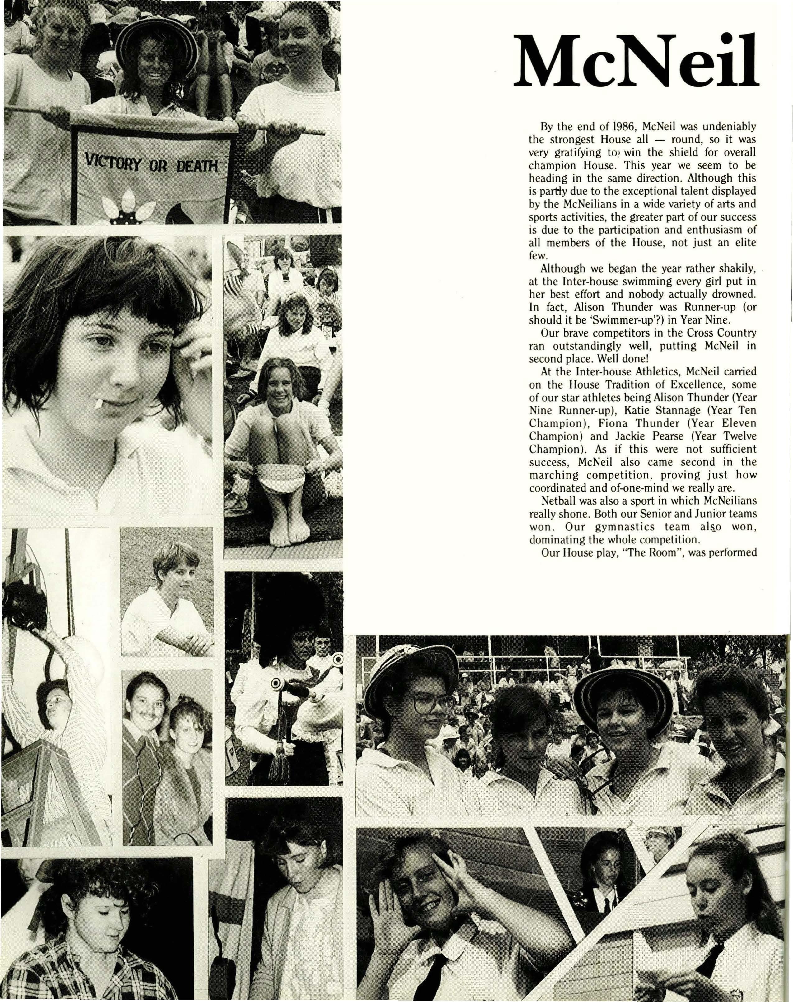 Boarders also allowed their talents to shine through at the Inter-house athletics. Having been beaten terribly in the boarders vs. day girls vs. old girls vs. staff swimming relay (in which day girls were guilty of wearing flippers and various other forms of foul play) we were determined to make our mark at the Athletics. So we did - winning by a long streak, although I must add that the relay team had at least four extra runners and just as many batons!