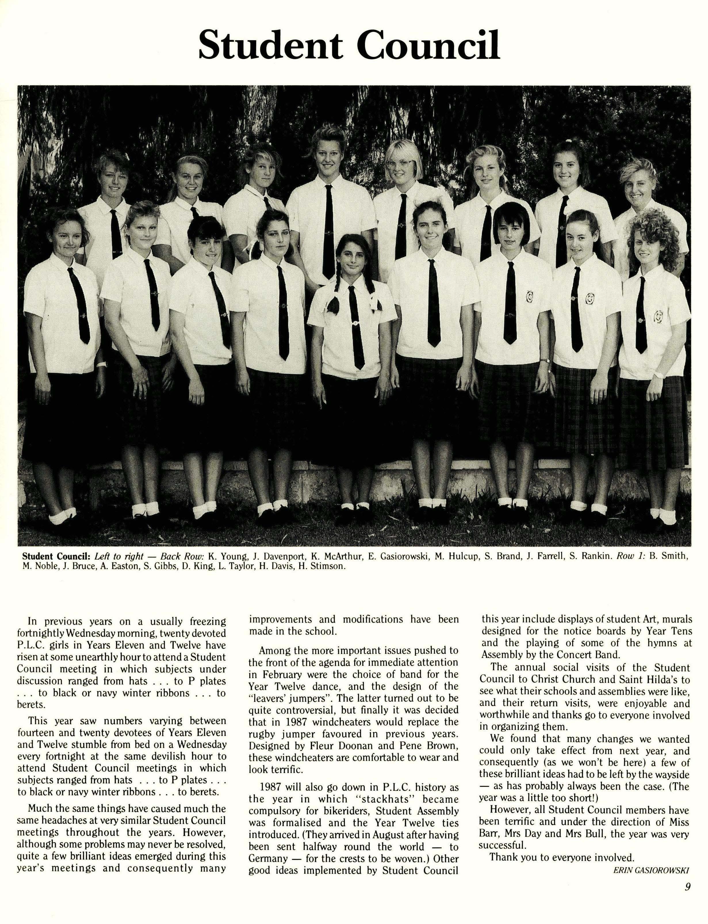 In previous years on a usually freezing fortnightly Wednesday morning, twenty devoted P.L.C. girls in Years Eleven and Twelve have risen at some unearthly hour to attend a Student Council meeting in which subjects under discussion ranged from hats to P plates to black or navy winter ribbons to berets.