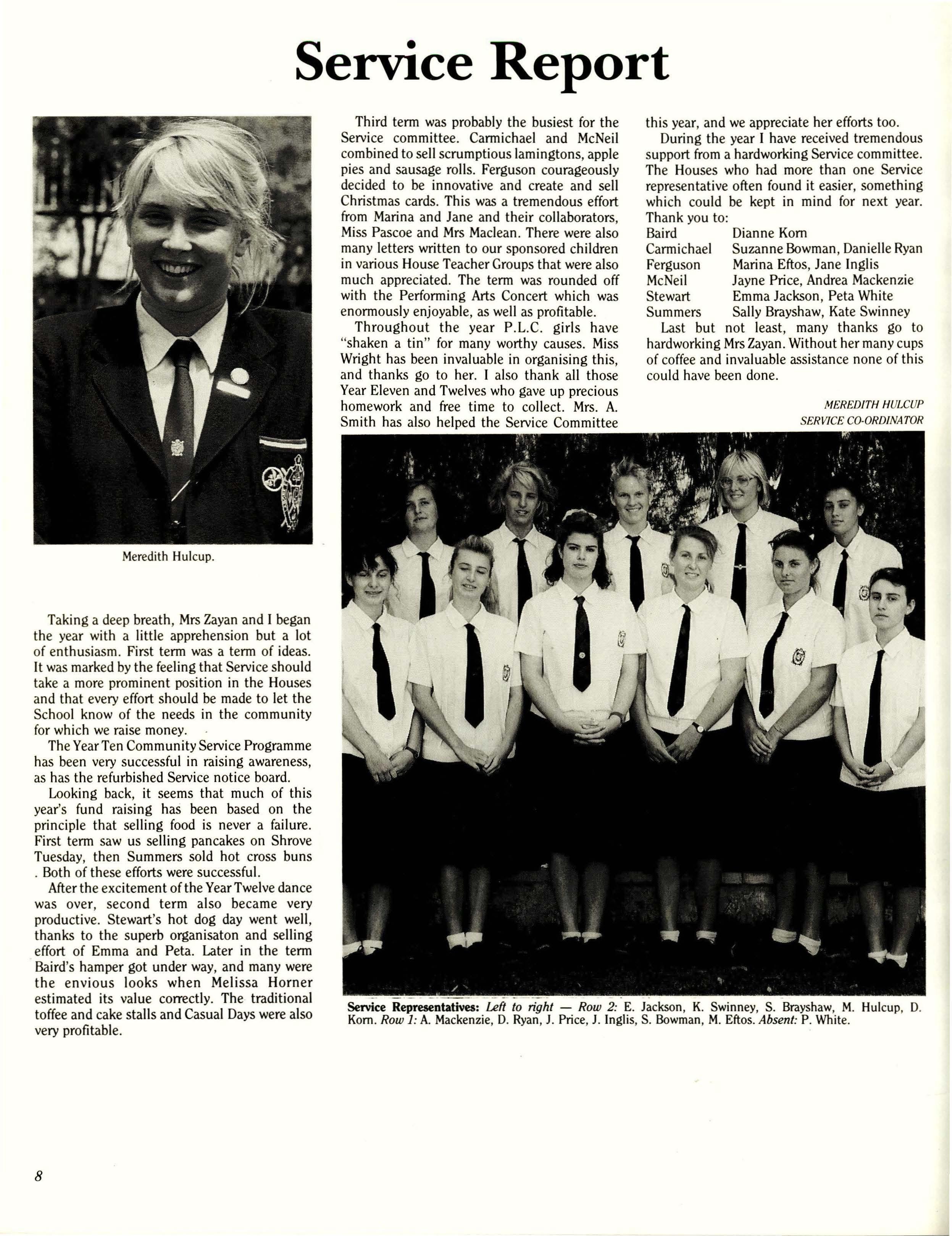 this year, and we appreciate her effortstoo. During the year I have received tremendous support from a hardworking Service committee. The Houses who had more than one Service representative often found it easier, something which could be kept in mind for next year.