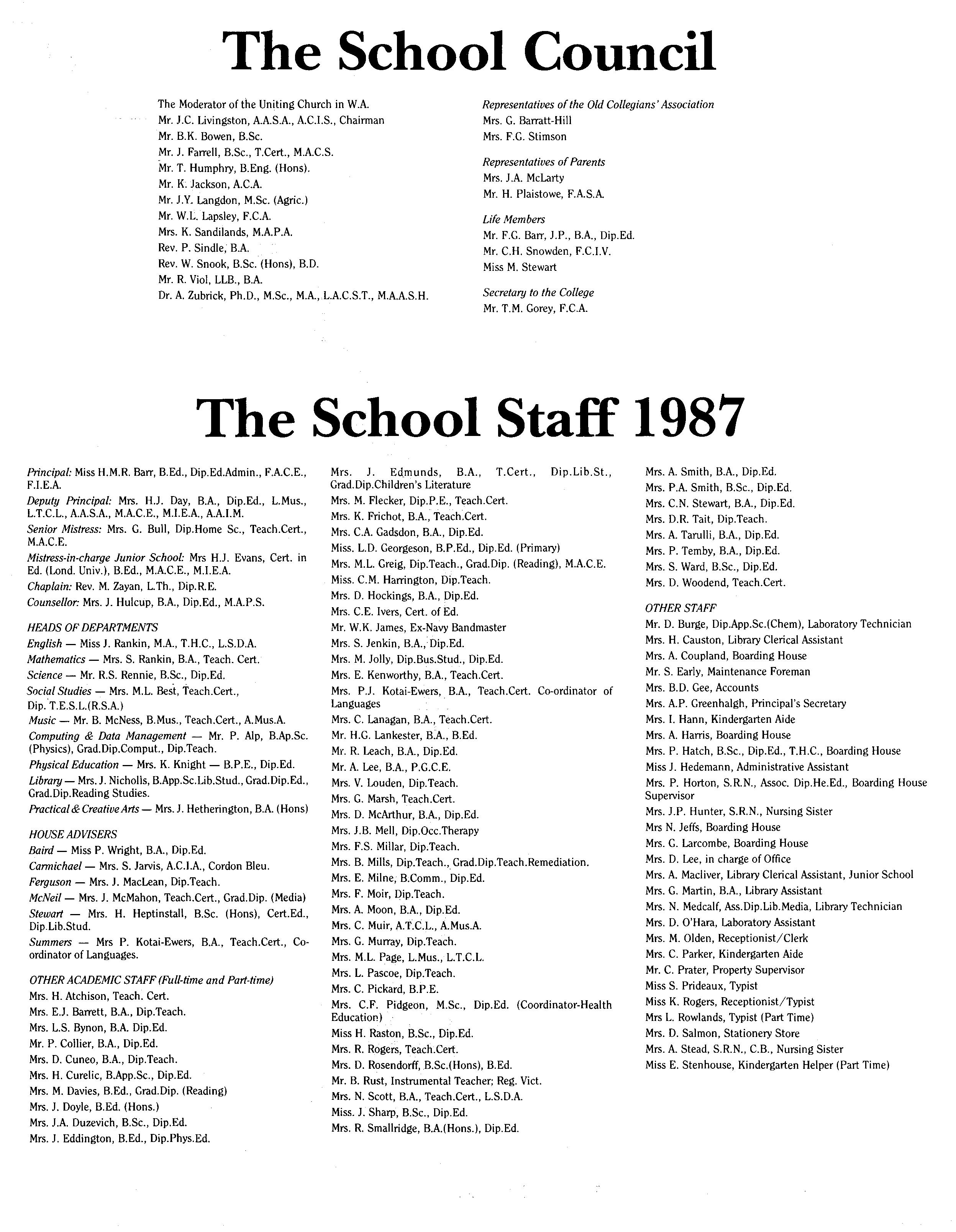 Principal: Miss H.M.R. Barr, B.Ed., Dip.Ed.Admin., F.A.C.E., F.I.E.A.
