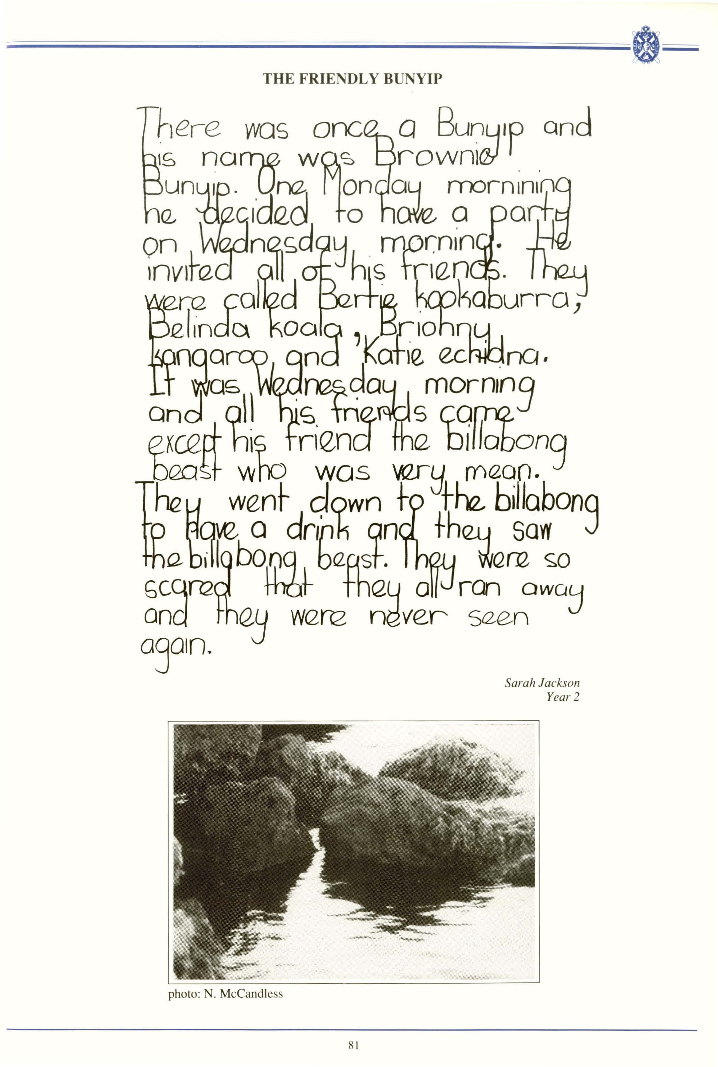 Quickly Mum struck it again, but this time just behind the head which paralysed it completely. She struck it a few more times just to make sure it was dead. The next day I took it to school in an icecream container, it just fitted. It would have to have been at least one metre long. By the time I got it to school yellow stripes showed quite clearly around the body of the snake, so we figured it must have been a Tiger snake. That day, when I was at school, Mum found some little, pink, baby snakes in our garden. She killed them with the spade and went on gardening until I got home. We went inside and had a cup of tea. Mum mentioned the baby snakes and we guessed that the snake we killed must have been their mother. After that we found no more snakes around the house.