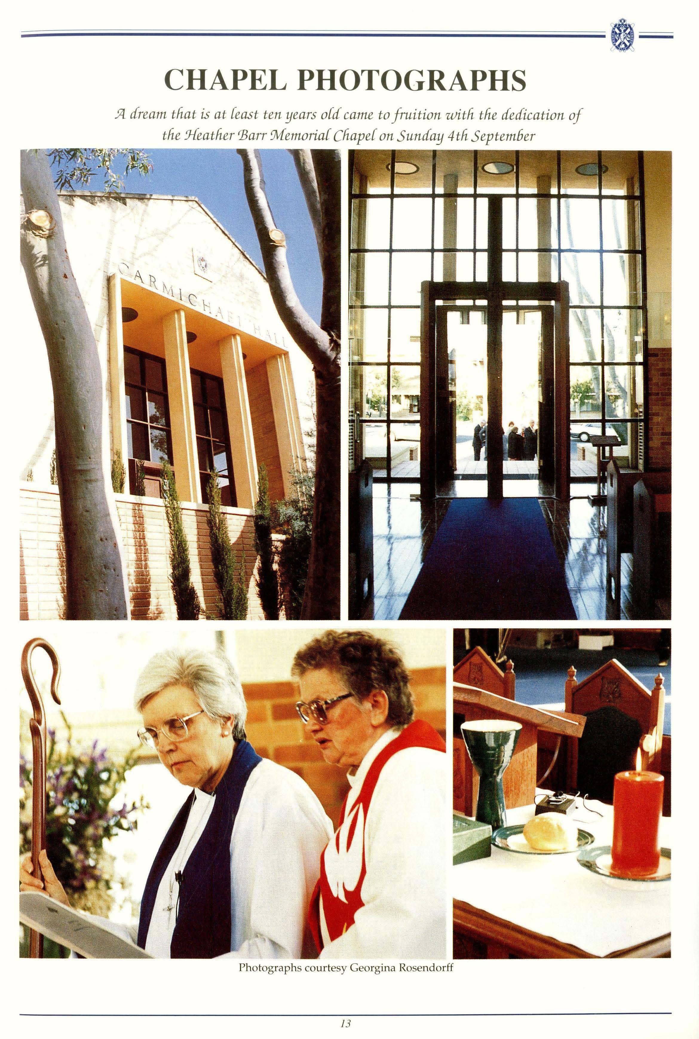 The Heather Barr Memorial Chapel Completion of our Chapel and Chapel garden during this year has seen the physical focus of our commitment to Christian ideals being central to our campus. Already it has made a difference to the students and staff to have an appropriate place to worship, to have a quiet, beautiful location to meditate, to think, and to dream. Heather Barr was a fine, spiritual person, a real Christian who led by example. I know that she would very much have appreciated this Chapel and it is a fitting tribute to her memory.
